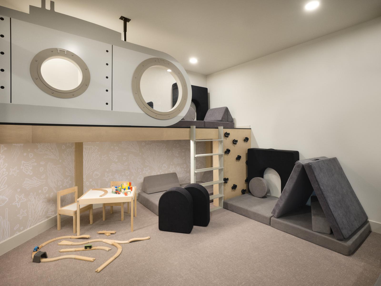 The project’s innovation lies in its ability to deliver a complete, adaptable rental experience. The guest suite — rare in rental developments — allows residents to comfortably host family and friends. Glass partitions visually connect spaces while maintaining functional separation, an advantage especially appreciated by families. The children’s playroom includes a custom, submarine-inspired play structure that aligns with the project’s visual language.