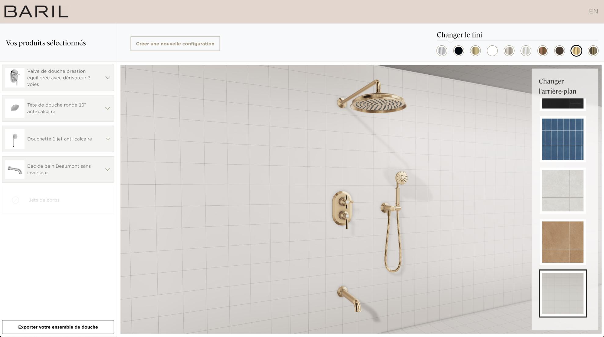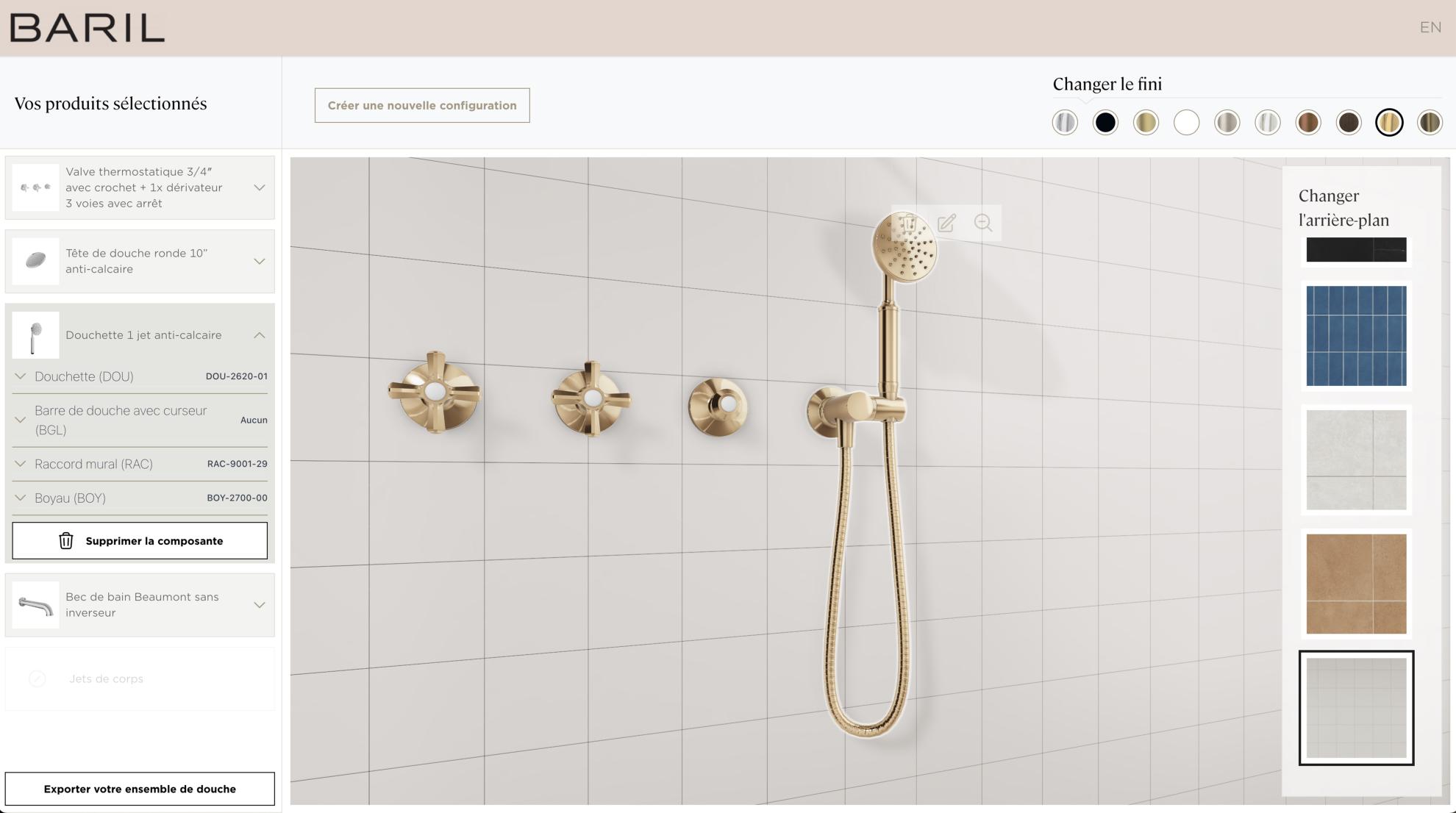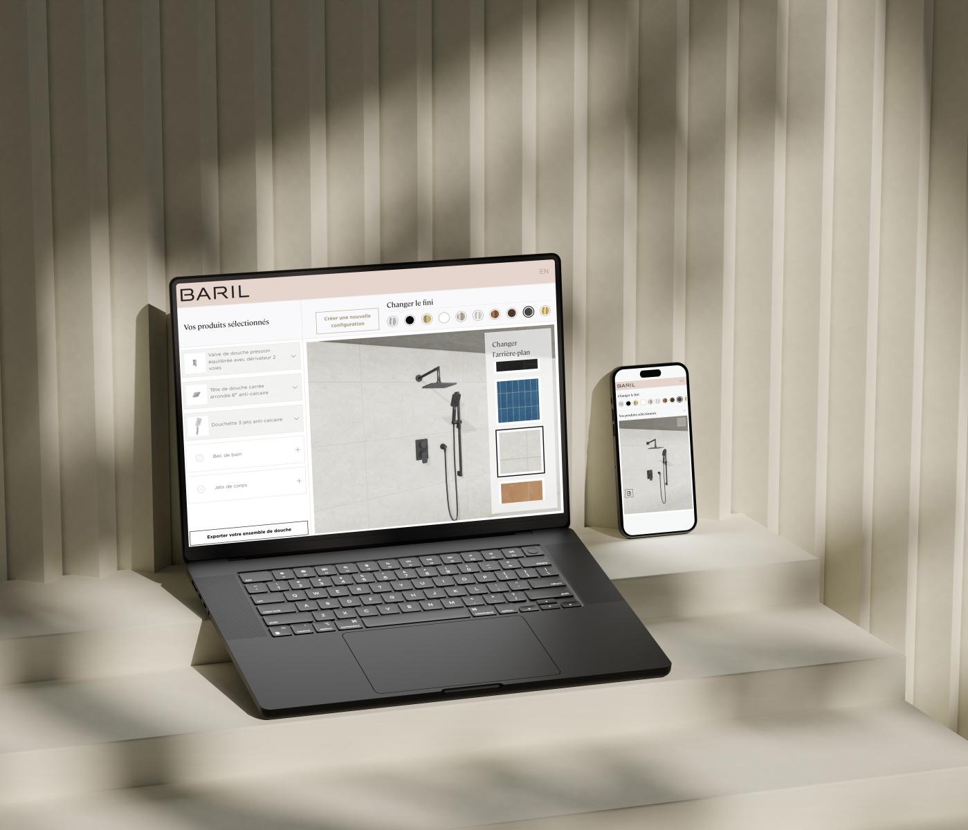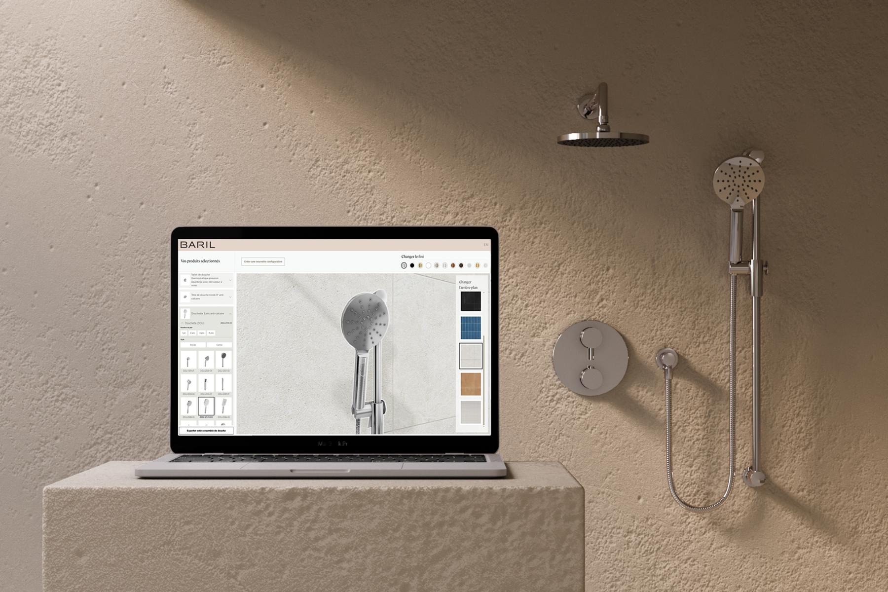 At BARIL, our ambition is to offer an intuitive and immersive personalization experience, enabling the design of custom shower kits with simplicity. It is with this objective in mind that we have developed an innovative virtual configurator, designed to assist consumers, designers, and retailers in visualizing and selecting elements perfectly suited to their needs and preferences.