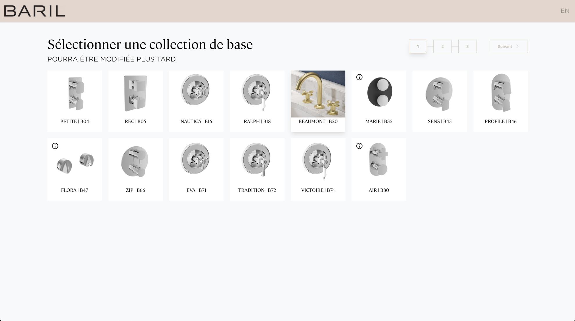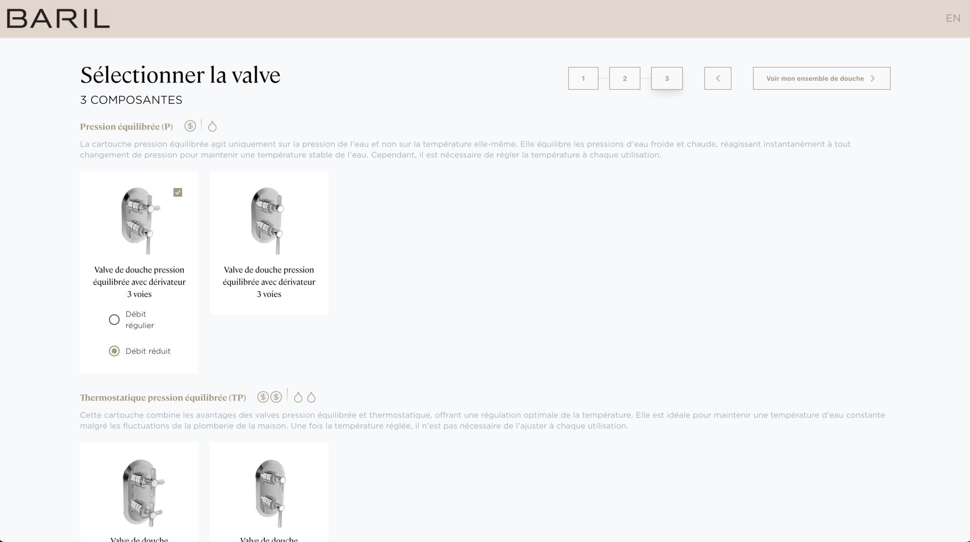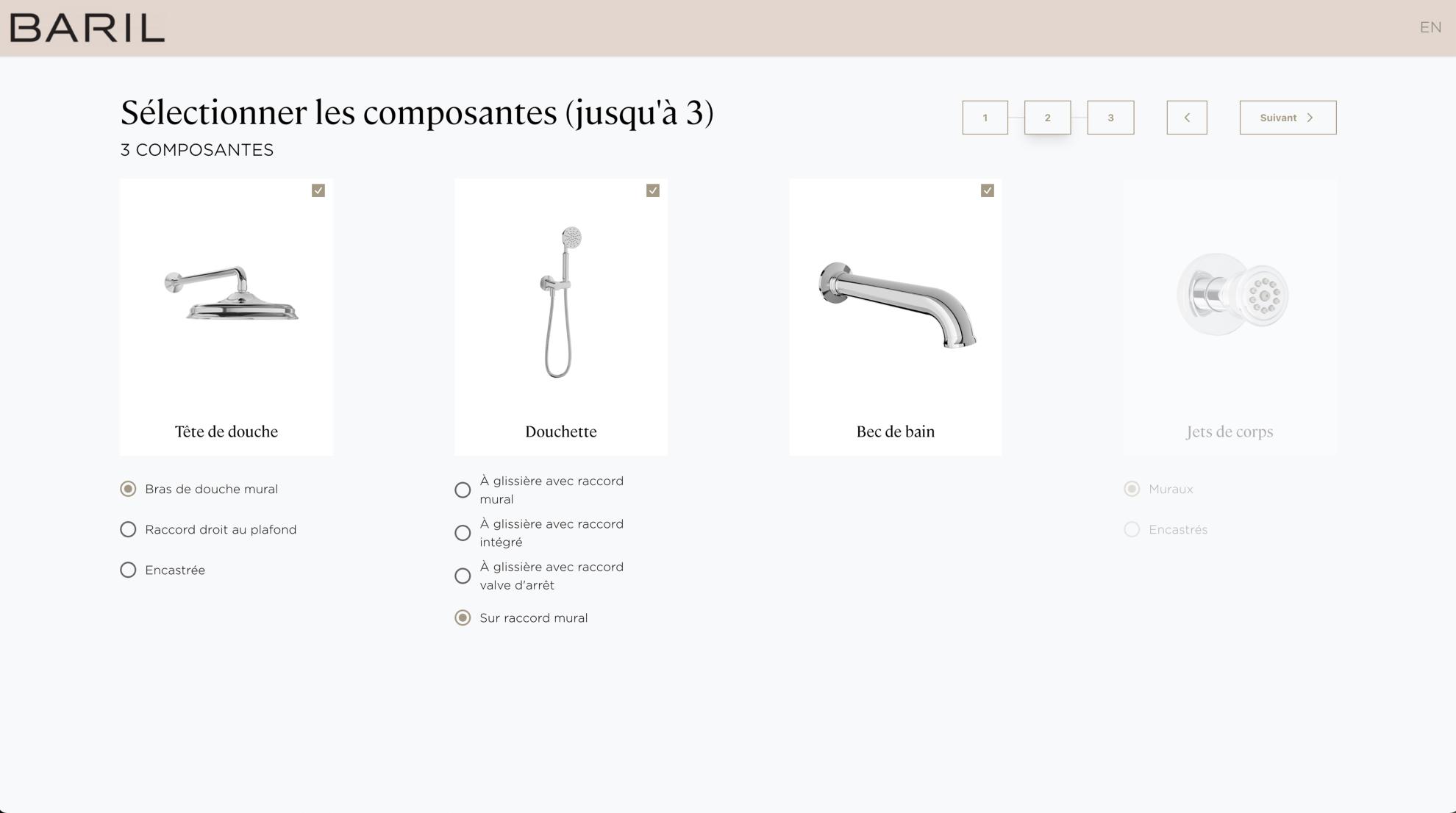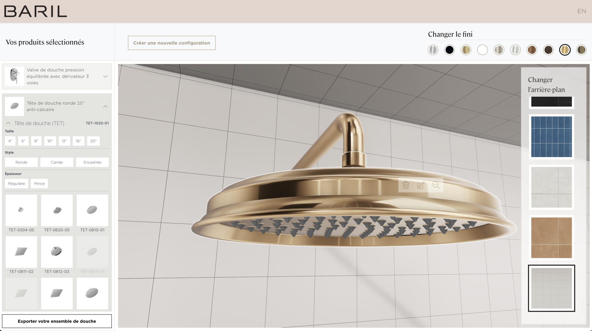 At BARIL, our ambition is to offer an intuitive and immersive personalization experience, enabling the design of custom shower kits with simplicity. It is with this objective in mind that we have developed an innovative virtual configurator, designed to assist consumers, designers, and retailers in visualizing and selecting elements perfectly suited to their needs and preferences.