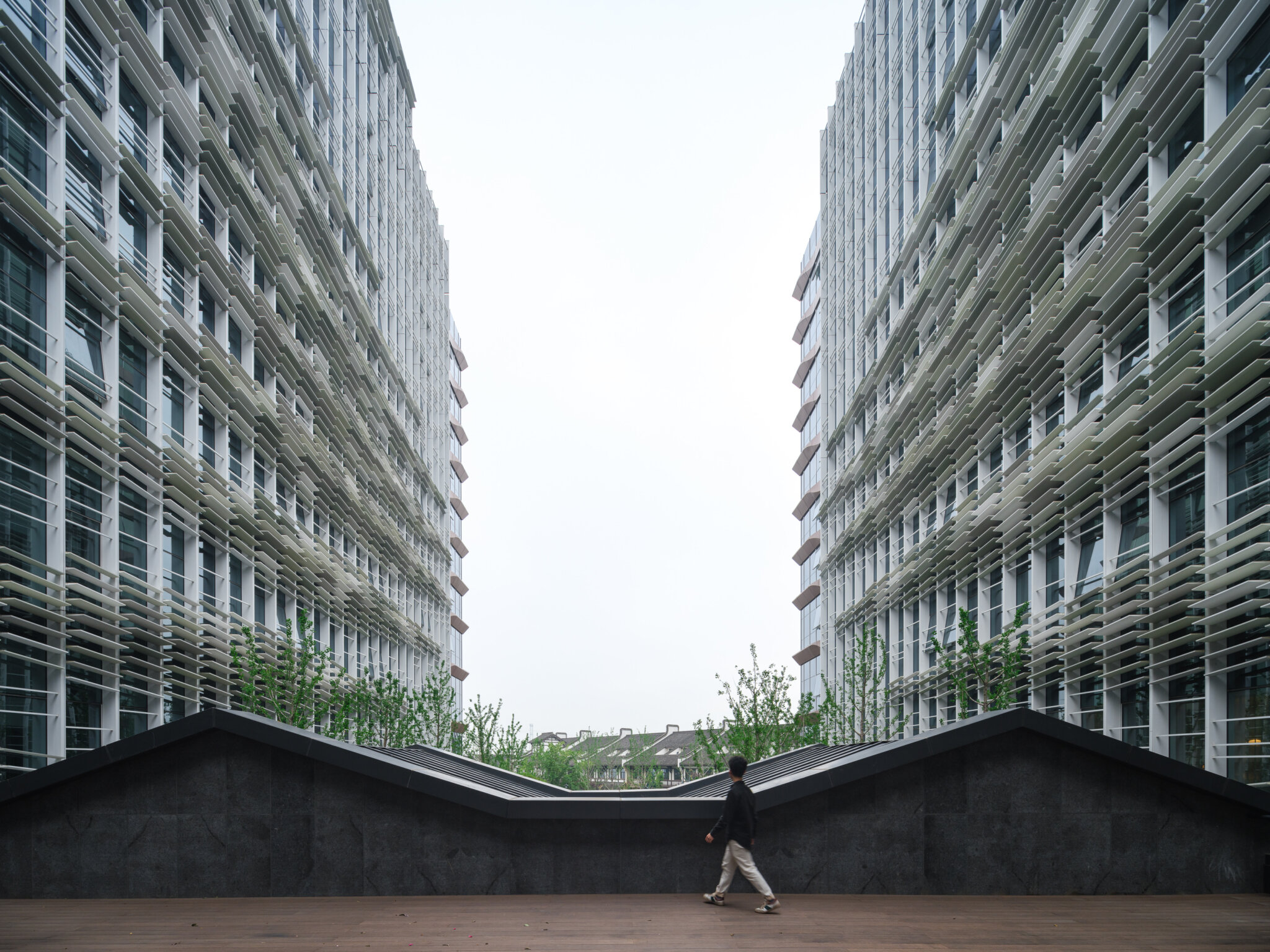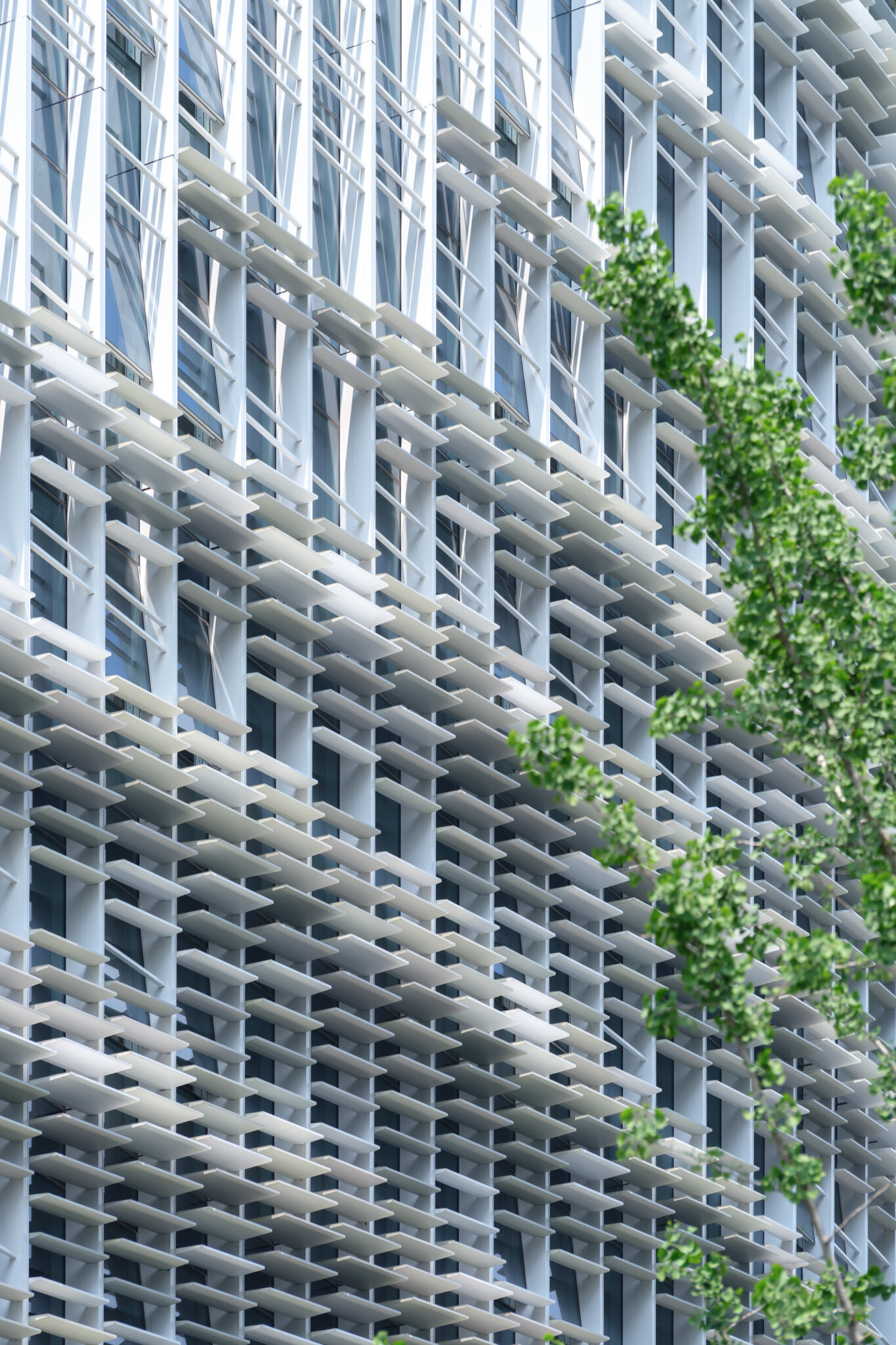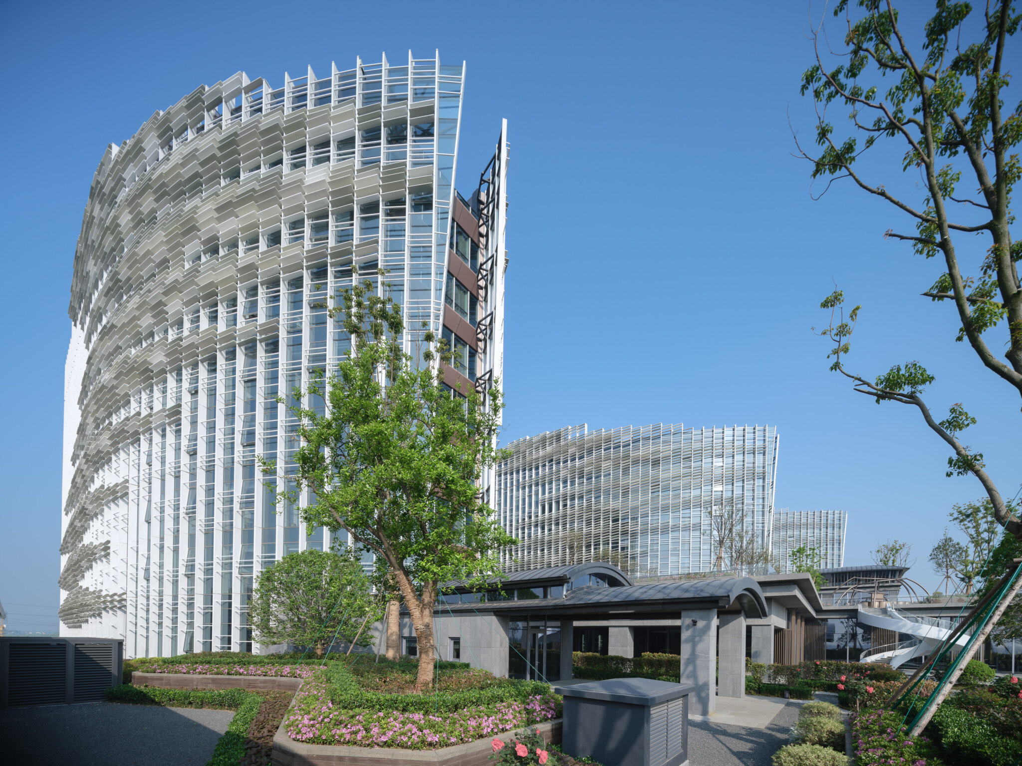 The curtain walls of this project include two types: the double-layer unitized curtain walls and the frame curtain wall systems. The north and south facades of buildings 1-3 from the second floor to the top floor adopt double-layer unitized curtain walls, composed of an outer honeycomb aluminum panel shading system and inside glass material. The rest are frame curtain wall systems that integrate glass curtain walls, honeycomb stone curtain walls, aluminum curtain walls, honeycomb aluminum curtain walls, zinc copper titanium alloy coverings, aluminum awnings, and glass awnings.