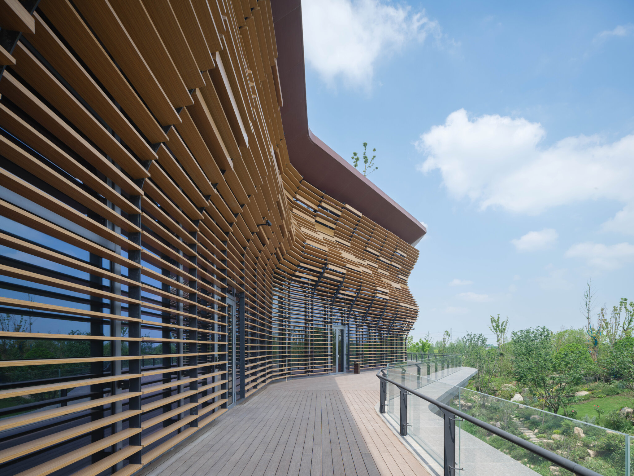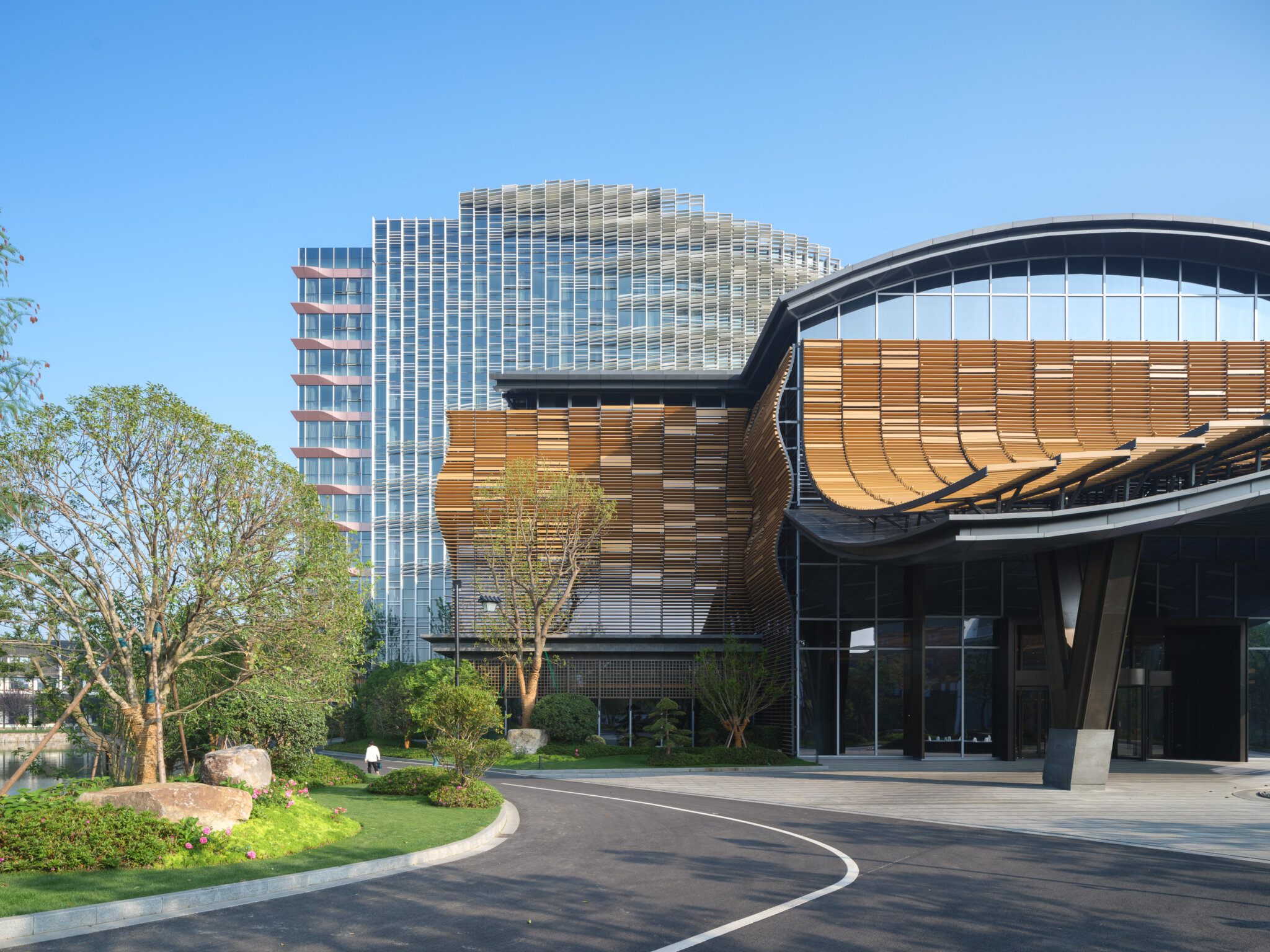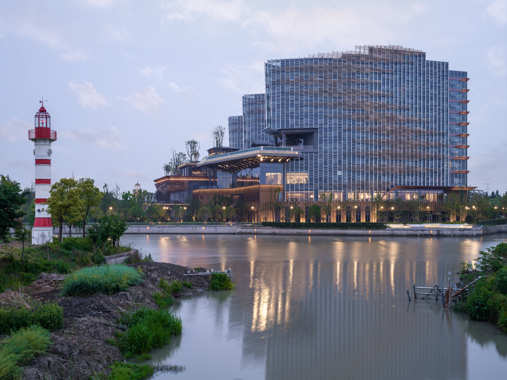The Wuzhen Sailing Hotel, also known as DiShang Resort Wuzhen, boasts a unique design concept that resembles a sailing ship. The podium mimics the shape of a hull, while the towers represent the sail. The wood-grained aluminum sunshades on the podium create an undulating rhythm, imitating the ripple waves caused by sailing. The tower’s louvered sunshades resemble the sails of a sailboat, and their well-arranged angles mimic the dynamic shape of sails fluttering in the wind. The louvers also reflect the water’s surface under sunshine, creating a beautiful play of light and shadow. At dusk, the exterior facade is illuminated by floodlighting, creating a poetic scene of a solitary ship sailing across the vast river, heading towards the never-ending horizon.
