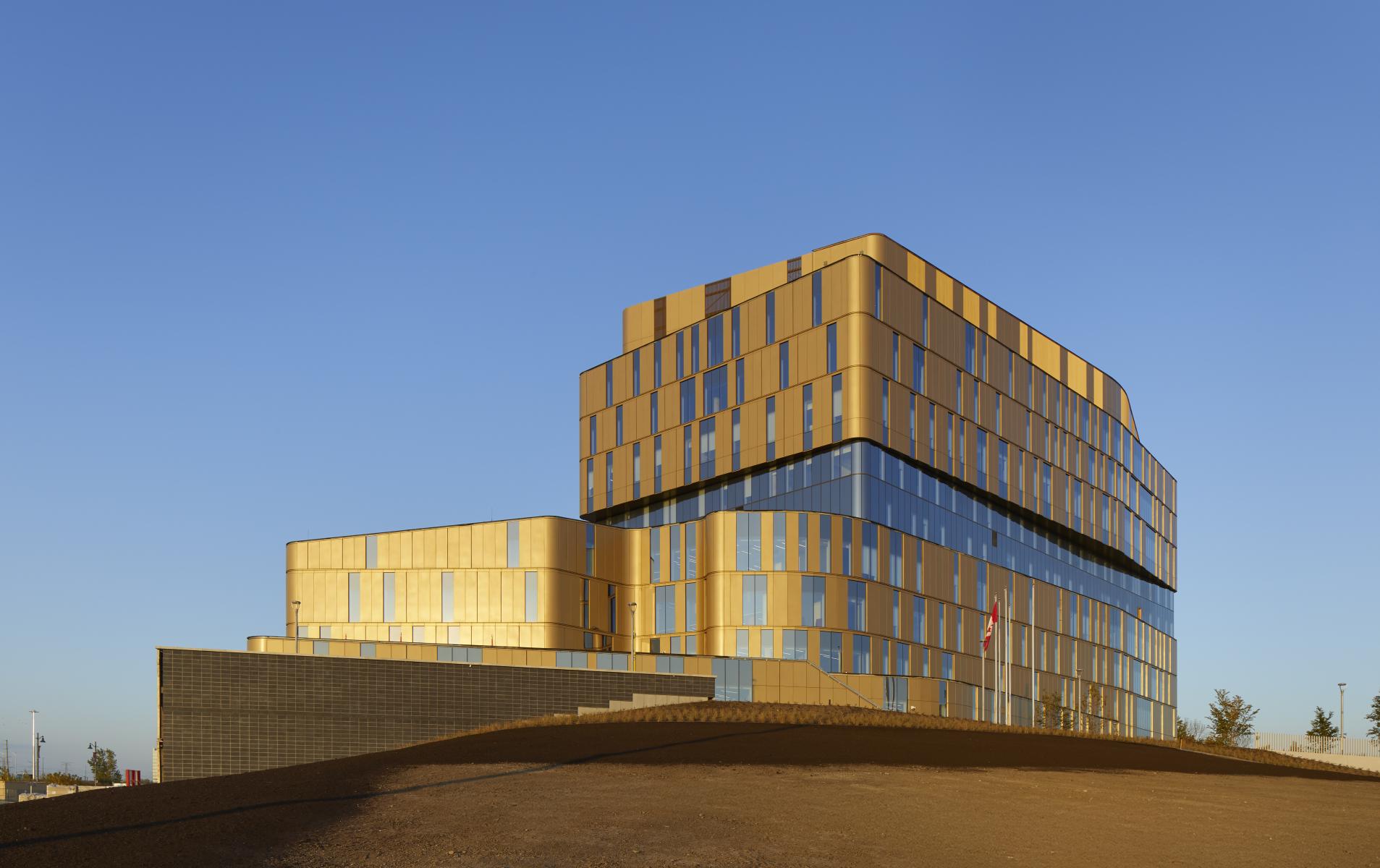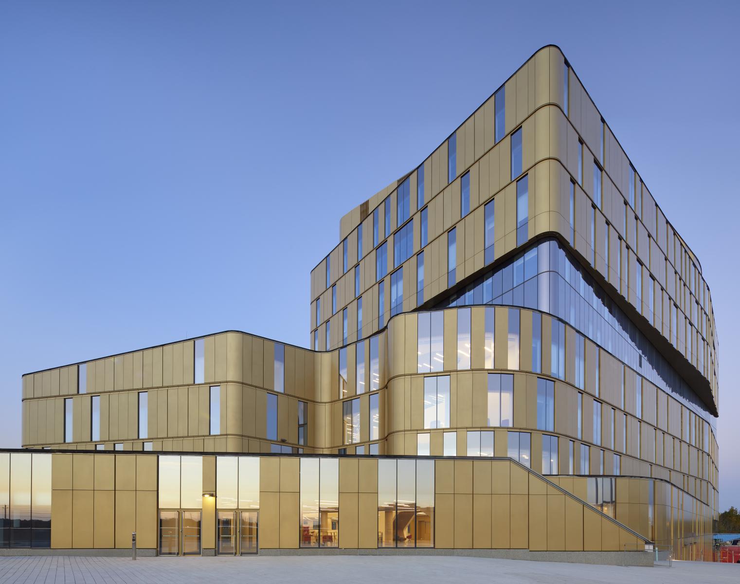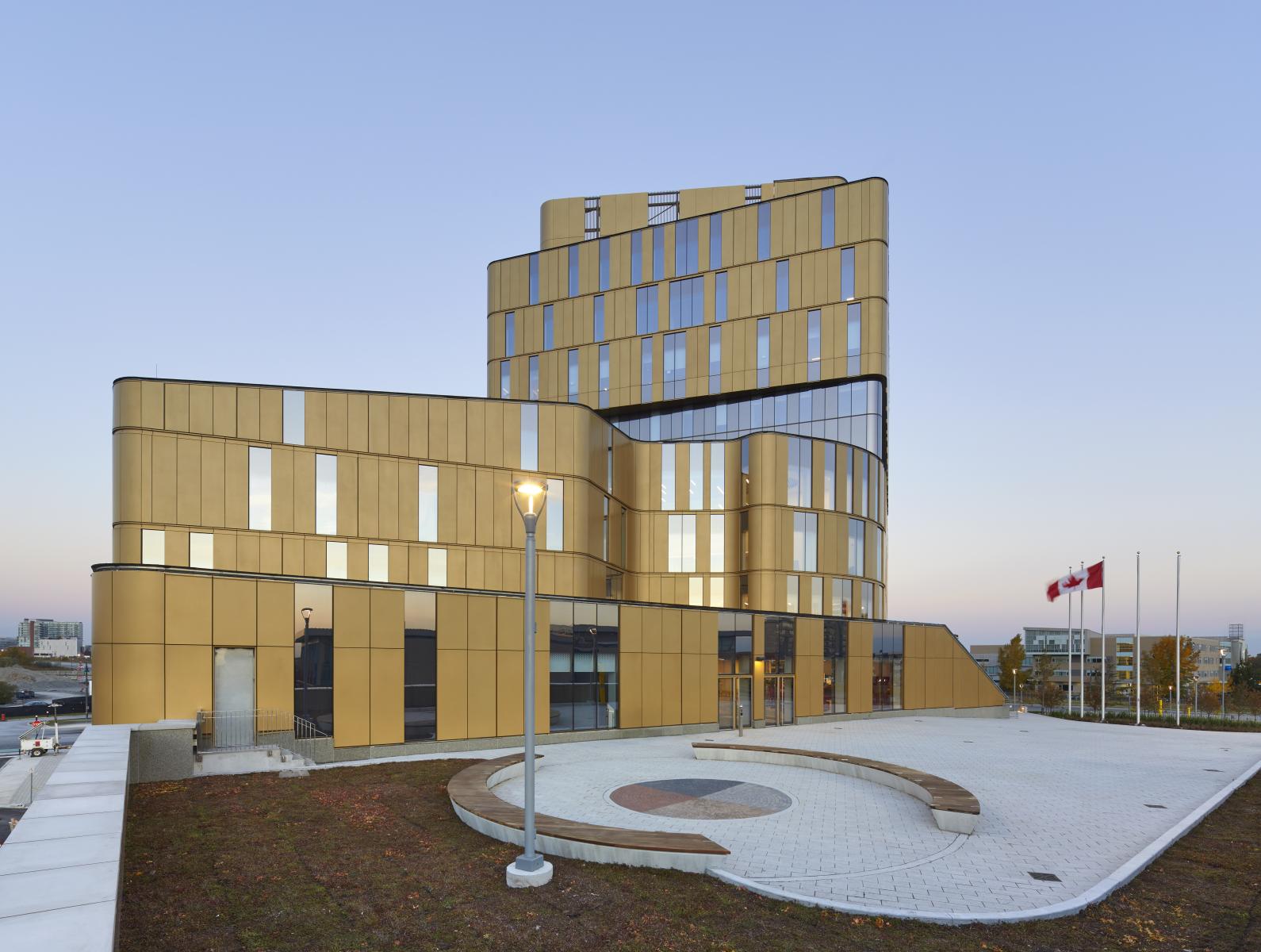Establishing a strong urban presence and identity within Markham’s emerging city centre, the building is anchored by a five-storey podium that opens from a highly accessible entry on University Boulevard fostering connections with the community. Bronze-anodized aluminum clads the exterior, punctuated by a syncopated fenestration pattern. Deep building recesses at mid-levels and curved geometries in plan are among features that distinguish the campus and give it a dynamic presence.