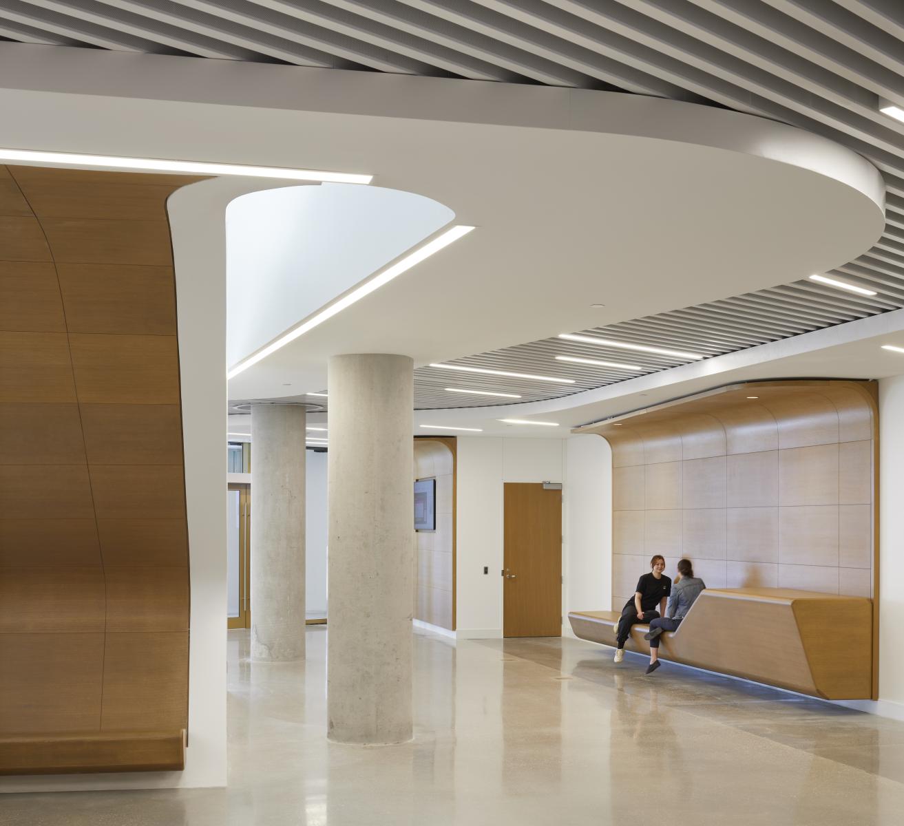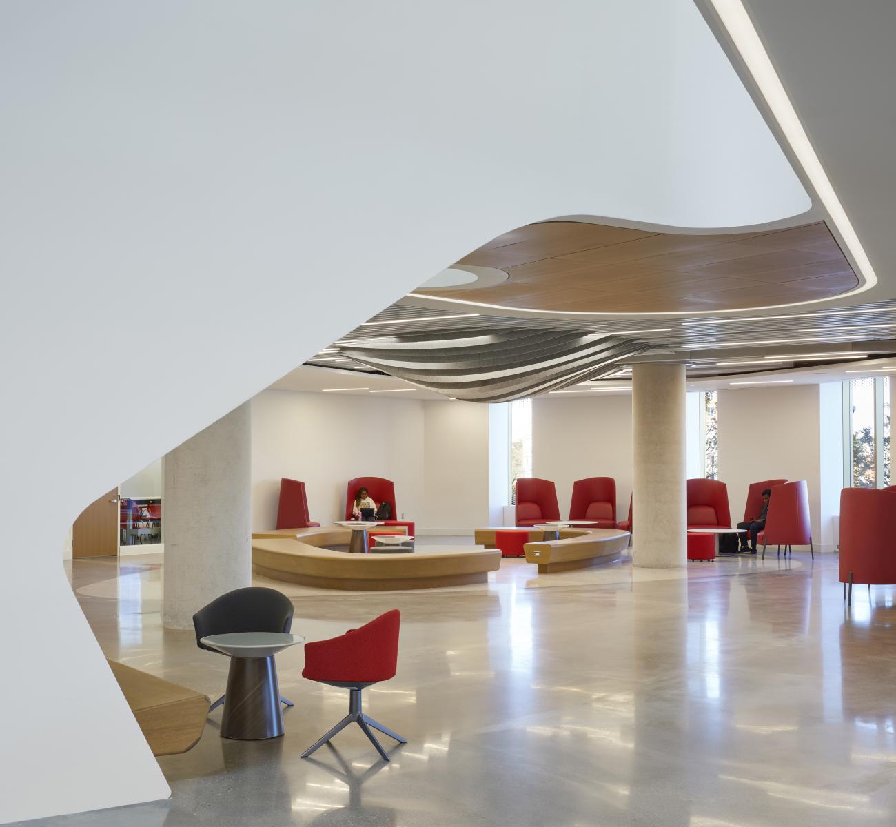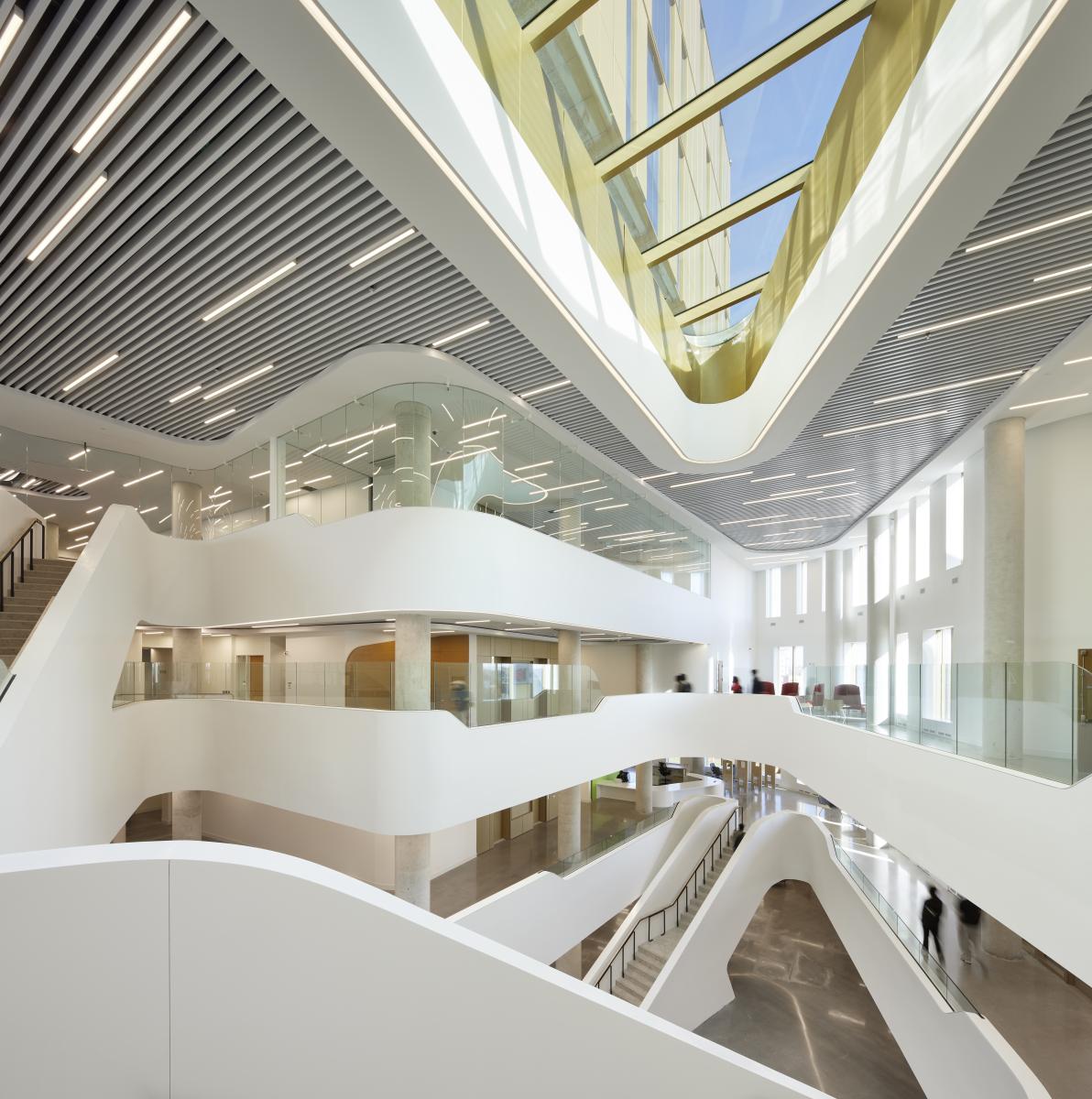 The 400,000sf academic building accommodates 4,000 undergraduate and graduate students across a collection of different programs. Collaboration between the diverse programs and disparate disciplines is supported by interconnected floors, fluid spatial geometry, and visually connected work zones.