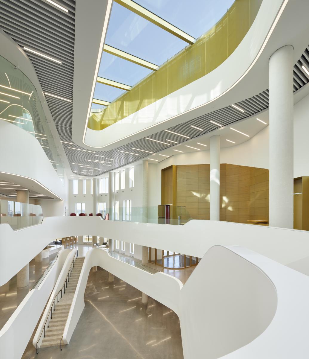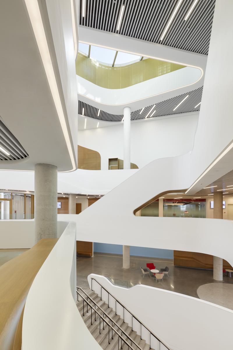 Ten floors of highly flexible, and efficient teaching and learning spaces are organized around a dynamic, interconnected, multi-storey atrium. This open central forum is the social and academic crossroads for the university. With the sculptural form of the building, the atrium stair opens a continuous visual language between interior and envelope, with lofty floor-to-floor heights defining the openness of the campus.