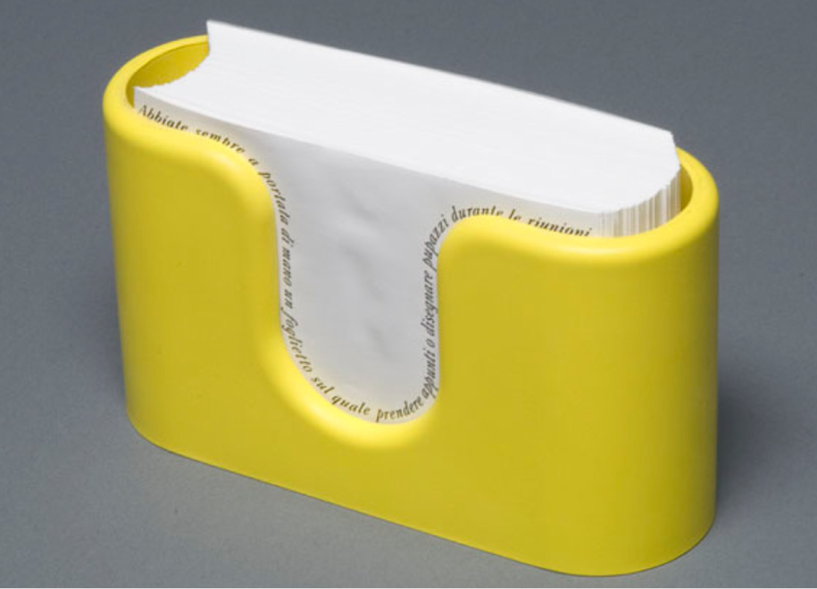 Responsable du design d’exposition au sein de la firme Olivetti, celui qui, jadis, passait ses weekends à New York à admirer les produits du chef de file dans le domaine des équipements de bureau, a su proposer vus aujourd’hui comme typiques de l’époque, dont un porte-mémos, un porte-crayons et un porte-trombones en caoutchouc synthétique, aux formes curvilignes et aux couleurs très voyantes.