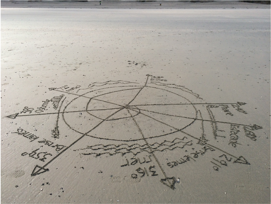 Quand les conditions le permettent, et que je suis en bord de mer, je dessine des «mandala» sur le sable mouillé… la durée de vie est au maximum le temps d’une marée… j’en garde une trace photographique.