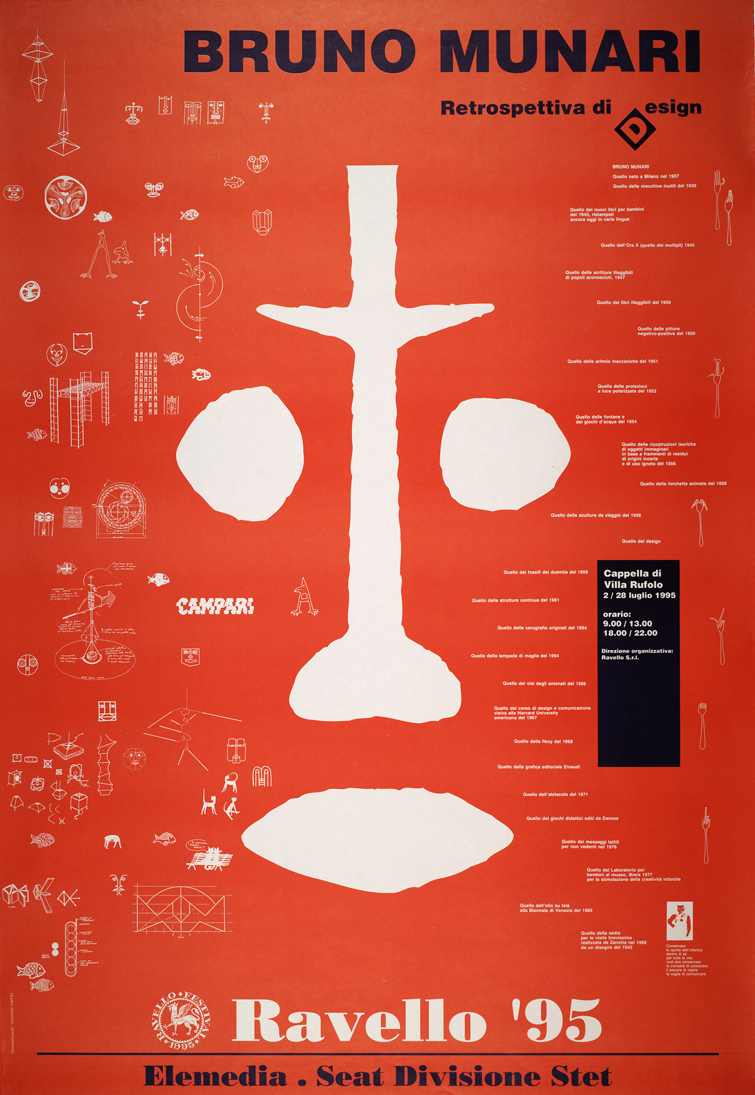 L’affiche décrit les moments fondateurs de la longue expérience de design de Bruno Munari et un poème / hymne: « Celui qui est né à Milan… ».