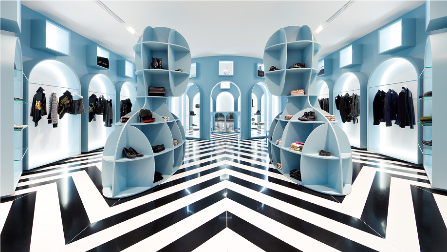 Lorsque la boutique Stuart Weitzman approchait Novembre pour le design de sa boutique de Rome, le créateur s’est imaginé de précieuses boites emballées à la façon de l’artiste Christo, se déployant comme des boites de cadeaux aux clientes. Le ruban ininterrompu court ainsi le long de l’espace et crée un parcours dans lequel les chaussures deviennent vectrices de désir.