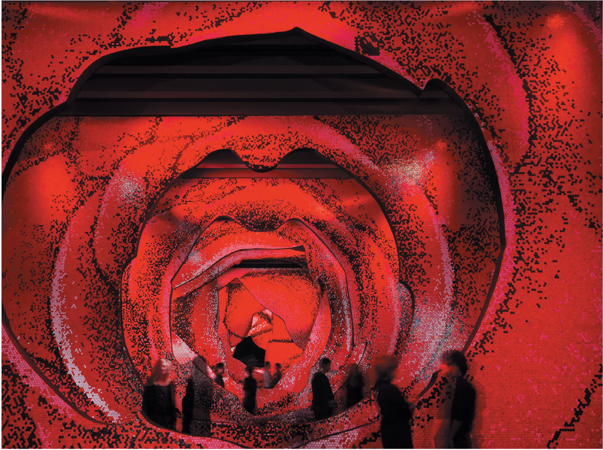 Dès son entrée, le visiteur devenait spectateur : face à lui s’ouvrait une énorme fleur, composée d’une mosaïque qui, en se répétant dans l’espace, donnait l’impression de s’étendre à l’infini. L’effet, très théâtral, était renforcé par le contraste entre le noir asphalte du plancher et la coloration rouge saturée de la fleur.