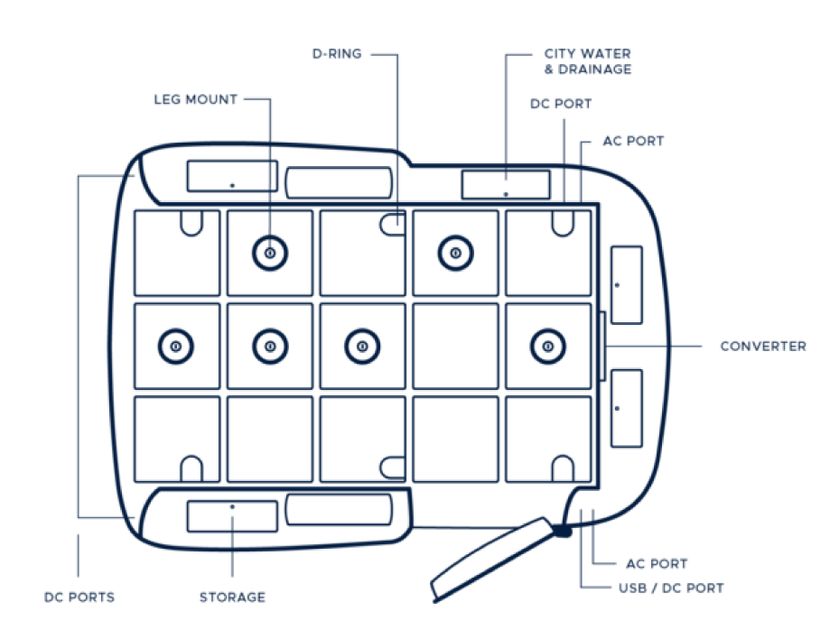 Le sol modulaire du HC1 est fabriqué à partir de fibre de verre en nid d’abeille de 1,5 » d’épaisseur, ce qui est super solide, mais incroyablement léger. La conception du sol rainuré maintient les composants du cube AdaptivTM en place — comme des Legos®. Les panneaux de sol comportent également des bases de table, un cadre — des attaches à anneaux en D et un drain avant pour arroser facilement la roulotte pour un nettoyage facile. Configurez et reconfigurez-le un clin d’œil.
