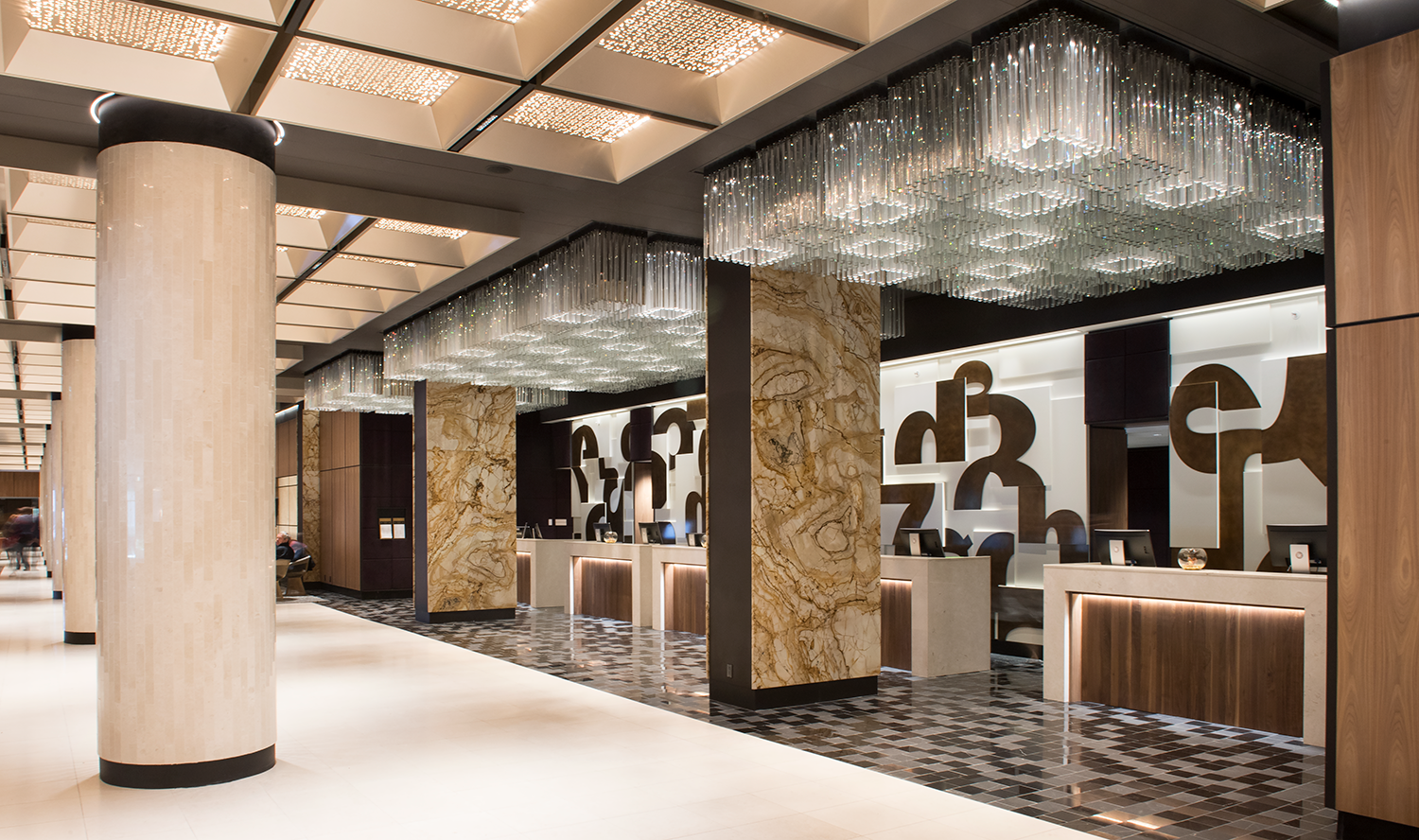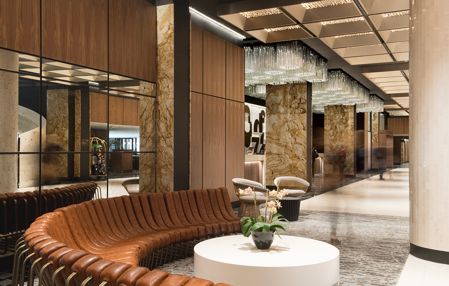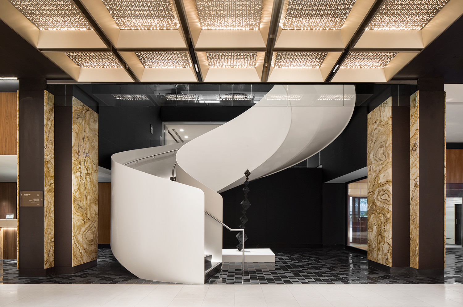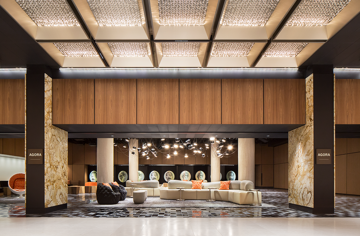 Ce mariage entre le passé et le présent joue à la fois de force et de subtilité : ainsi, le grand hall central est ponctué de colonnes et bordé d’imposants piliers recouverts de marbre, mais son plafond est orné de longues plaques dorées, découpées au laser, qui créent de délicats motifs géométriques.