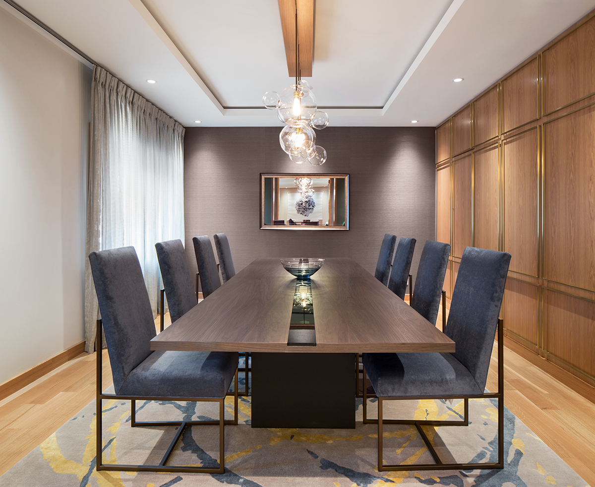 Accessible par un ascenseur privé, elle propose des espaces polyvalents, comme la salle à manger qui sert aussi de salle de réunion, avec appareils technologiques dissimulés dans le mobilier. Chacune des pièces en enfilade profite d’un aménagement recherché qui atteint un bel équilibre entre luxe et sobriété.