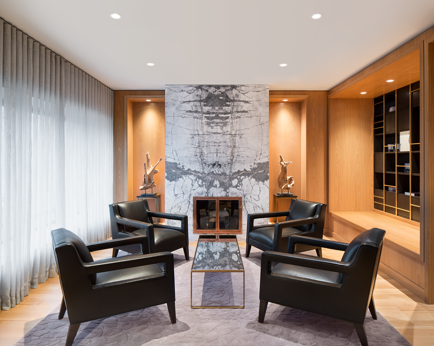 Espace de transition entre l’extérieur et le hall, il emprunte d’ailleurs à ce dernier plusieurs éléments décoratifs : composantes en bois, éléments de plafond, marbre et matériaux aux teintes terreuses.