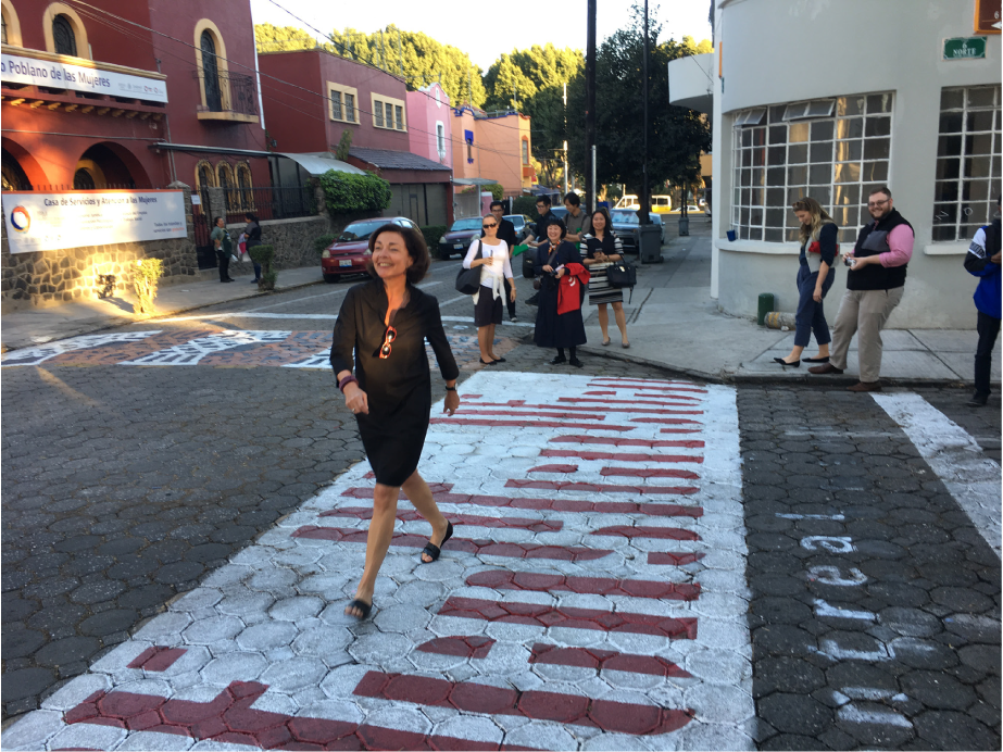 Marie-Josée Lacroix à la rencontre des villes UNESCO de design à Puebla (Mexique) déambulant sur l’empreinte de Montréal, Ville UNESCO de design conçue par les talentueux designers montréalais du Studio FEED.