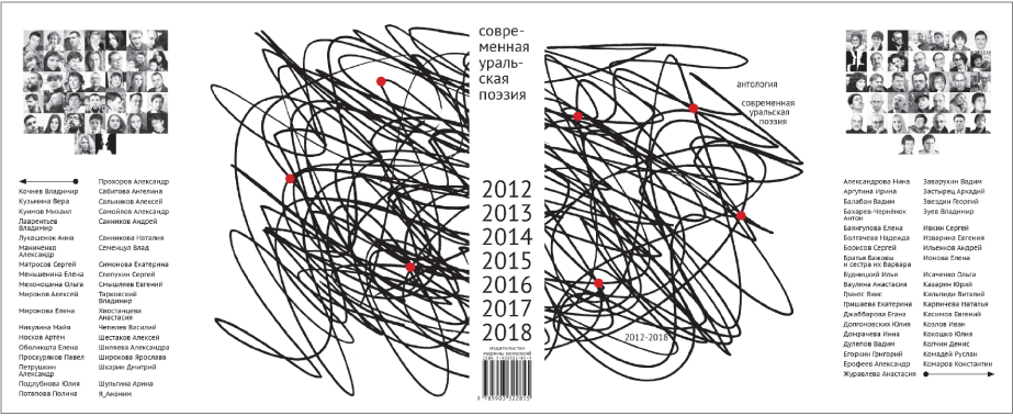 La veste et la couverture du livre sont différentes : sous le rhizome multiconnecté de la veste blanche, vous trouverez une couverture de livre en tissu rouge embossée d’or. Le texte est le même sur les deux : «Anthologie», «Poésie contemporaine de l’Oural», «2012-2018. Sur le dos, vous voyez le texte «Poésie contemporaine de l’Oural» et la liste des années 2012, 2013, 2014, 2015, 2016, 2017, 2018. Sur les rabats de la veste, vous voyez des photos et la liste des 74 auteurs qui ont été inclus dans le livre.