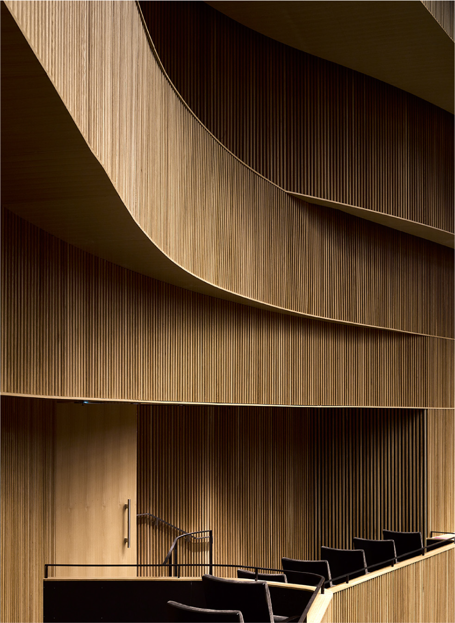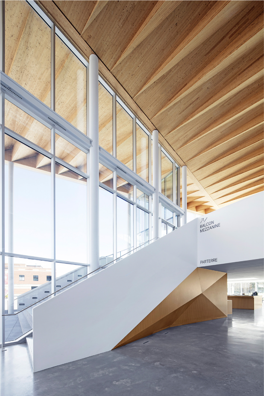 Le projet iconique et signalétique porte éloge au rayonnement grandissant de la filière bois de son territoire. Le bois est mis de l’avant dans l’aménagement de la salle de spectacles élégante, des espaces communs lumineux, de l’architecture sobre et des espaces extérieurs invitants.