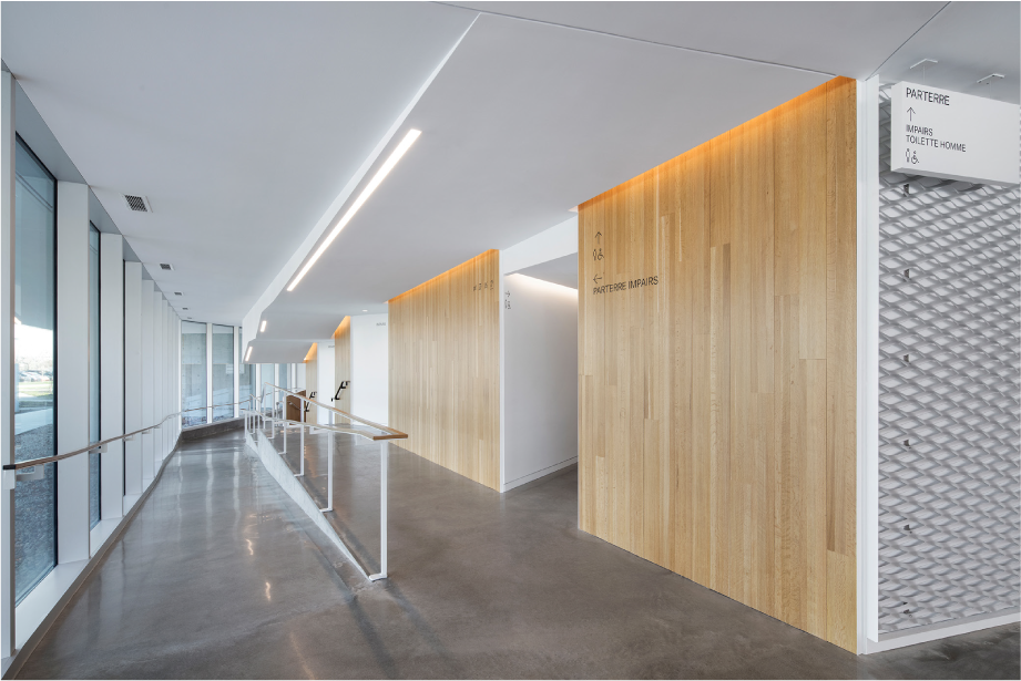 Le jury du GRANDS PRIX DU DESIGN soulignait la nuance équilibrée des tons de bois et l’aspect spectaculaire du plafond pavillonnaire.