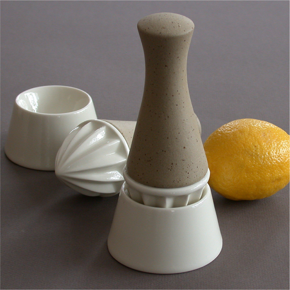 Parlons d’un de ces petits objets intelligents: les presse-citron à main. Ben connus pour être pratiques et efficaces, lorsqu’ils sont utilisés à table, ils salissent la nappe. Pour résoudre ce problème, Koen a conçu un petit socle et, associé à sa salière fleur de sel, l’a intégré à un ensemble attrayant à utiliser à table, aussi précieux qu’un coquillage trouvé sur une plage.