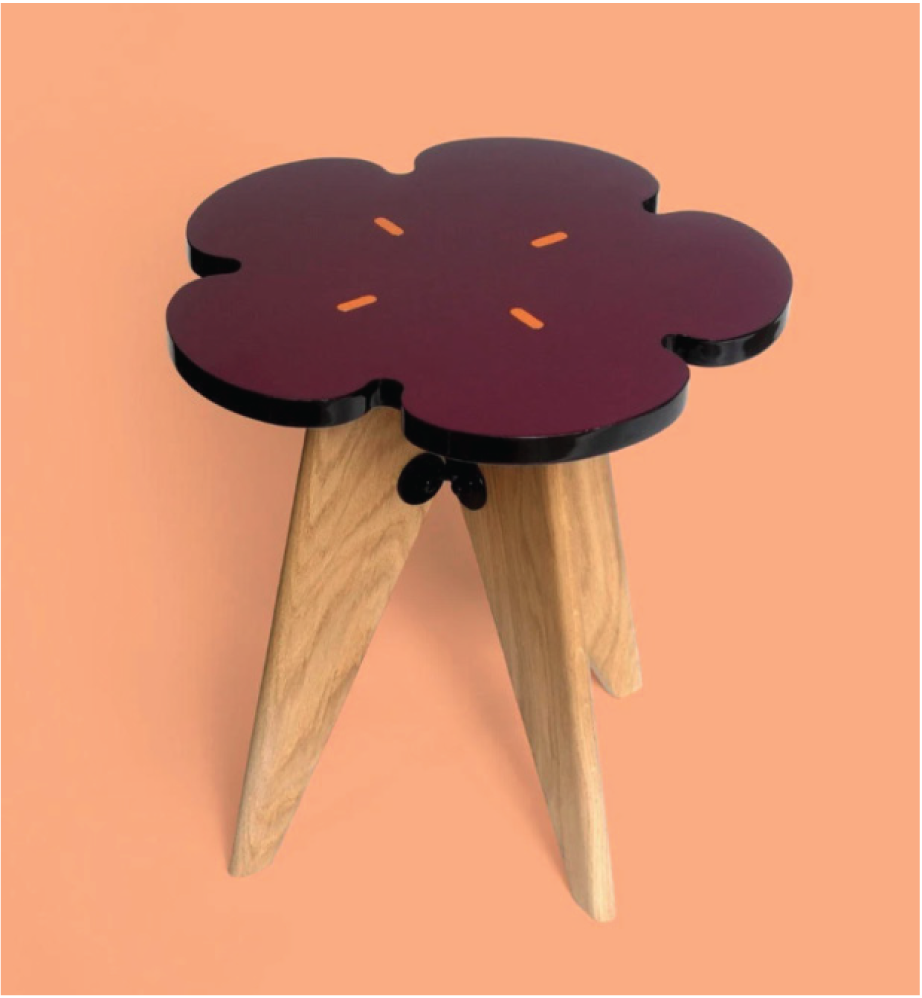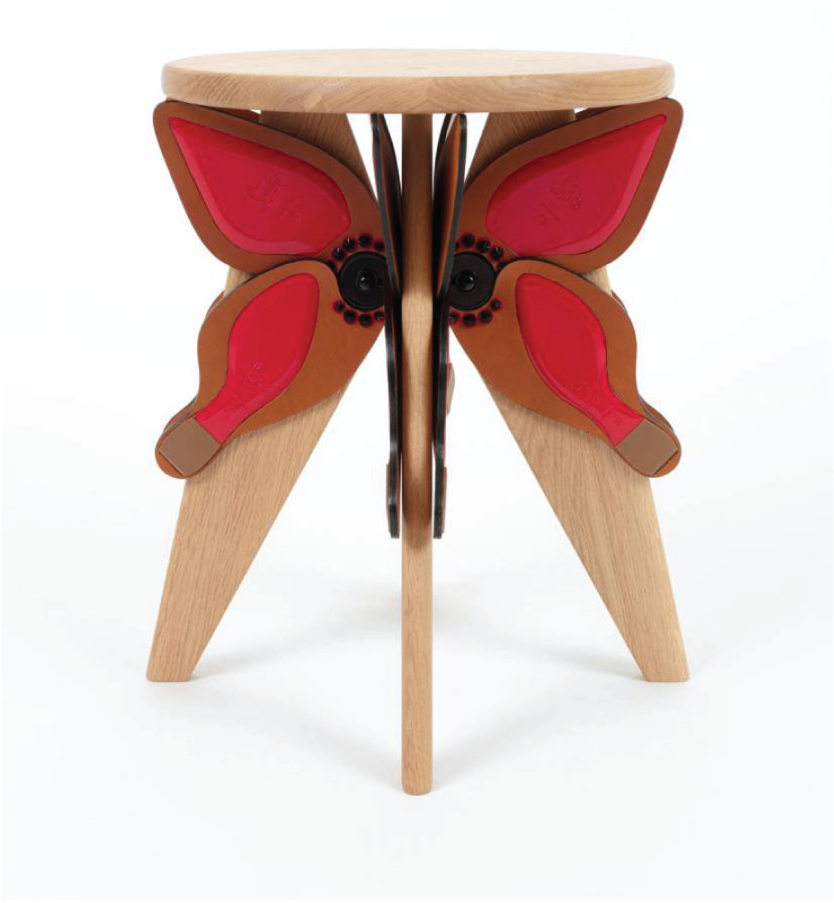 “ Le tabouret est empreint d’une simplicité immuable, une assise et quatre pieds qui, associés au bois lui confèrent une idée de solidité à toute épreuve. Je trouvais intéressant de confronter cela à la fragilité qu’incarne le papillon. J’ai toujours été fasciné par leur iridescence et leurs nuances chamarrées. Mais là, ils se devaient d’être rouges évidemment ! ”
