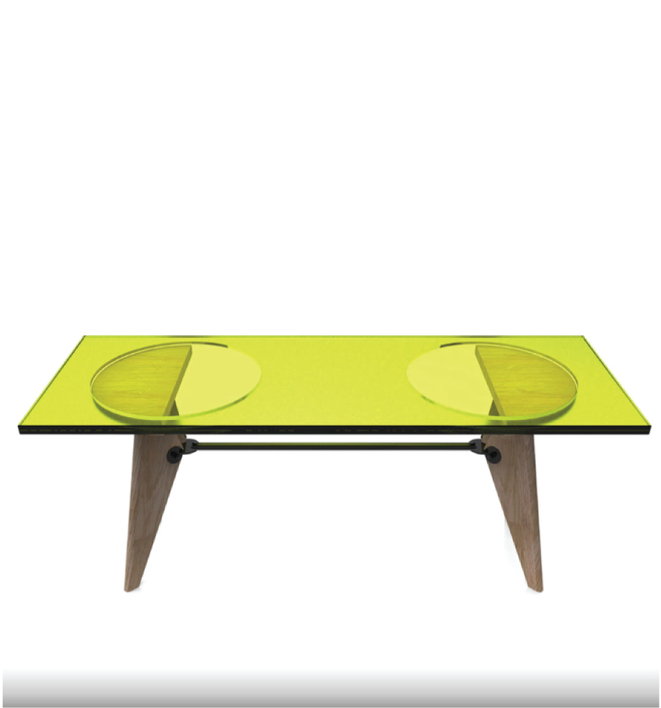 Jean-Michel Wilmotte rend hommage à Jean Prouvé. L’architecte transforme le petit mobilier, comme il réaliserait l’extension d’un bâtiment, en utilisant la liaison et l’assemblage, sans le dénaturer. Ainsi pour ce projet, il met savamment en lumière la structure du tabouret Solvay, grâce à l’utilisation d’un hublot fluorescent et transparent qu’il vient délicatement poser par-dessus.