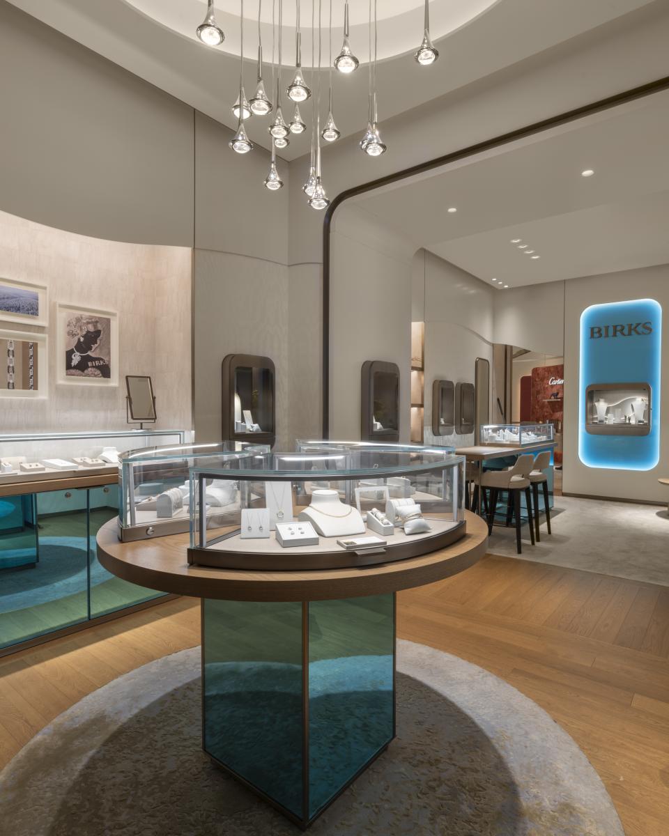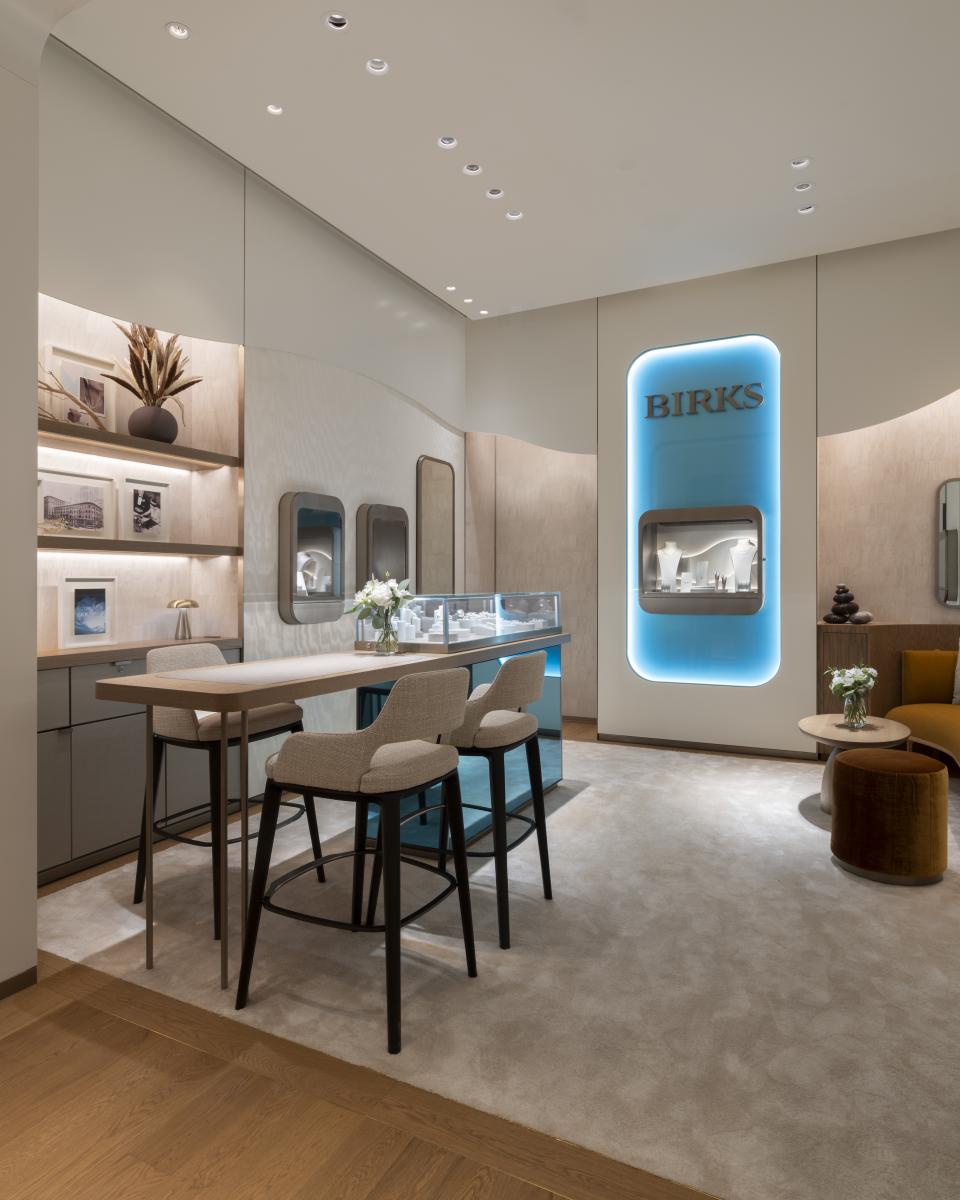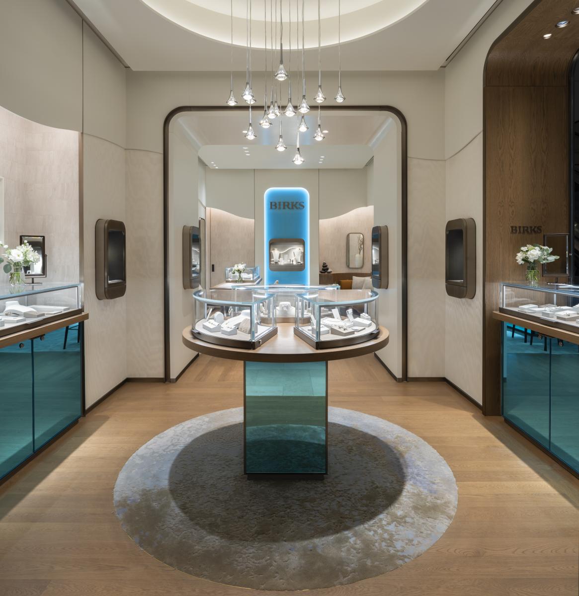 De plus, le magasin Birks ne présenterait que des bijoux, car les montres seraient toutes dans la boutique Time Valley. Conceptuellement, cela a permis à l’équipe de se déplacer vers un territoire entièrement différent pour l’environnement de la marque Birks : un territoire plus axé sur les collections de bijoux de base de Birks, sans être entravé par les autres marques, et articulant un design de magasin non seulement adapté aux attributs clés de Birks, mais aussi ciblé pour une clientèle féminine.