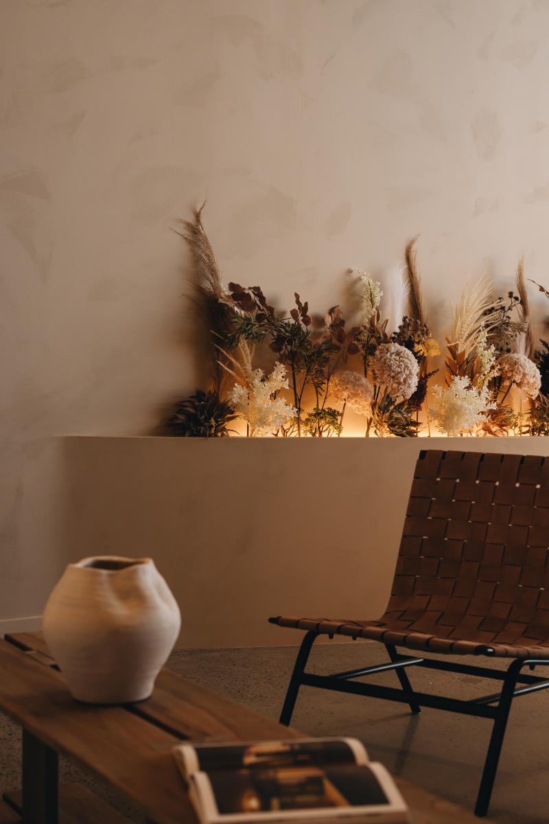 Le béton, parfois apparent, est adouci par sa texture lisse et ses teintes minérales. Il sert de toile de fond neutre, stable, comme le centre que l’on cherche à atteindre en soi. Associé au bois et à la chaux, il crée un équilibre entre force et souplesse, entre structure et souffle.
