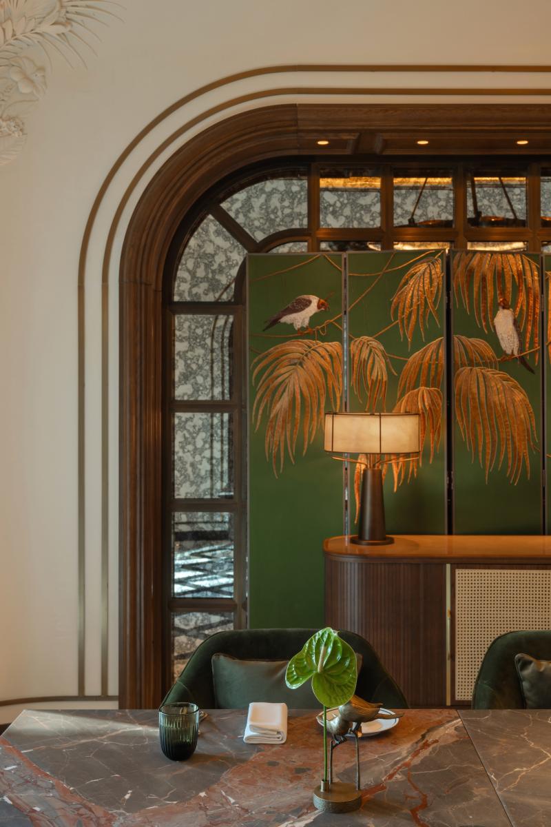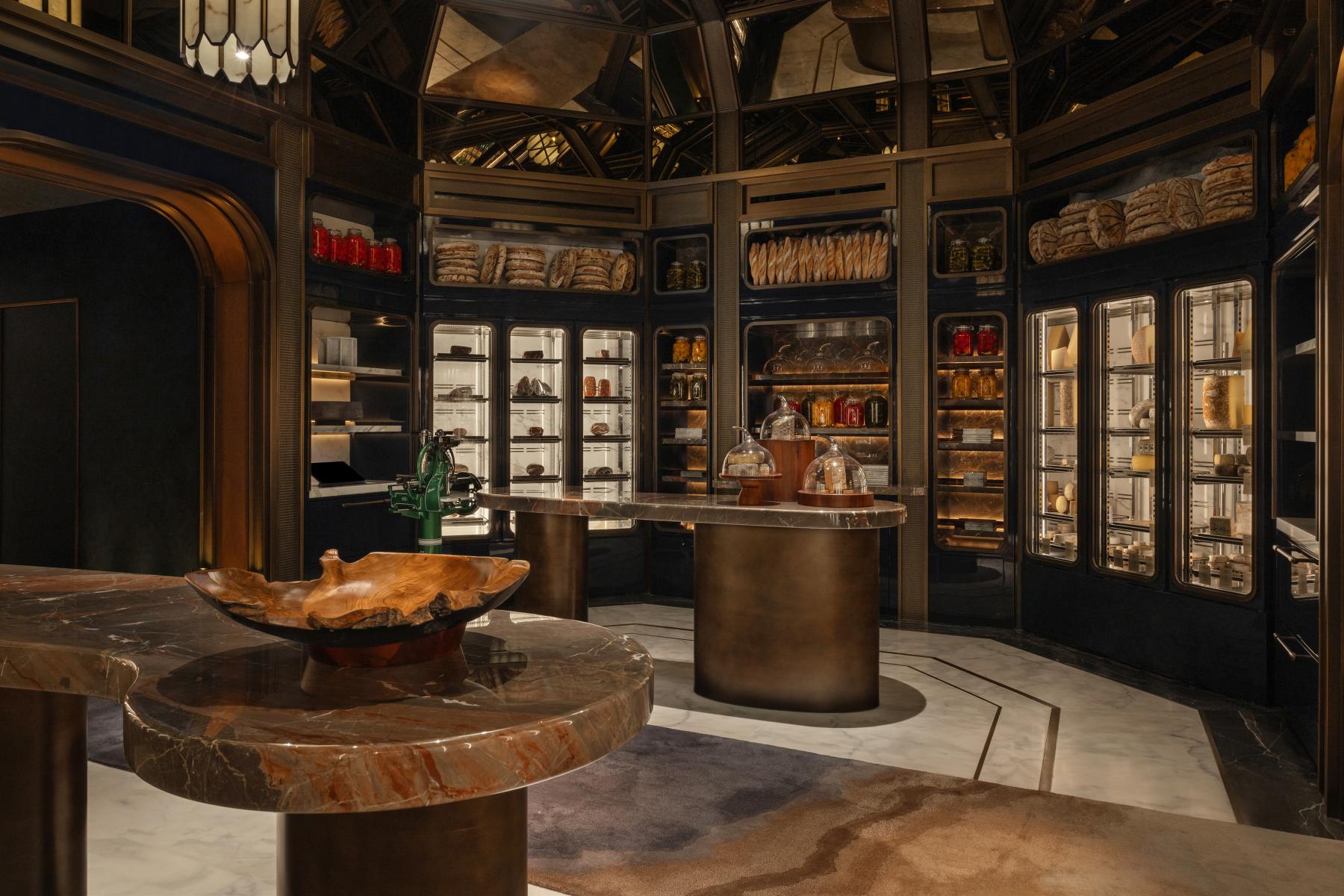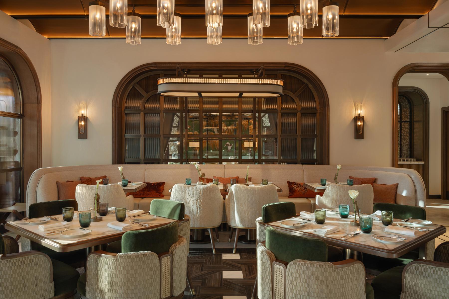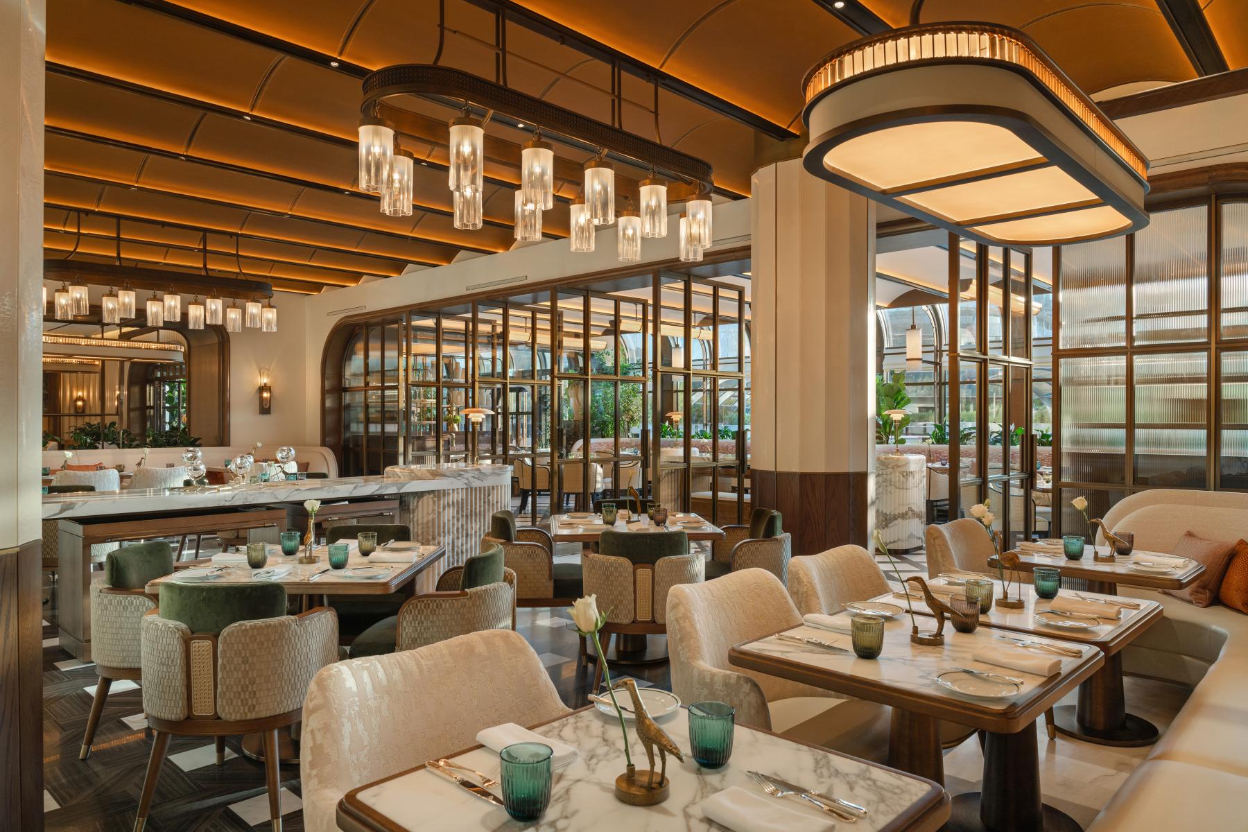 Le Rockwell Group s'est inspiré pour le restaurant des brasseries françaises classiques et des élégantes serres baignées de lumière, en mettant l'accent sur un mélange des expériences intérieures et extérieures. Des accents métalliques, du cuir, de la pierre, et des créations personnalisées de certains des artisans les plus habiles d'Europe.
