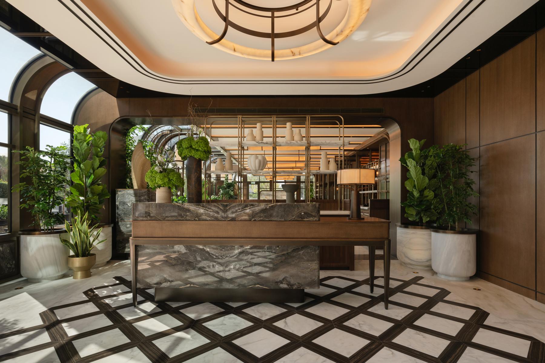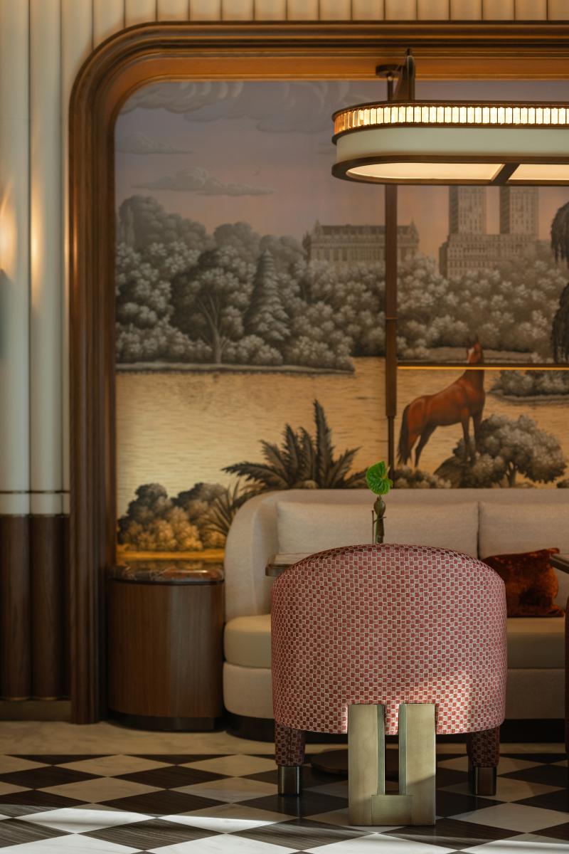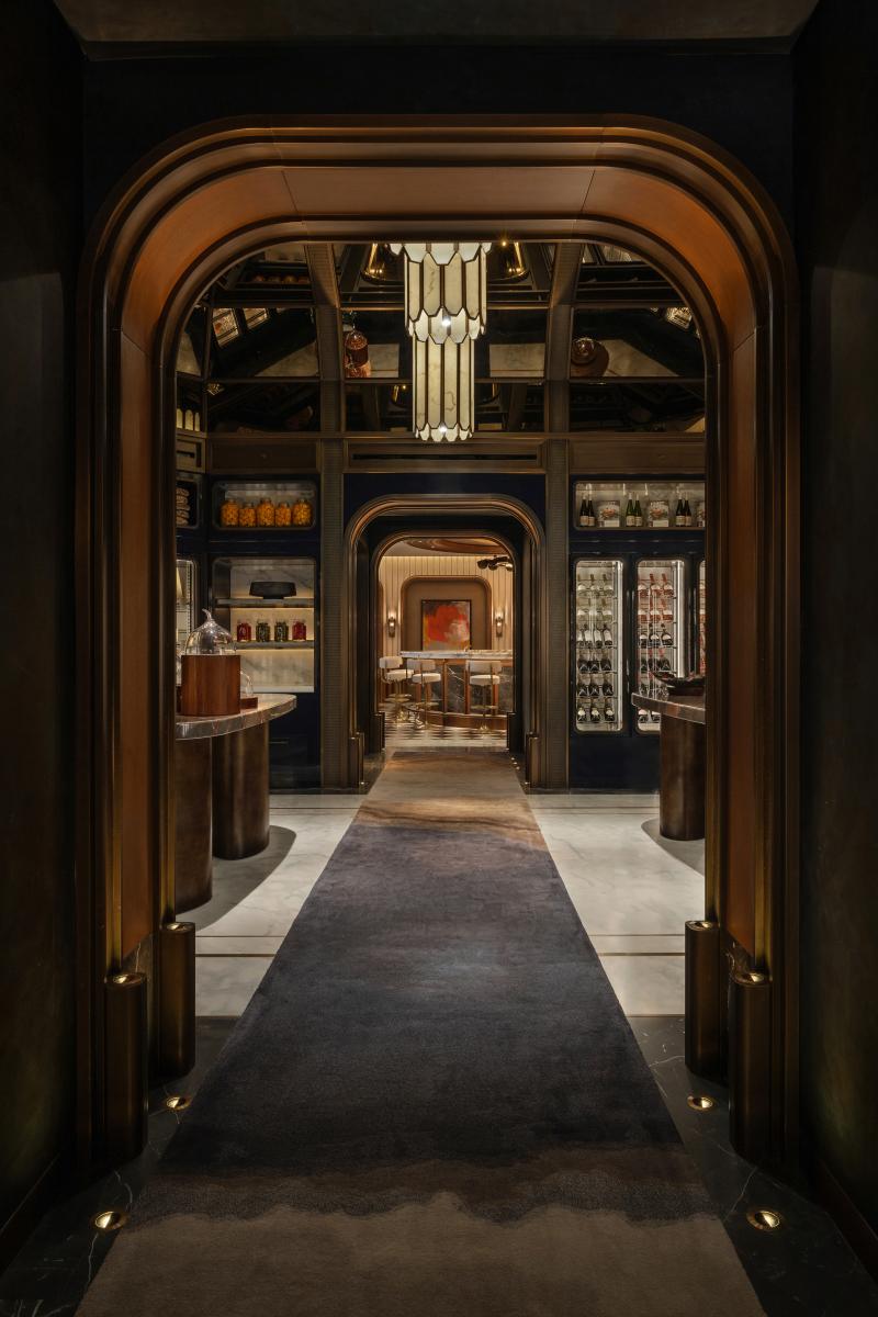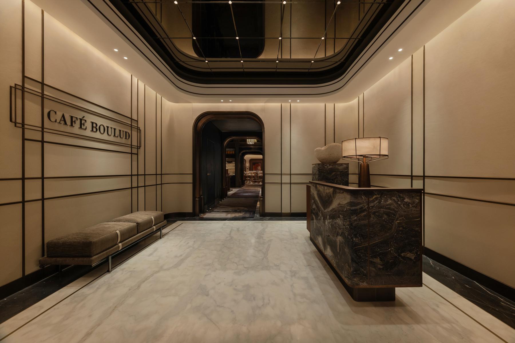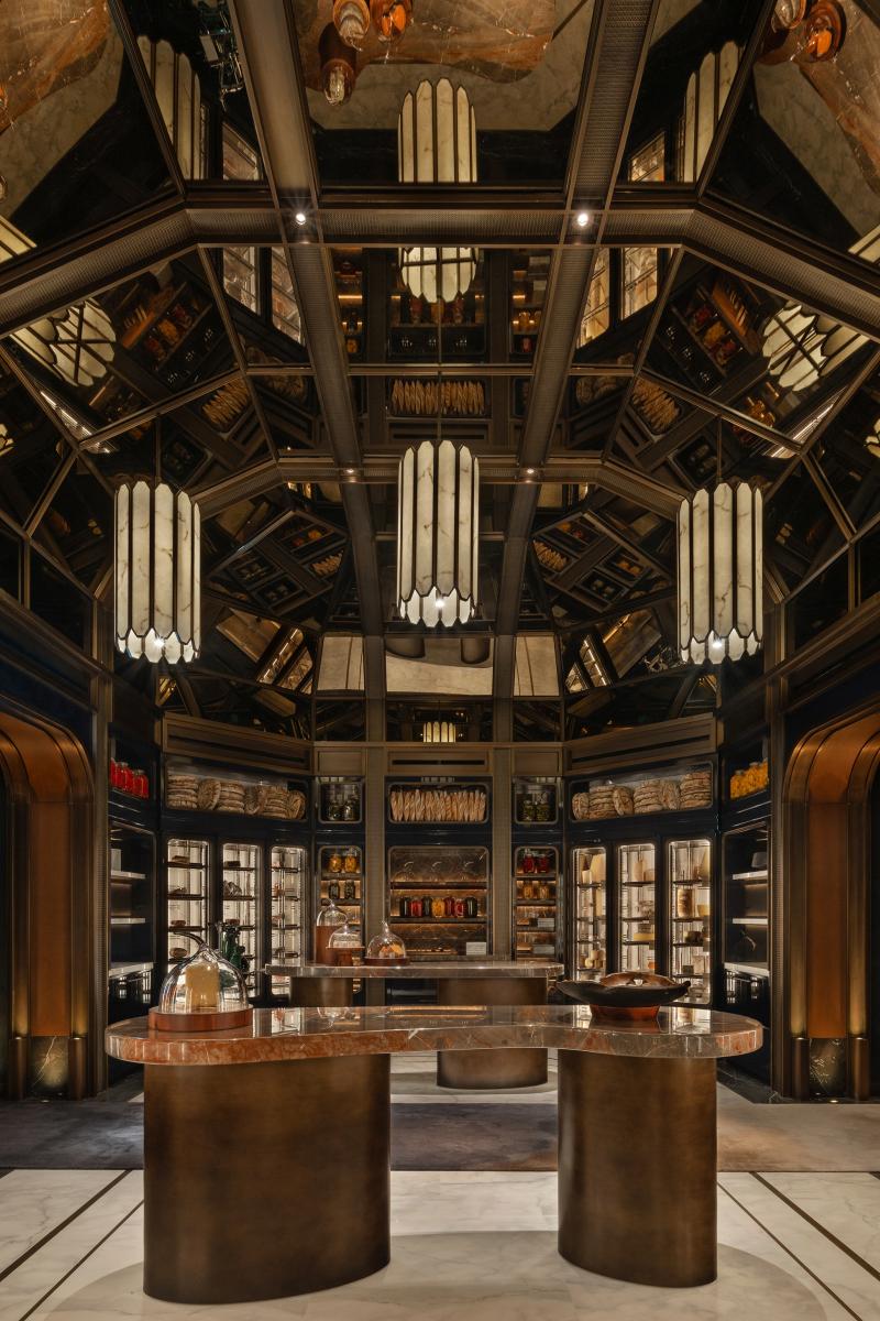 Le Rockwell Group s'est inspiré pour le restaurant des brasseries françaises classiques et des élégantes serres baignées de lumière, en mettant l'accent sur un mélange des expériences intérieures et extérieures. Des accents métalliques, du cuir, de la pierre, et des créations personnalisées de certains des artisans les plus habiles d'Europe.