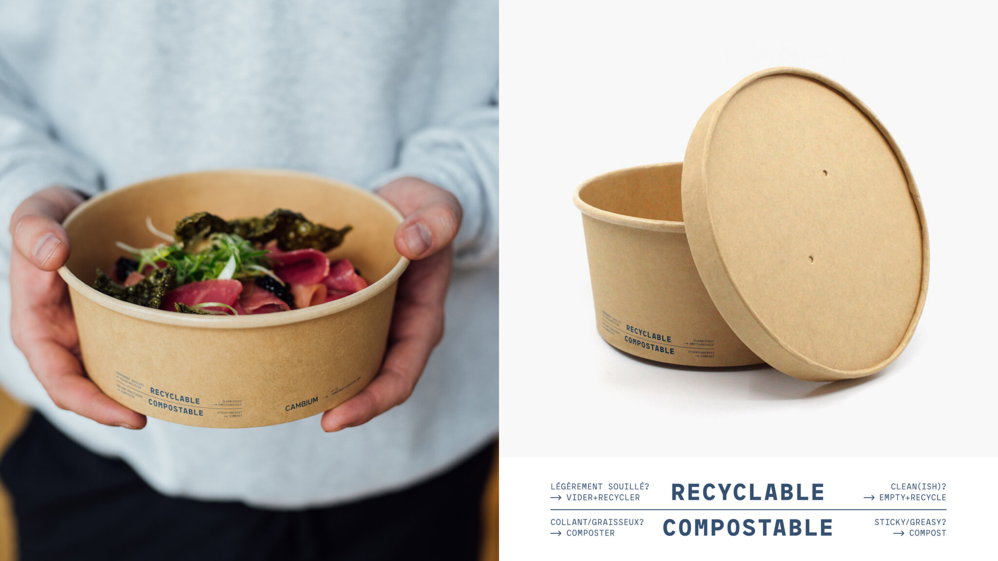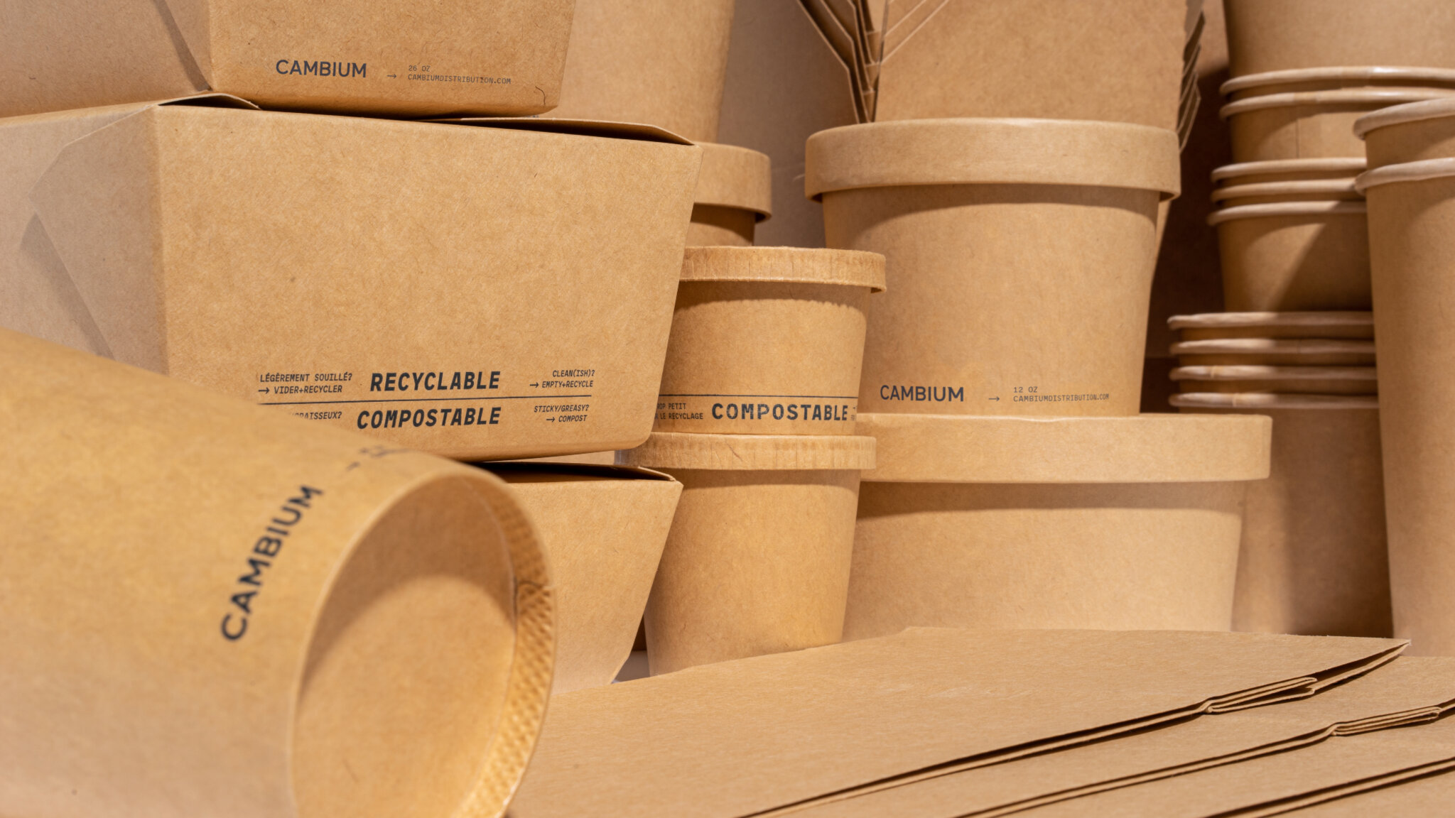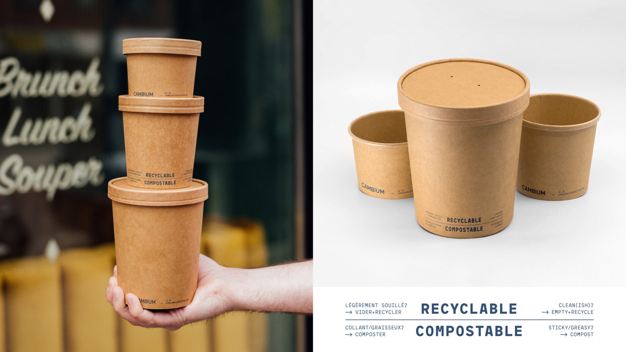 Bien que les municipalités donnent des consignes générales sur les matières à déposer dans les bacs de recyclage, de compostage et de déchets, de nombreux consommateurs restent confus lorsqu’il s’agit de disposer des contenants pour emporter. Pour mettre fin à cette confusion et guider les consommateurs, Cambium propose des instructions de tri directement sur tous ses emballages, pour une meilleure gestion en fin de vie.
