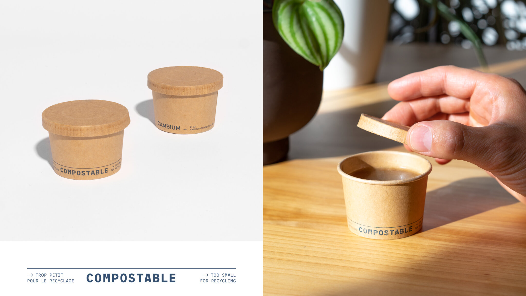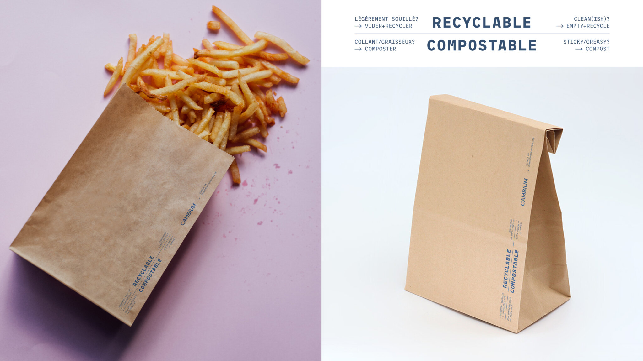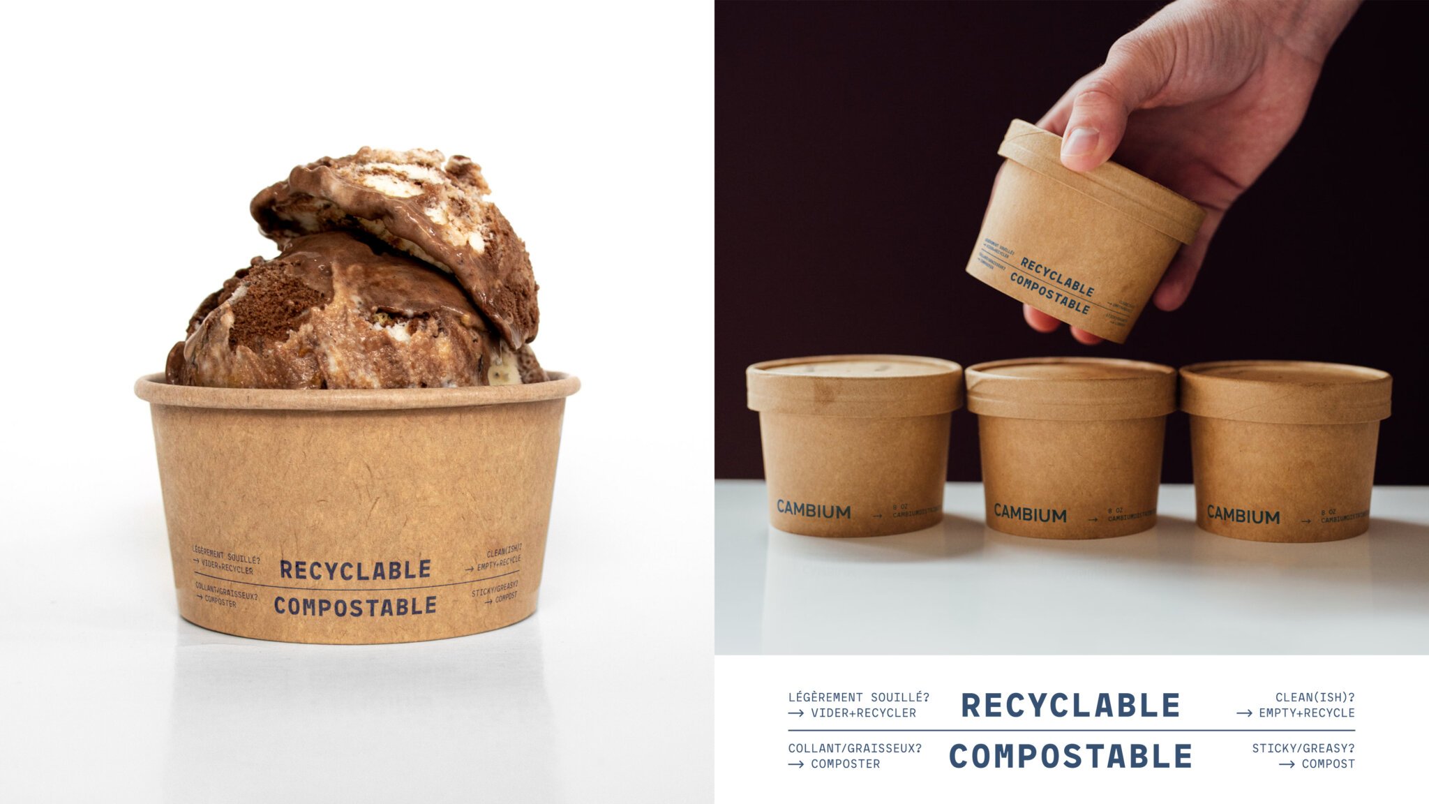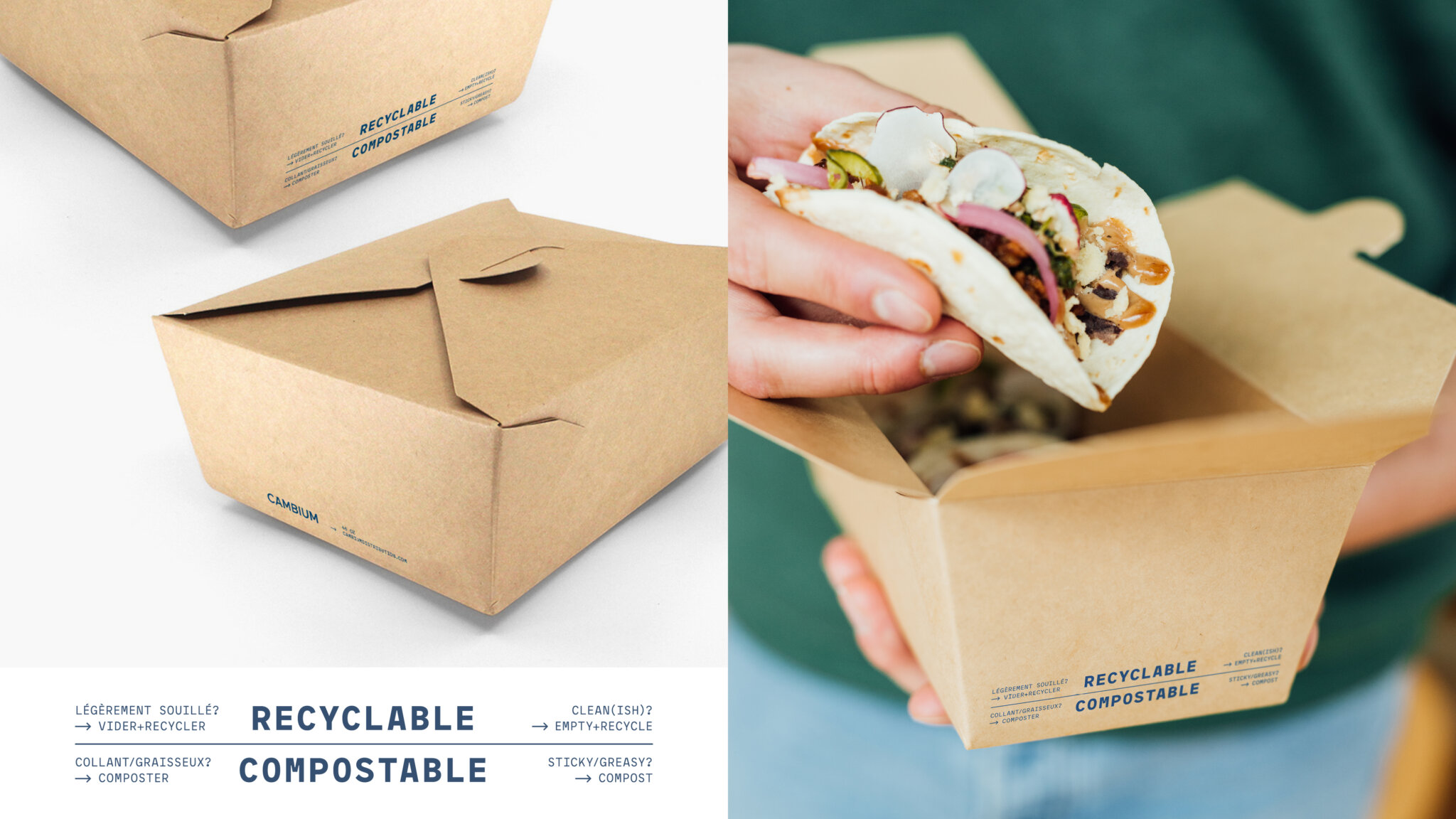 Bien que les municipalités donnent des consignes générales sur les matières à déposer dans les bacs de recyclage, de compostage et de déchets, de nombreux consommateurs restent confus lorsqu’il s’agit de disposer des contenants pour emporter. Pour mettre fin à cette confusion et guider les consommateurs, Cambium propose des instructions de tri directement sur tous ses emballages, pour une meilleure gestion en fin de vie.
