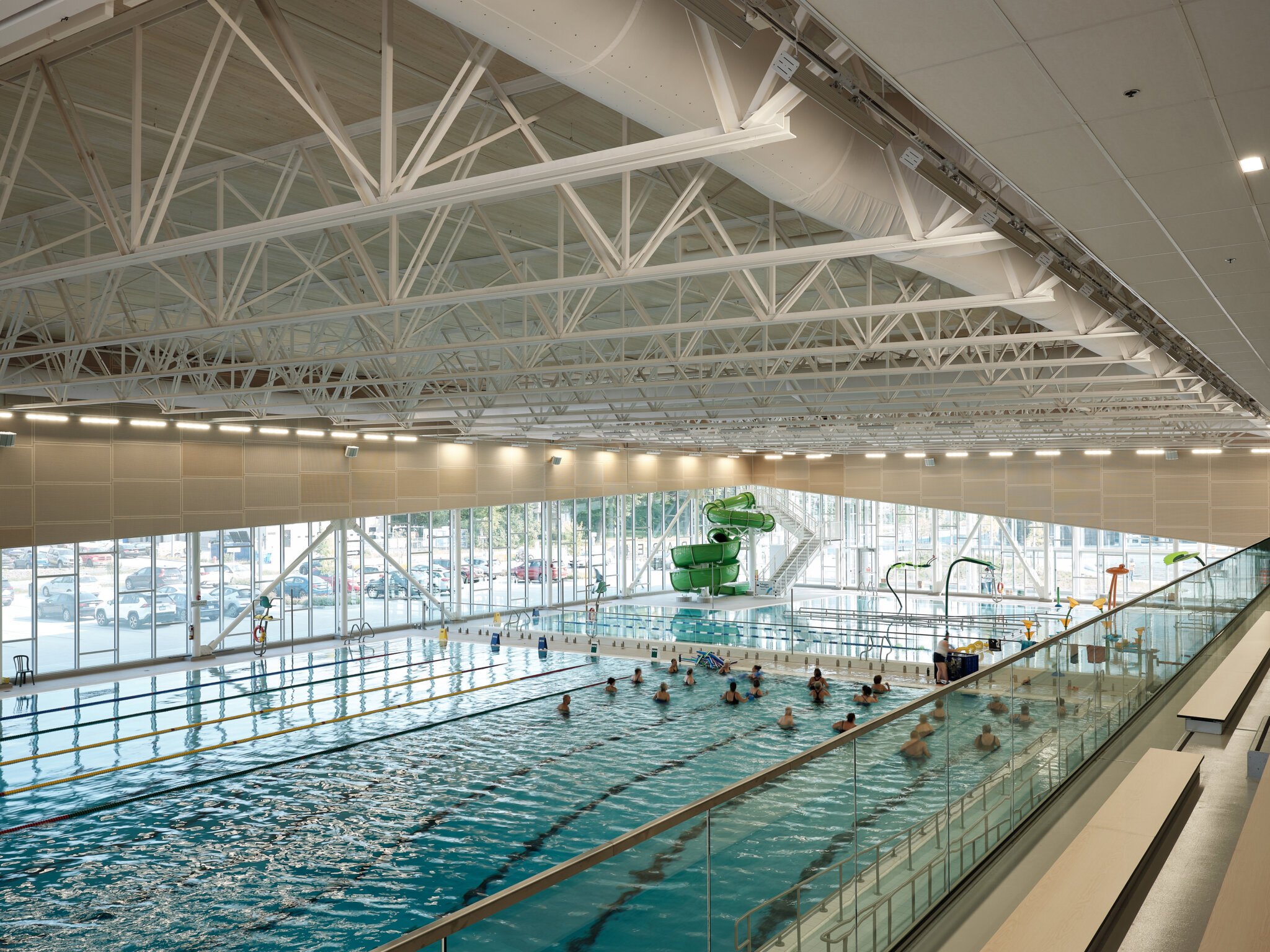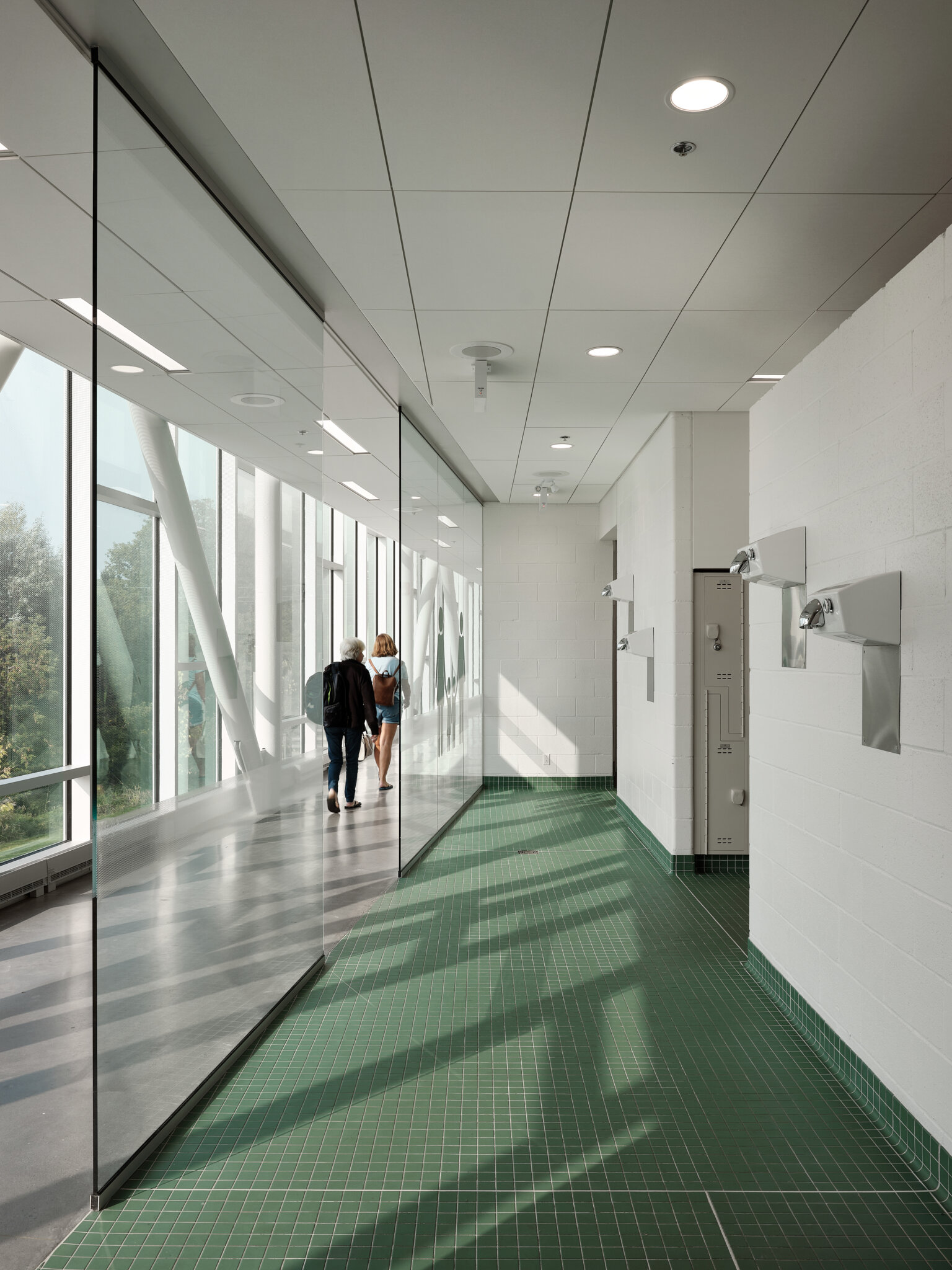 À l’étage, les gradins offrent une vue plongeante vers les bassins et profitent de la lumière naturelle abondante grâce aux fenêtres ceinturant l’enceinte de la piscine. Une aire de repos est également aménagée avec vues sur les bassins, pour les usagers qui préfèrent profiter d’un espace tranquille. Deux salles polyvalentes complètent les espaces de rassemblement public de l’étage où de grandes fenêtres offrent d’un côté des vues directes sur les bassins et de l’autre, sur le ruisseau et les espaces extérieures constituant le pôle récréatif de la ville. Des espaces accueillants et balayés de lumière naturelle s’enchaînent ainsi dans l’ensemble du bâtiment permettant aux usagers de demeurer en contact constant avec le paysage extérieur, peu importe leur emplacement dans le bâtiment.