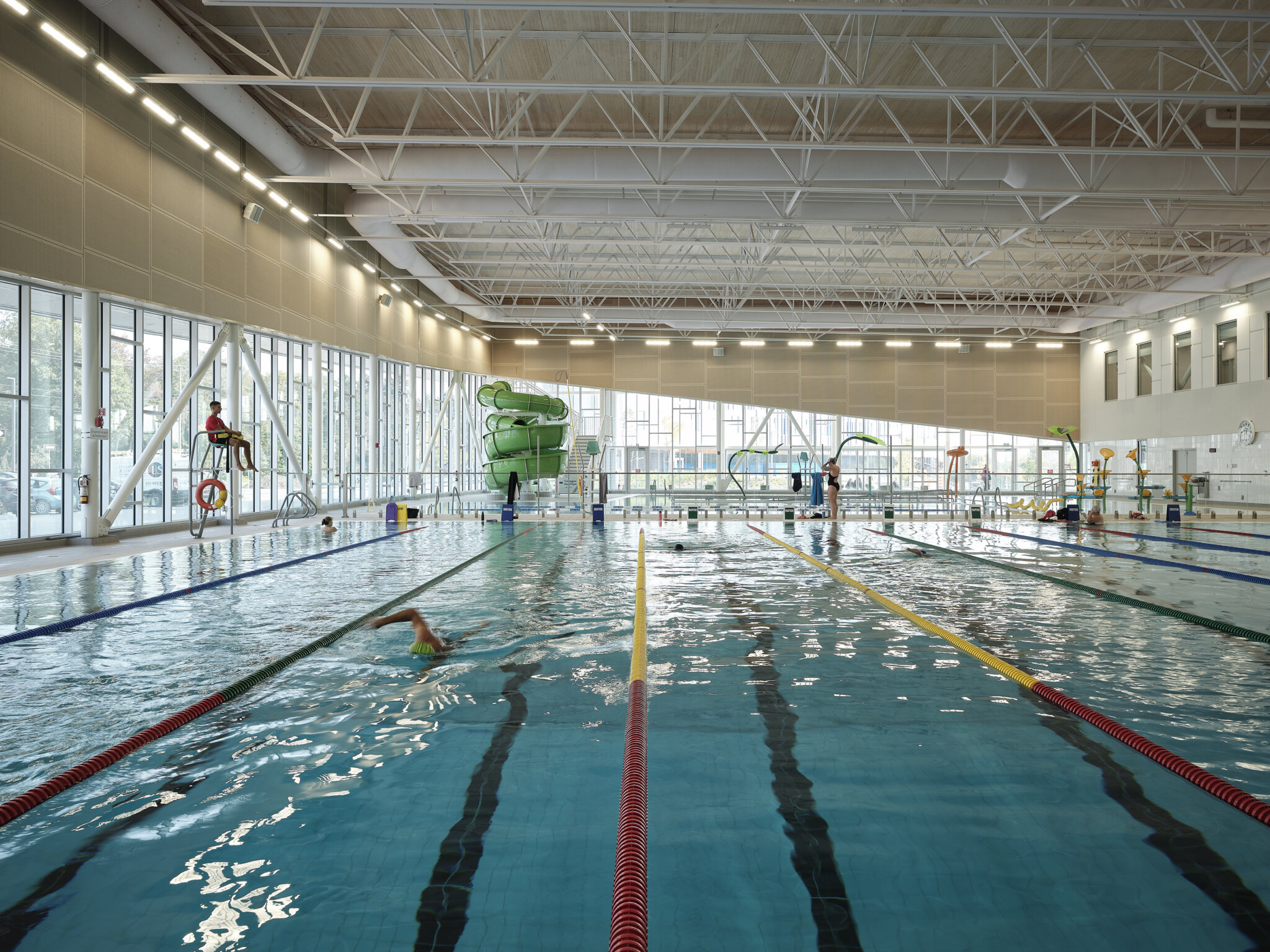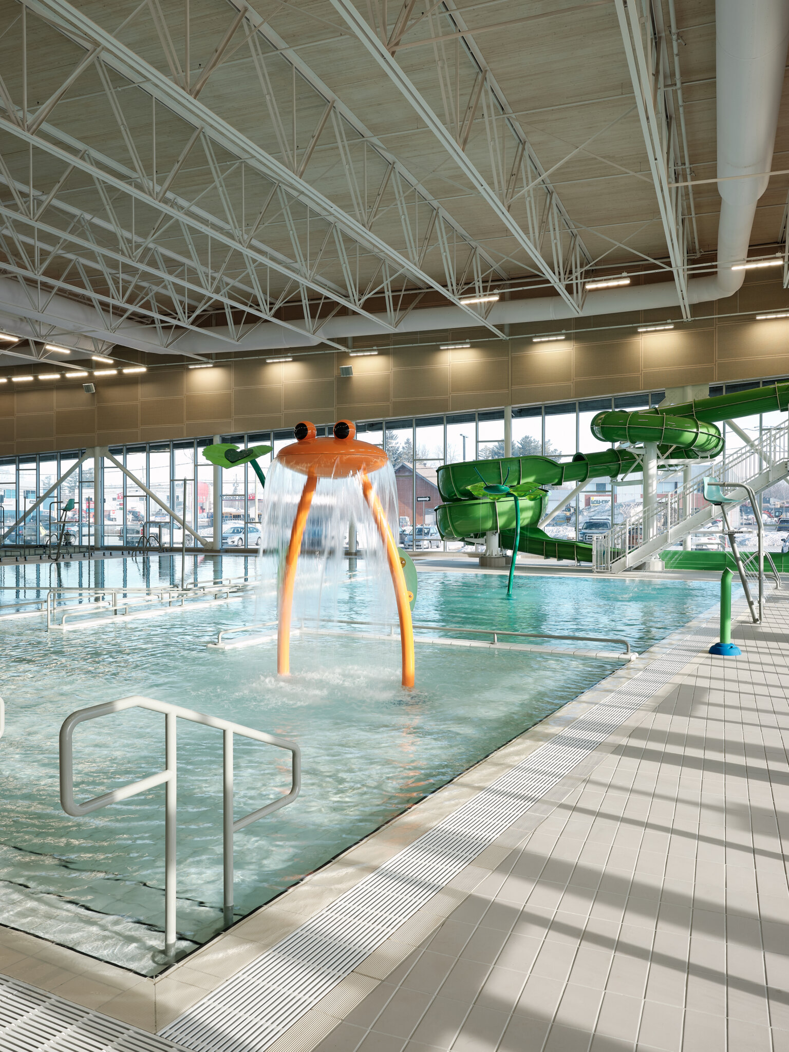Avec ses lignes épurées et résolument contemporaines, le nouveau Centre aquatique de Mirabel s’affirme comme une présence forte dans le quartier. Conçu afin de desservir la population de Mirabel ainsi que les étudiants de l’École secondaire située à proximité, le complexe comprend un bassin de natation de 25m de 10 couloirs, un bassin récréatif, une pataugeoire ainsi que des jeux d’eau et une glissade. Deux vestiaires genrées ainsi qu’un vestiaire universel desservent les usagers. À l’étage, des gradins s’ouvrent sur l’enceinte des bassins et des salles polyvalentes permettent aux citoyens de Mirabel de se retrouver pour des activités en tout genre, le tout dans un environnement baigné de lumière naturelle.