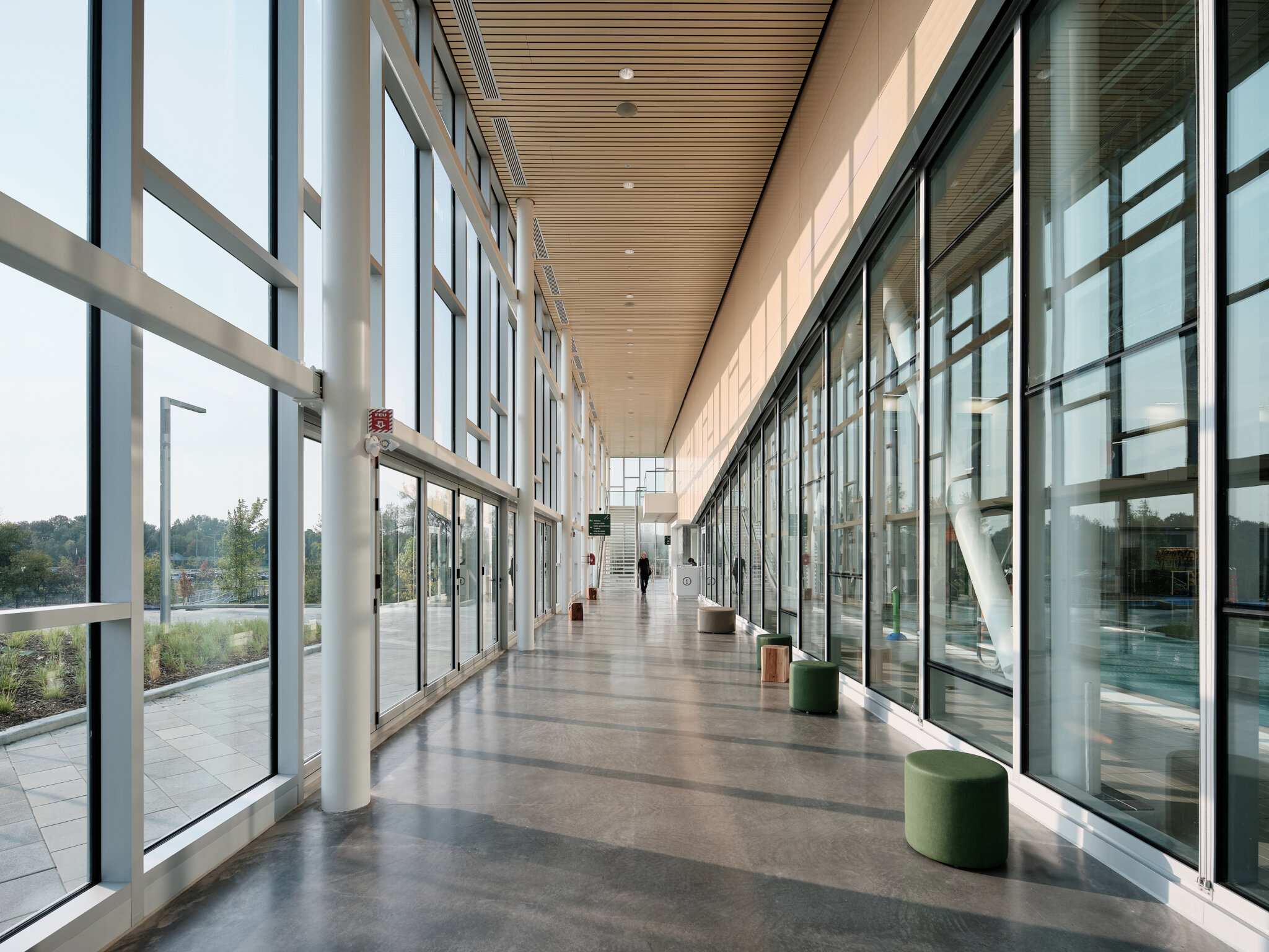Dès l’arrivée sur le site, les sentiers paysagers guident les utilisateurs vers l’entrée du bâtiment, sous une grande marquise revêtue de soffites de bois. En traversant les grandes portes vitrées, les usagers débouchent sur le hall d’entrée, qui s’inspire des porches ceinturant les maisons ancestrales de la région. Avec sa colonnade, et ses grandes baies vitrées cet espace de transition entre intérieur et extérieur devient un lieu de rassemblement informel offrant autant des liens visuels vers l’enceinte des bassins à l’intérieur que vers les aménagements paysagers et la placette publique à l’extérieur. Fenestré de part et d’autre, le porche s’ouvre d’un côté sur les espaces extérieurs aménagés et le ruisseau, et de l’autre, sur l’enceinte de piscine ou les vestiaires. Cette disposition offre aux usagers l’impression de se retrouver à l’extérieur, peu importe où ils se trouvent et peu importe la température extérieure et le temps de l’année.