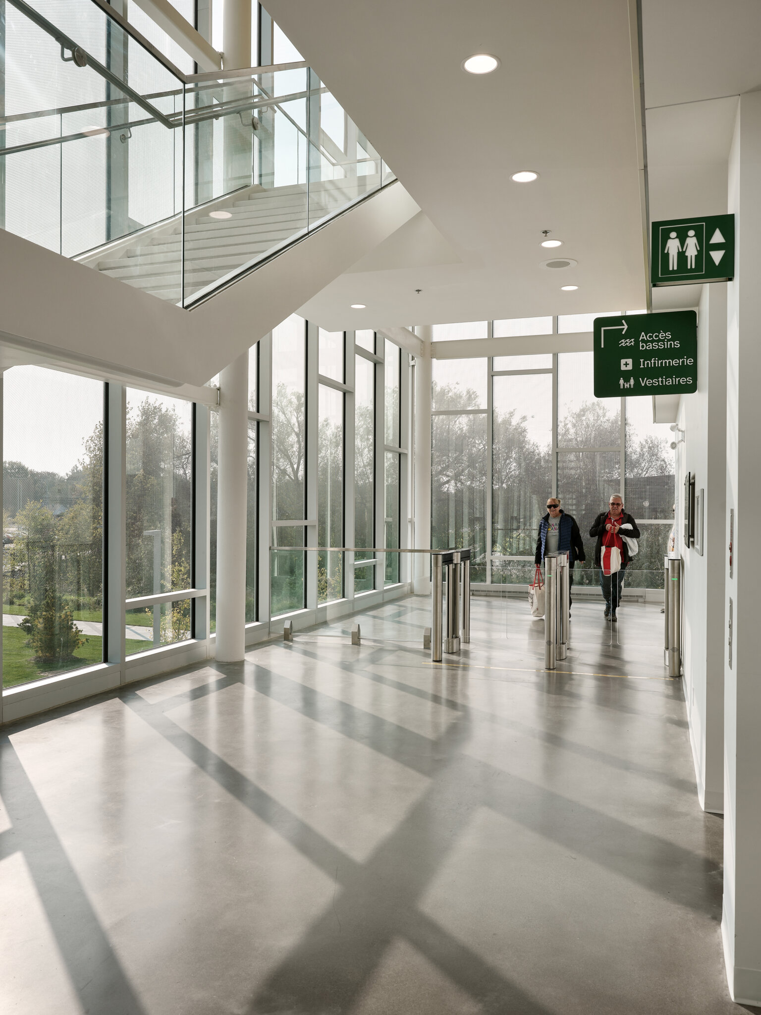 De plus, le bois, retrouvé sur les soffites à l’extérieur, ainsi que sur les plafonds qui agrémentent le hall et l’enceinte des bassins, évoque la nature qui entoure le bâtiment. Il contribue également au bien-être et au confort des usagers grâce aux nombreux bienfaits de la biophilie à l’intérieur des bâtiments. L’enveloppe extérieure est composée, dans la partie basse, de panneaux de béton préfabriqués sur lesquels a été coulé une texture qui rappelle le paysage rural du secteur, vu des airs. La partie haute du bâtiment est quant à elle composée d’un revêtement métallique qui donne plus de légèreté et un aspect contemporain au bâtiment.