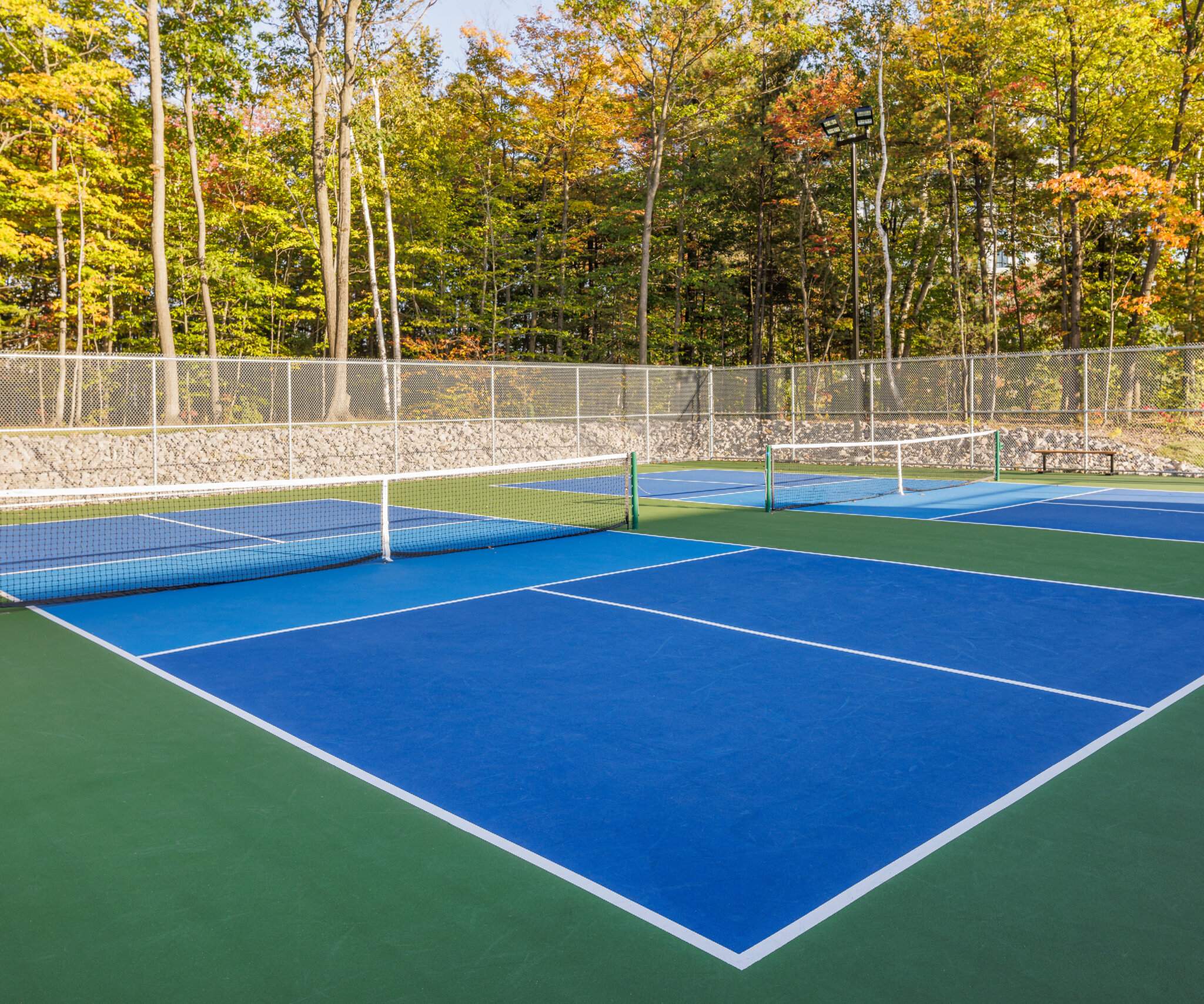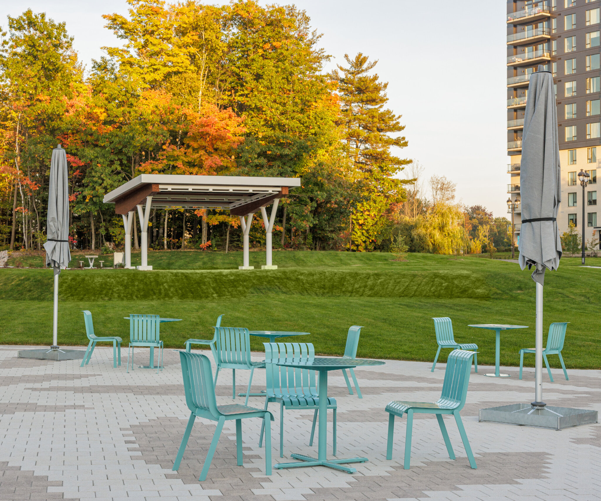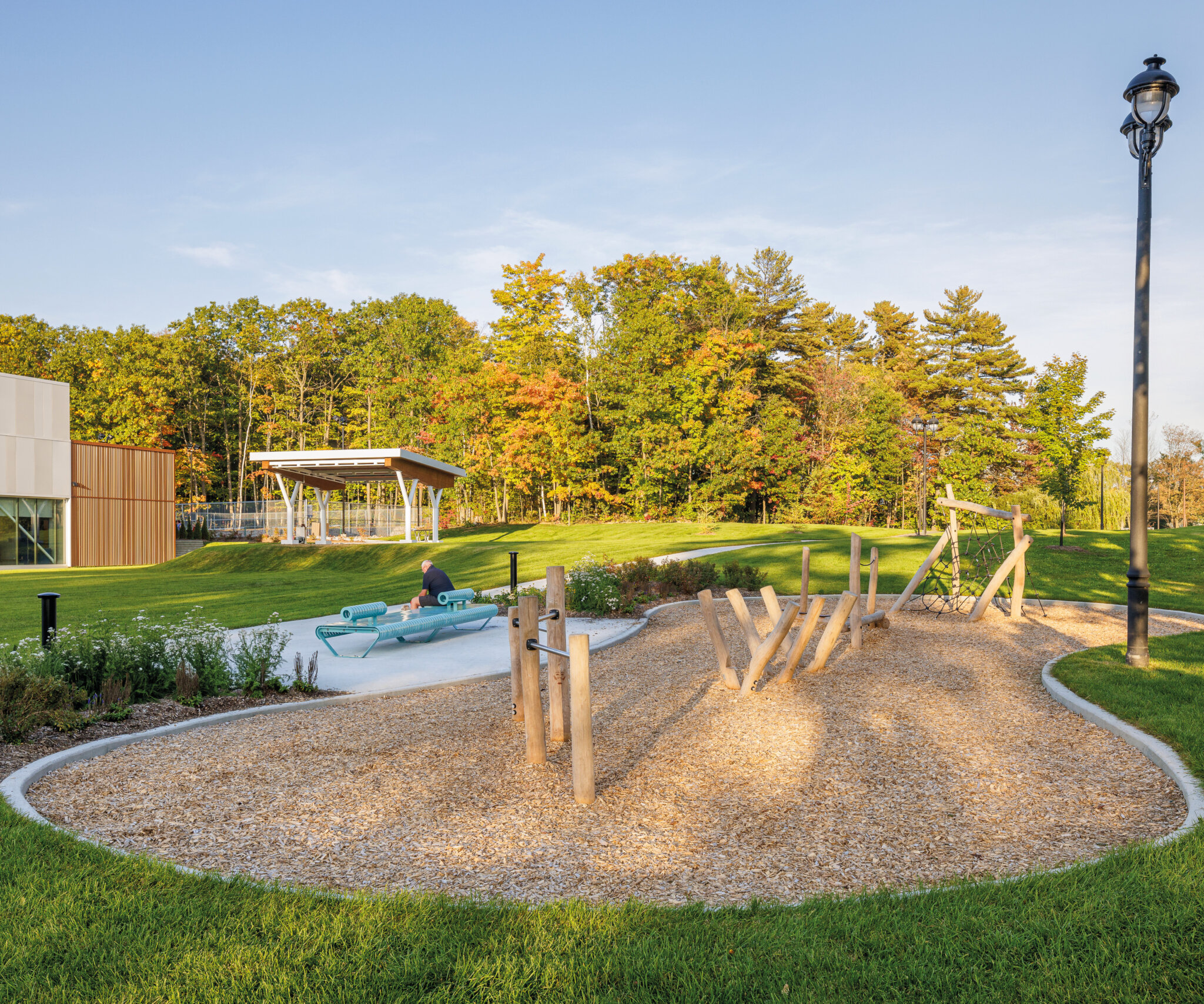 La déminéralisation complète du stationnement avant et la renaturalisation d’une grande partie des surfaces ont permis la création de nouveaux aménagements qui comprennent un espace scénique, de socialisation et de remise en forme sous un préau architectural. Se sont ajoutés à ce programme multigénérationnel des terrains de pickleball judicieusement intégrés pour diminuer le bruit ambiant pour les résidents, des terrains de pétanque, une aire de jeux libres pour enfants avec du mobilier de bois stimulant l’imagination ainsi que des jets d’eau illuminés pour se rafraîchir l’été et pour le plaisir des yeux.