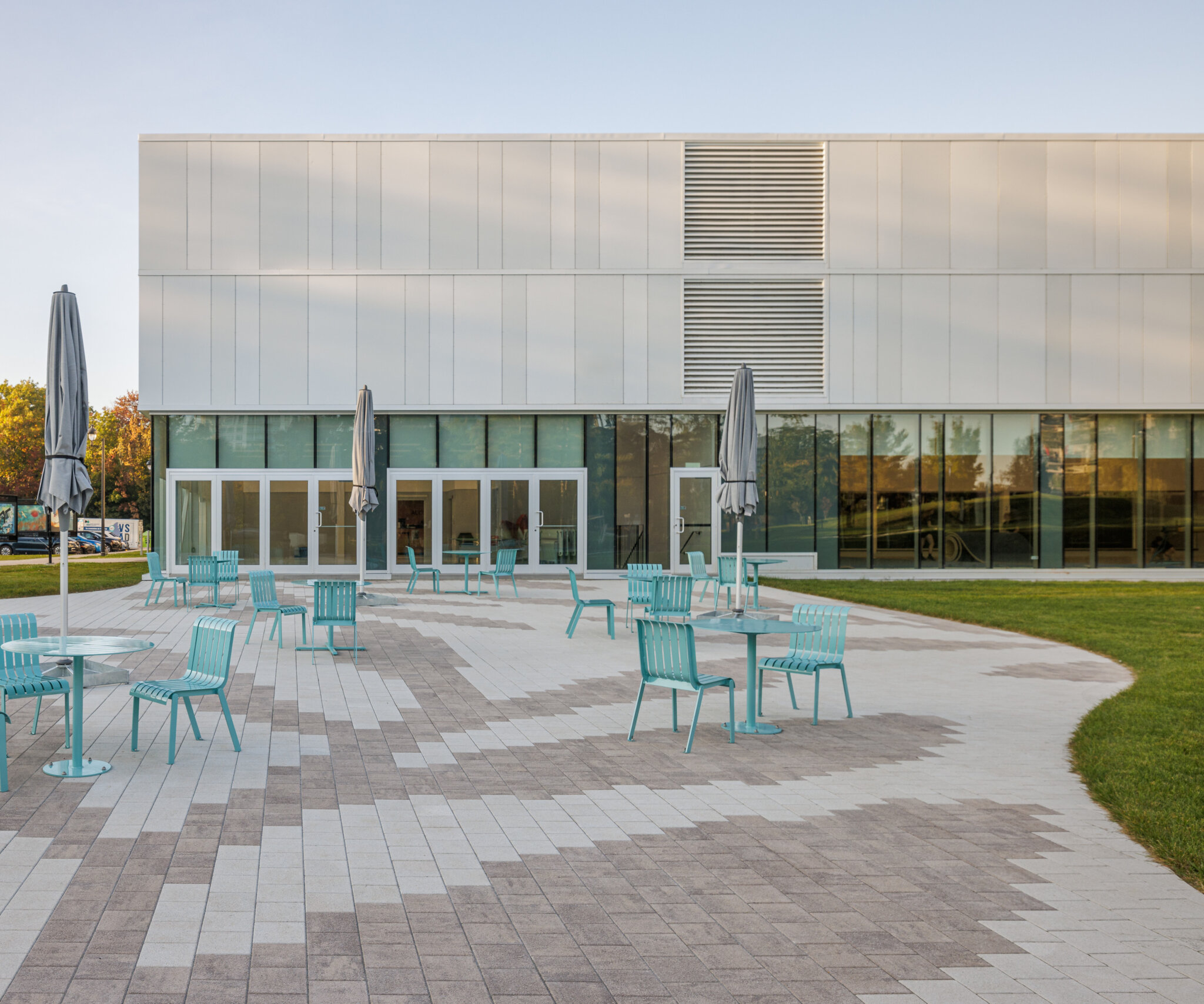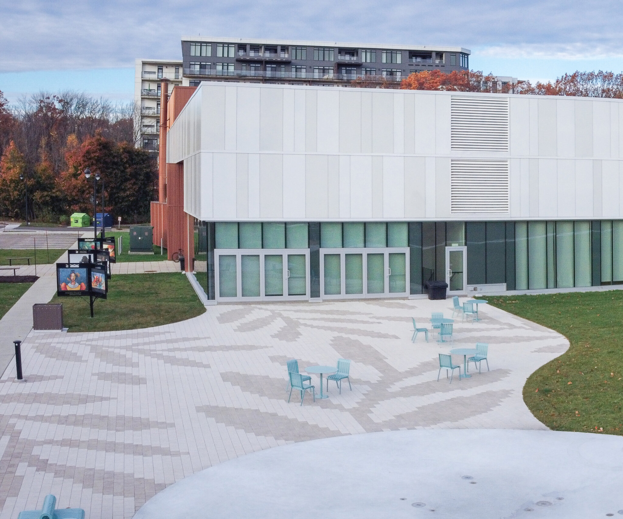 Les professionnels de BC2 ont eu pour mandat d’élaborer, selon une démarche participative et de concertation, un concept d’aménagement ainsi que les plans et devis et la surveillance des aménagements extérieurs de ce nouveau centre intergénérationnel. La réorganisation complète du site extérieur vient créer un lieu fédérateur depuis la placette centrale, laquelle étend ses tentacules vers les différents points d’activités et de contemplation. Les plateformes événementielles, ludiques et les sentiers de transits sont maintenant plus lisibles et accessibles, ce qui permet de répondre aux besoins culturels, sociaux et récréatifs de la population. C’est à l’aide de mobilier urbain contemporain, de motifs et de textures au sol représentant l’univers végétal du site et par la présence d’un grand îlot central de verdure que l’espace multifonctionnel se présente comme un espace ouvert à la population et à la libre appropriation.