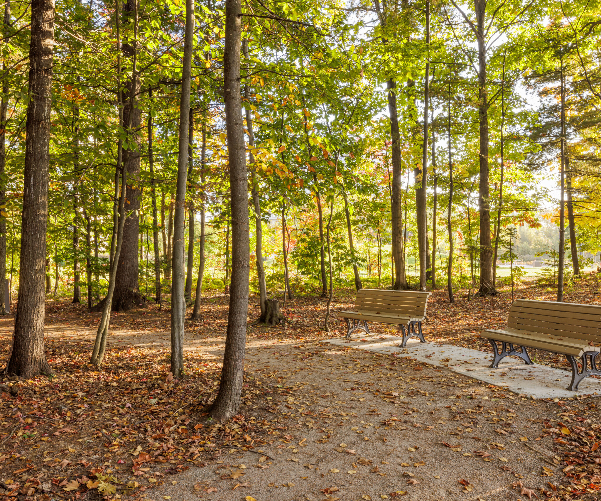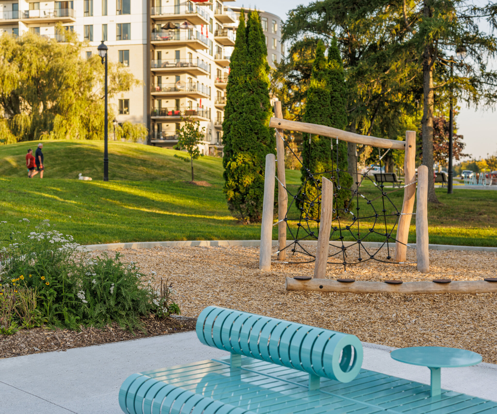 Une attention particulière été portée à la conservation et la mise en valeur d’un boisé mixte, de la friche et de la pinède urbaines existantes qui confèrent une identité et un sentiment d’appartenance importants au sein de la communauté. Les nouveaux sentiers sinueux en milieu naturel, accompagnés de mobiliers, invitent les résidents à y déambuler régulièrement ainsi qu’à utiliser le site durant les quatre saisons. La collaboration multidisciplinaire a donné lieu à des solutions créatives et durables dans la récupération du déblai pour la confection de la topographie du site et afin de créer une coupure avec les espaces privés et l’urbanité de la ville. De plus, une butte de glisse a été créée afin de bonifier l’offre d’activités hivernales.