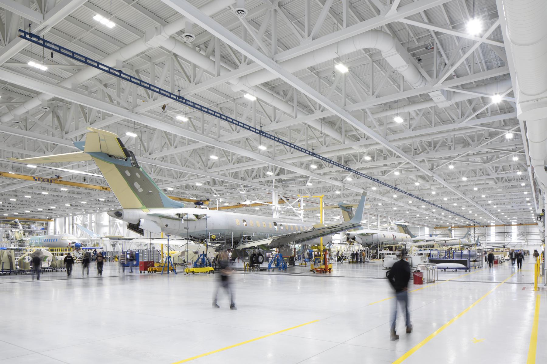 La nouvelle unité de production permet un assemblage accéléré des avions, tout en offrant une vue sur l’ensemble du processus de fabrication et de mise à l’essai. L’organisation spatiale facilite la coordination entre les équipes spécialisées et les éléments automatisés, créant un environnement de production performant, précis et sécuritaire. Des exigences techniques rigoureuses ont mené à des stratégies performantes en matière d’efficacité énergétique et de réduction des déchets, en cohérence avec les engagements environnementaux de Bombardier.