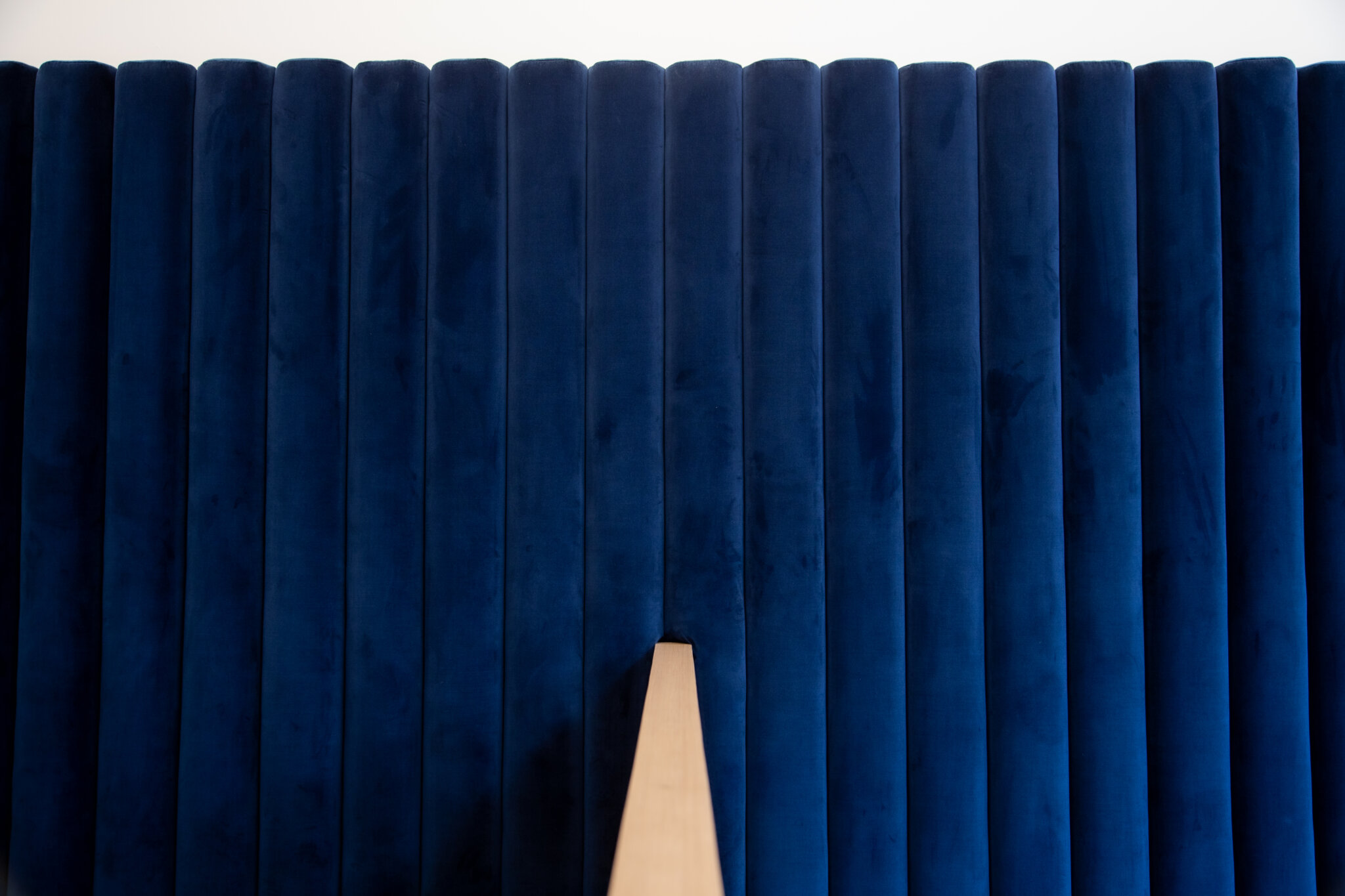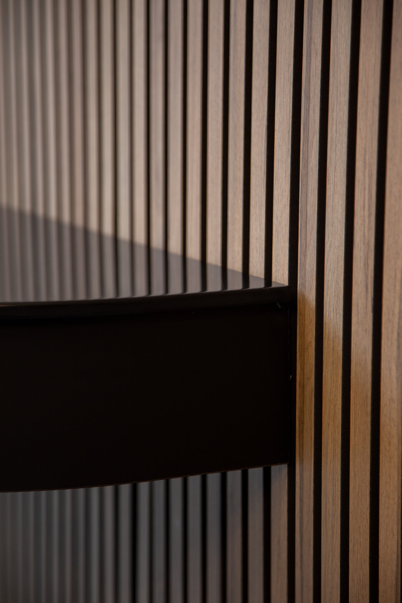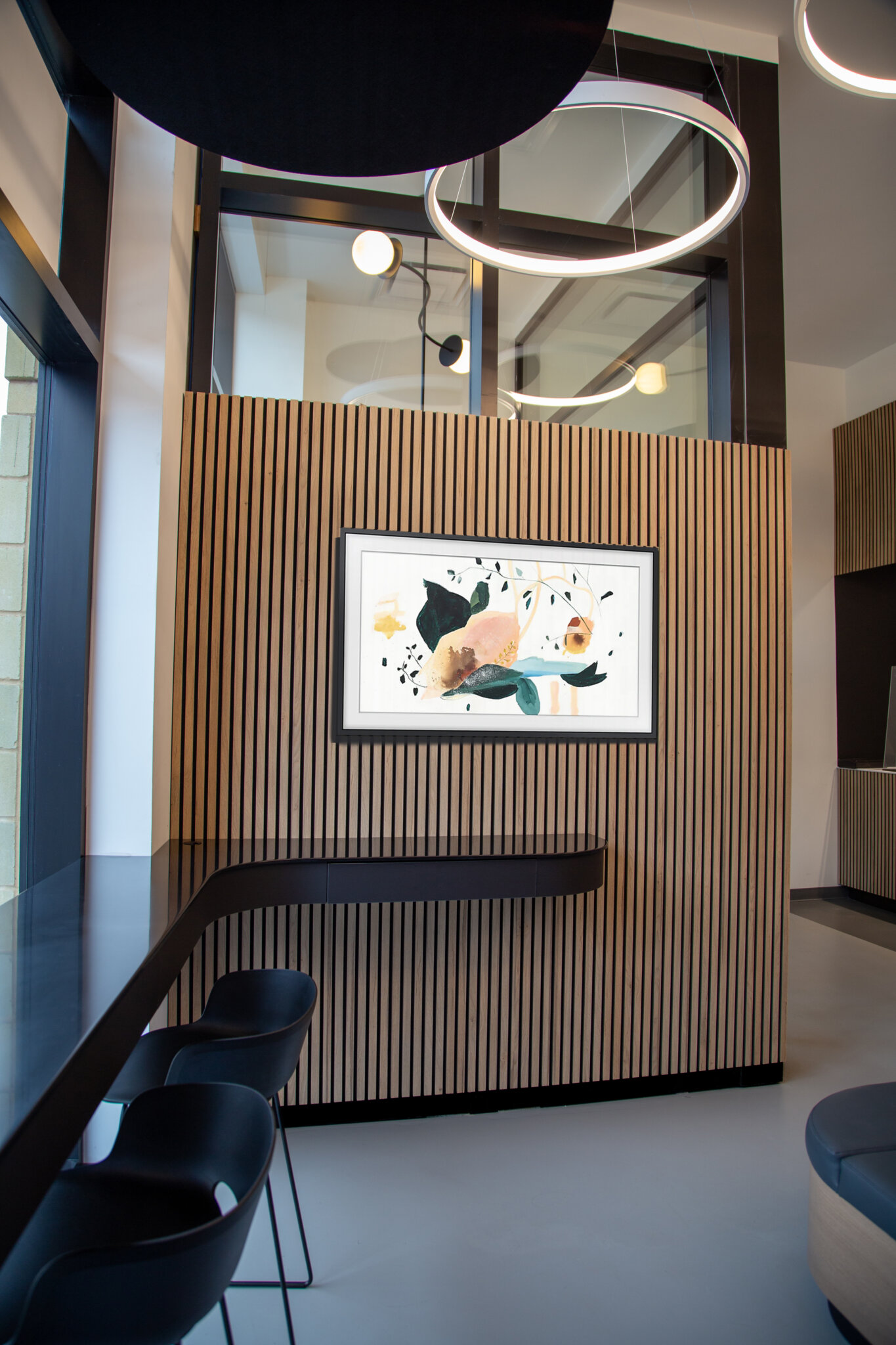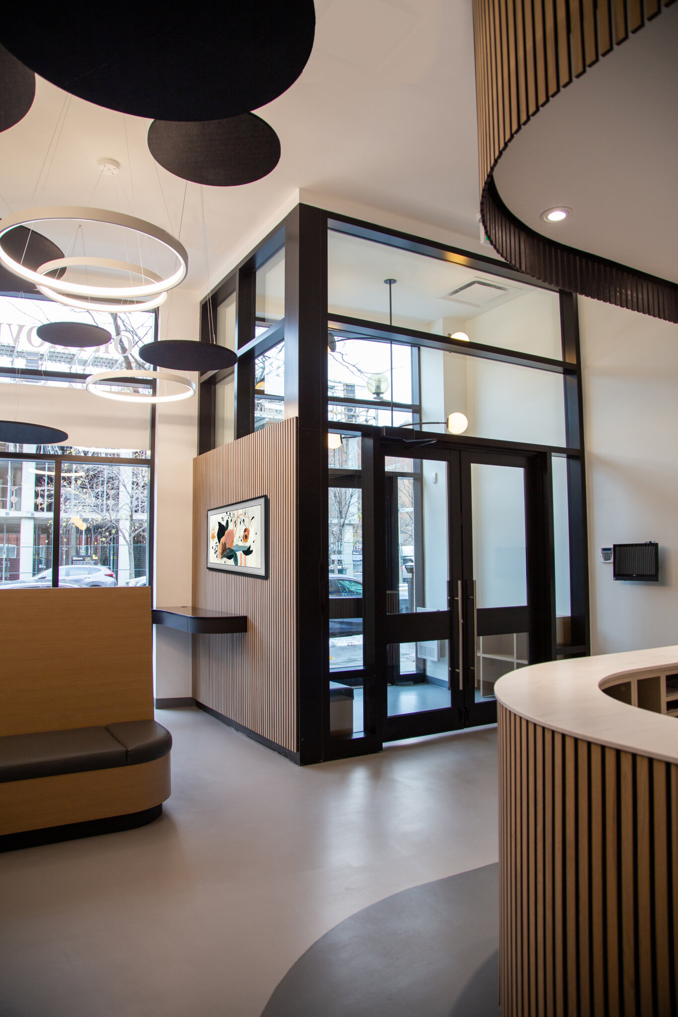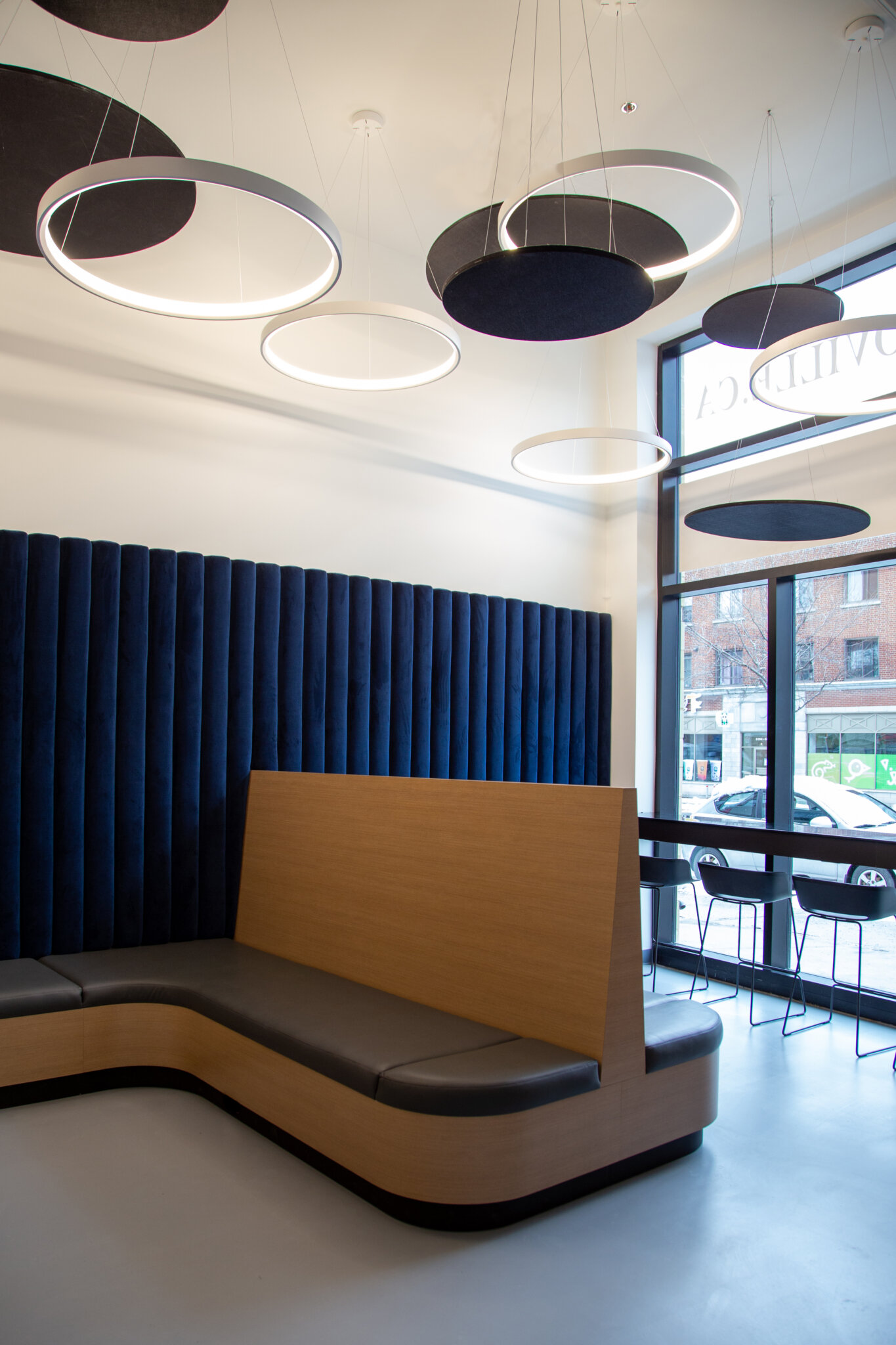 L’acoustique a été un défi de conception supplémentaire. Les plafonds étant très haut dans la partie avant du local, jumelé au sas d’entrée en verre et au béton du plancher, il était important d’intégrer des matières qui absorbent le son, afin de conserver le niveau de confidentialité requis dans la clinique. L’utilisation des lattes de bois et des panneaux en feutre aux propriétés acoustiques, ainsi que le haut dossier rembourré dans l’aire d’attente, a contribué à régler cet enjeu.