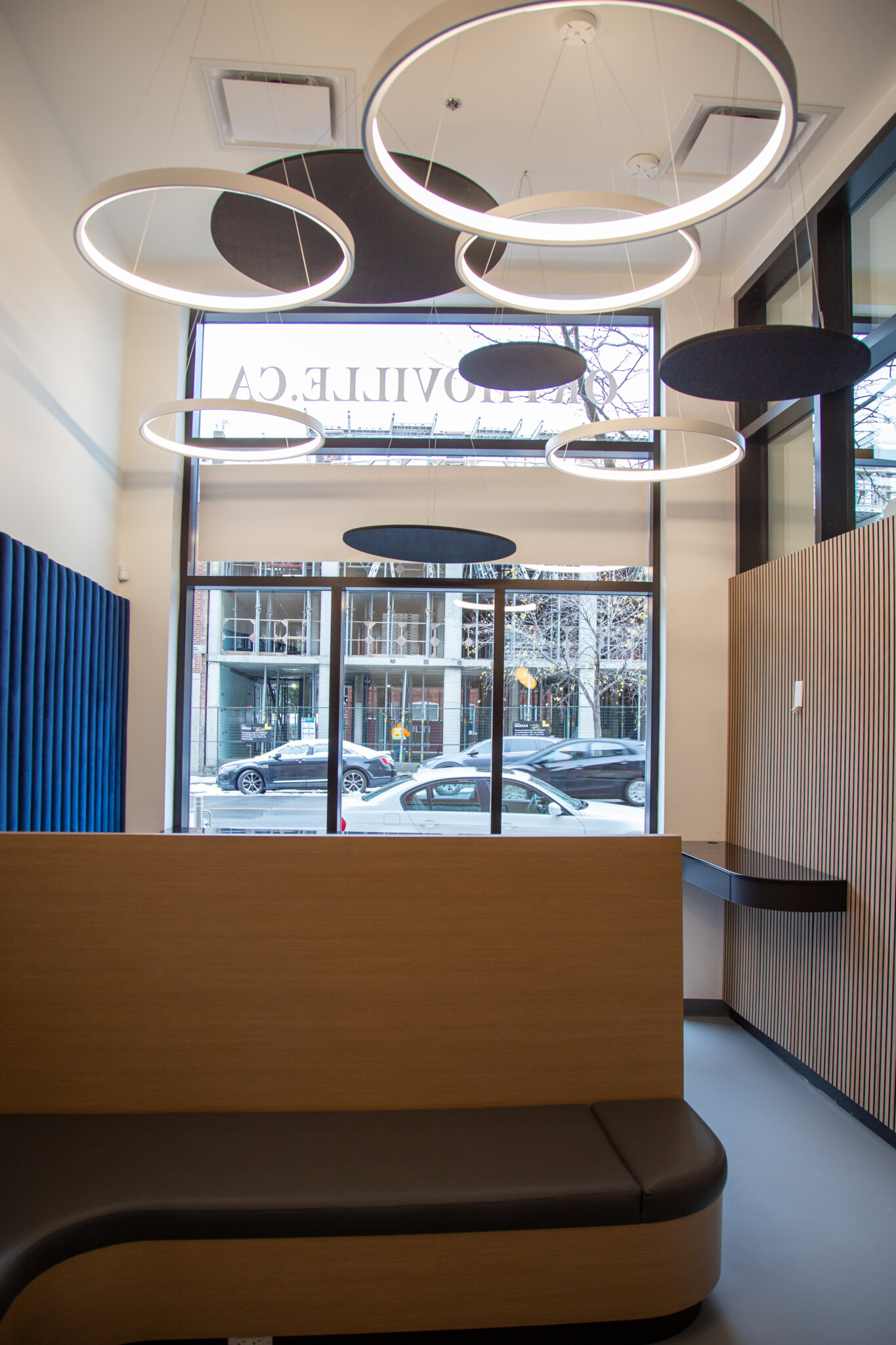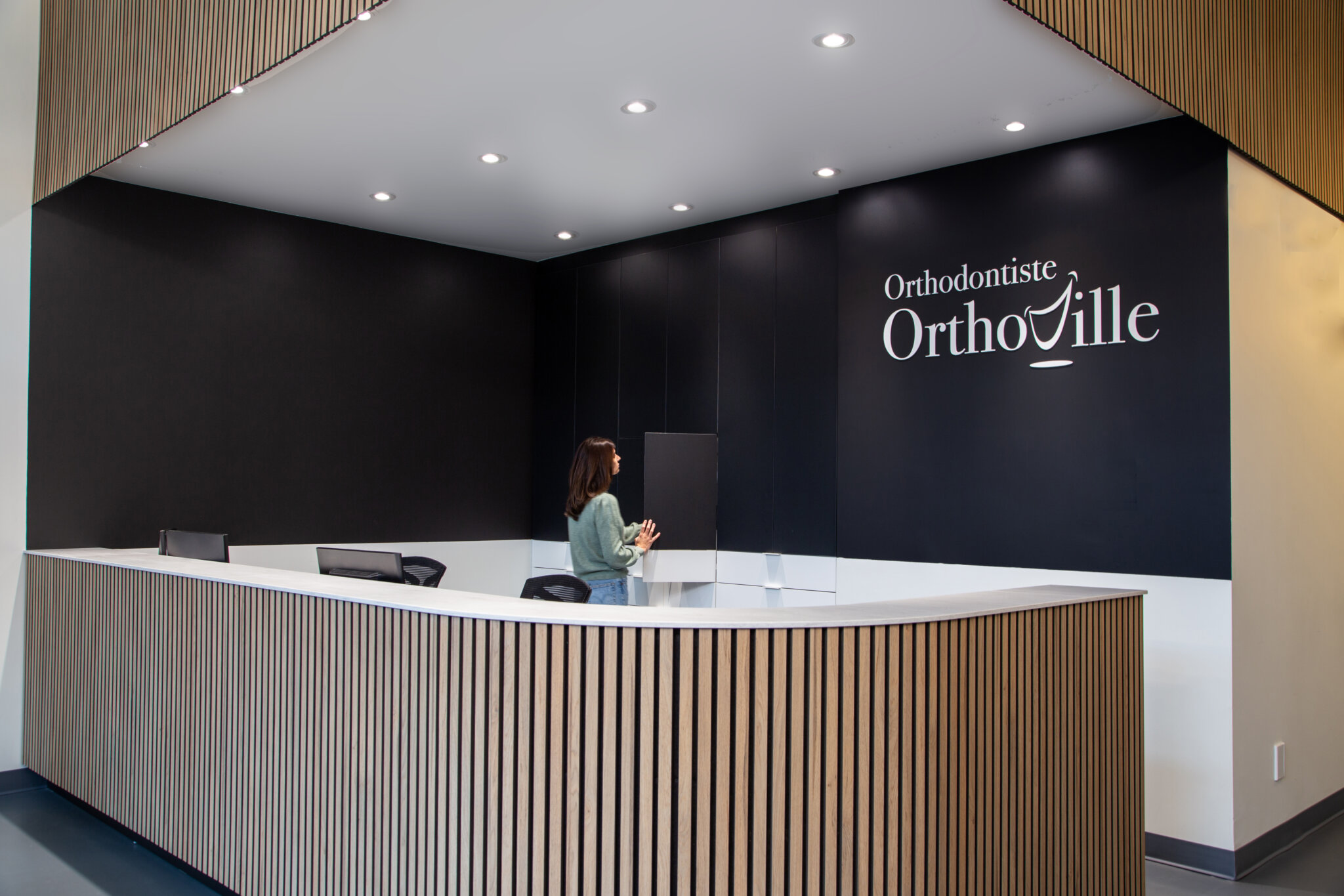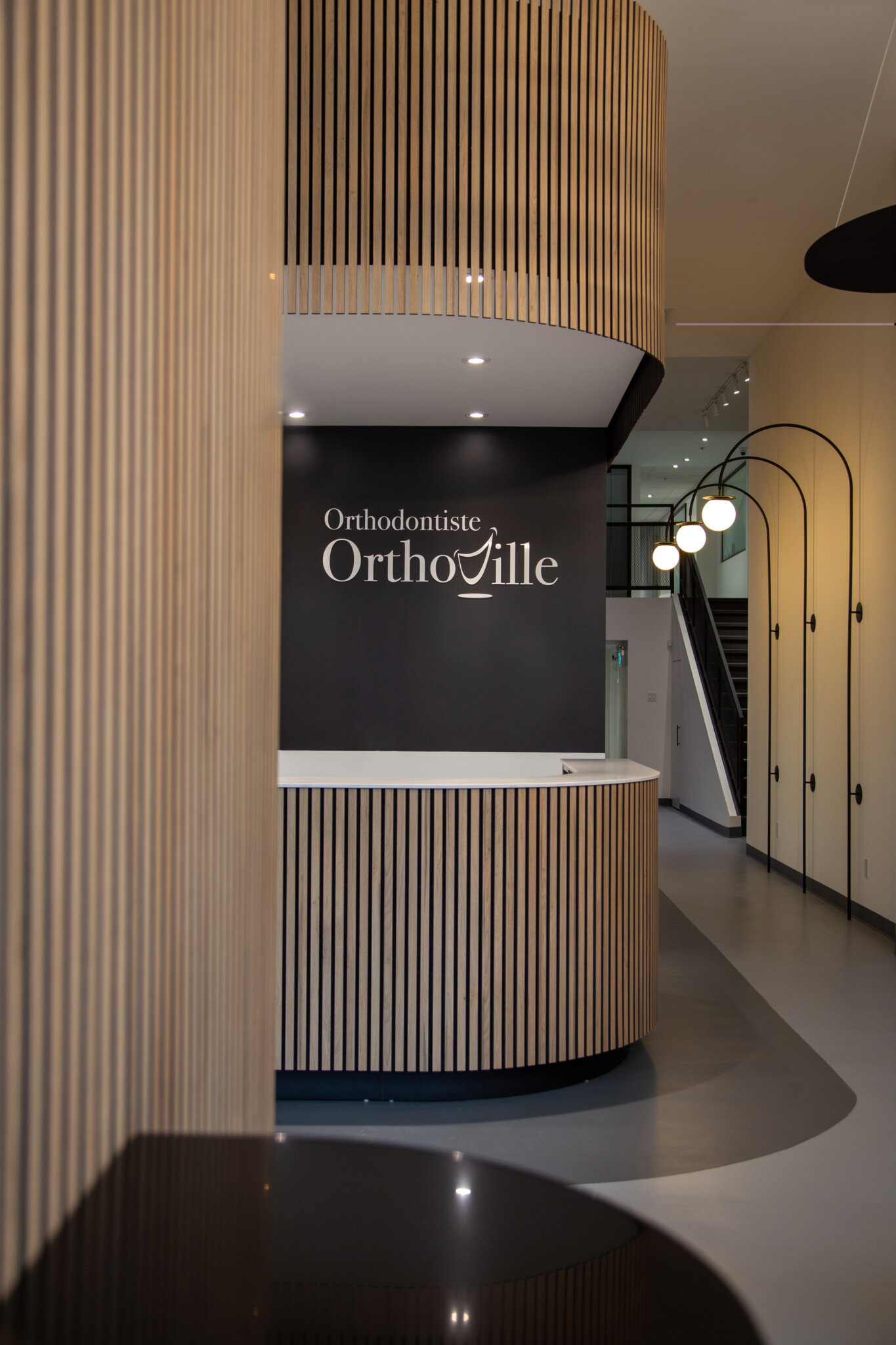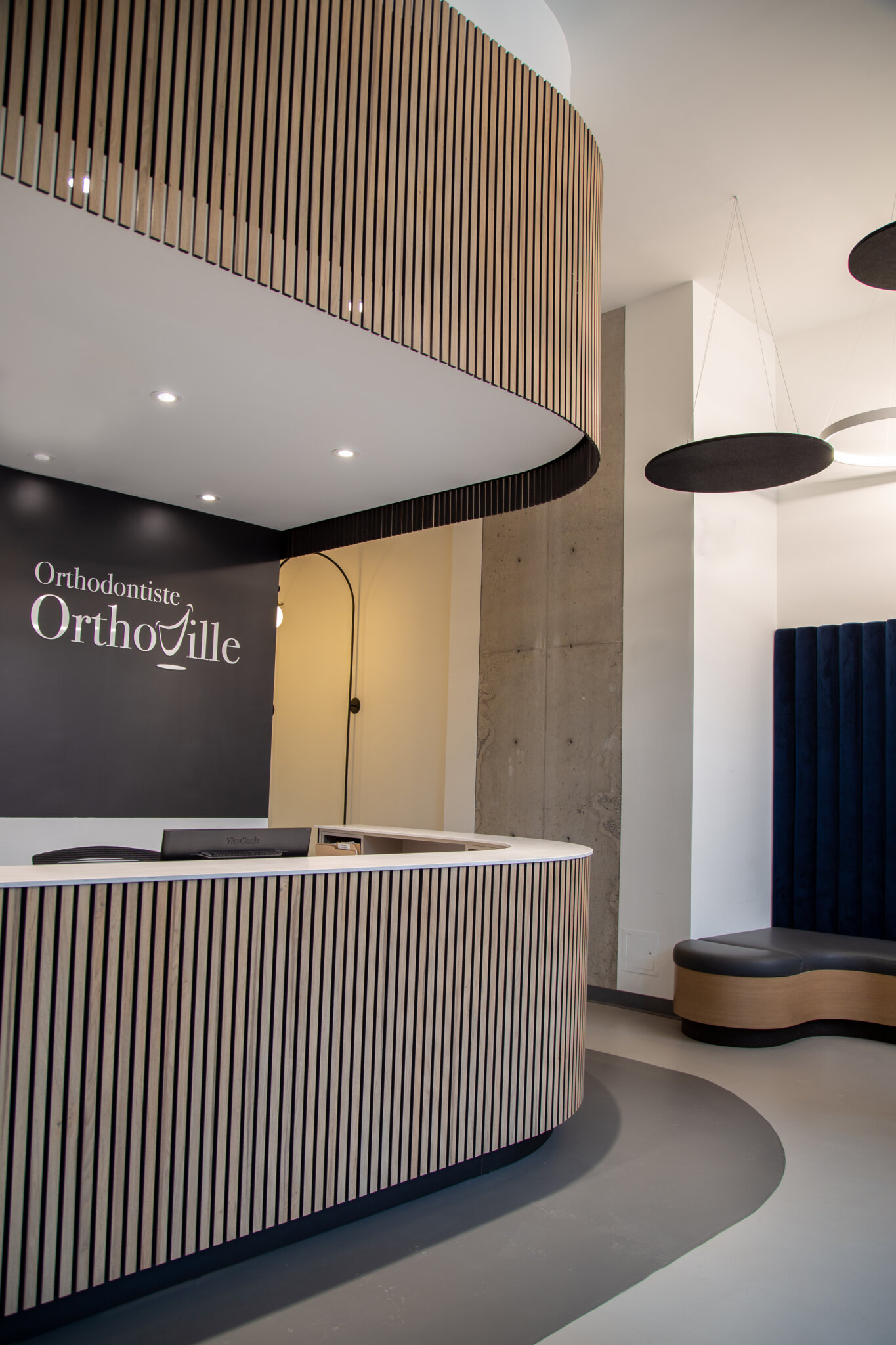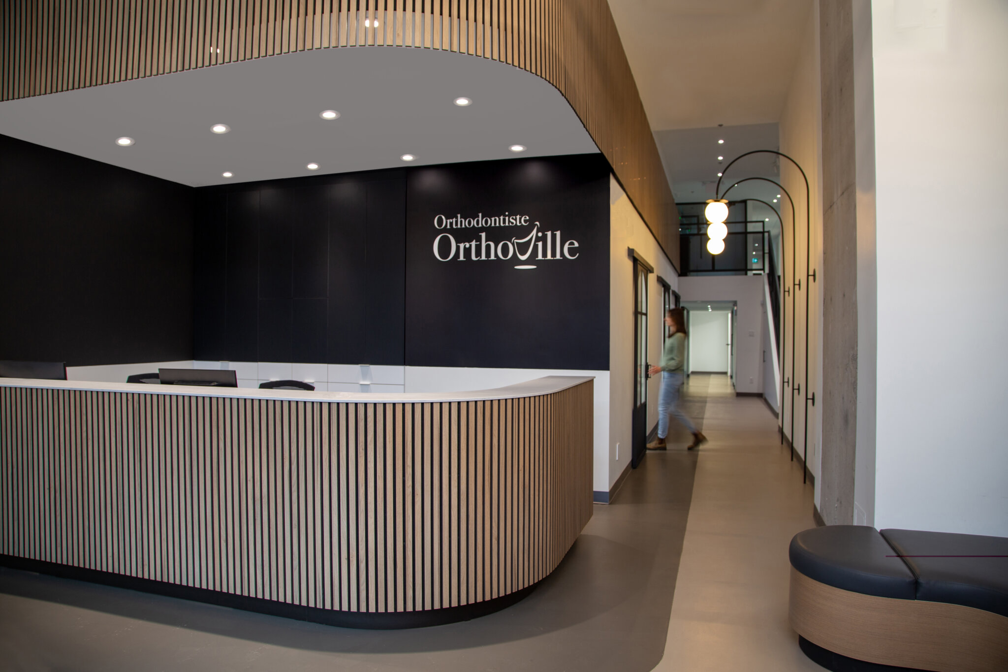 La clinique d’orthodontie Orthoville se situe dans Westmount, sur une artère commerciale. Le propriétaire a fait le choix d’un local ayant pignon sur rue, motivé par son emplacement idéal et par son abondante fenestration en façade. Le mandat pour ce projet était de créer un espace invitant qui s’éloigne d’un environnement aseptisé que l’on peut associer parfois au milieu médical. Le lieu fut donc réfléchi pour évoquer un sentiment de convivialité en tirant profit des atouts architecturaux de la bâtisse.