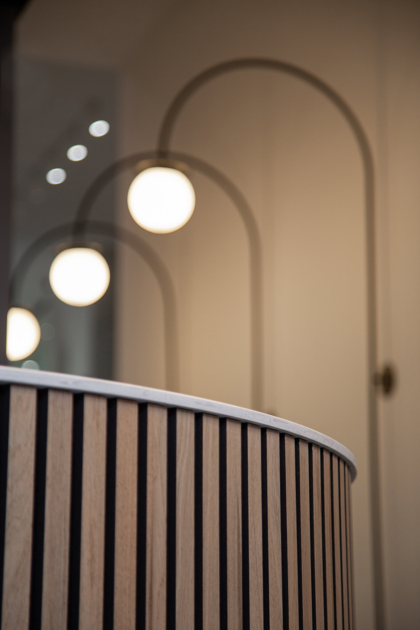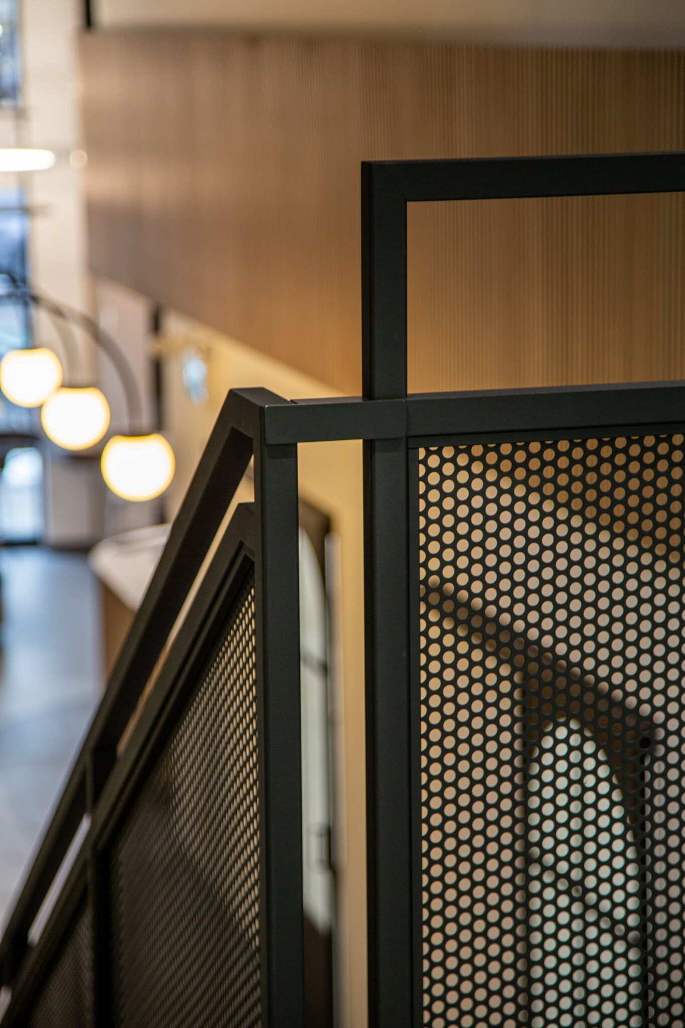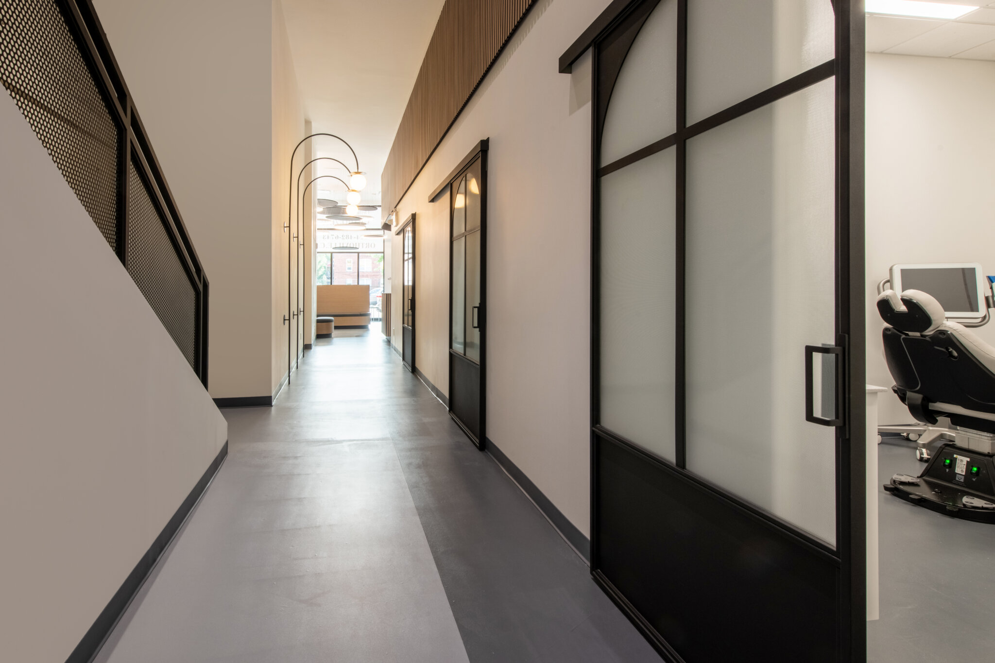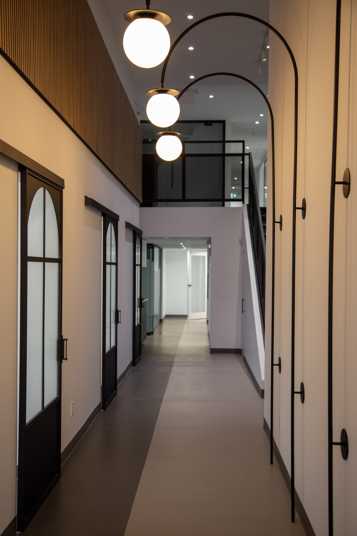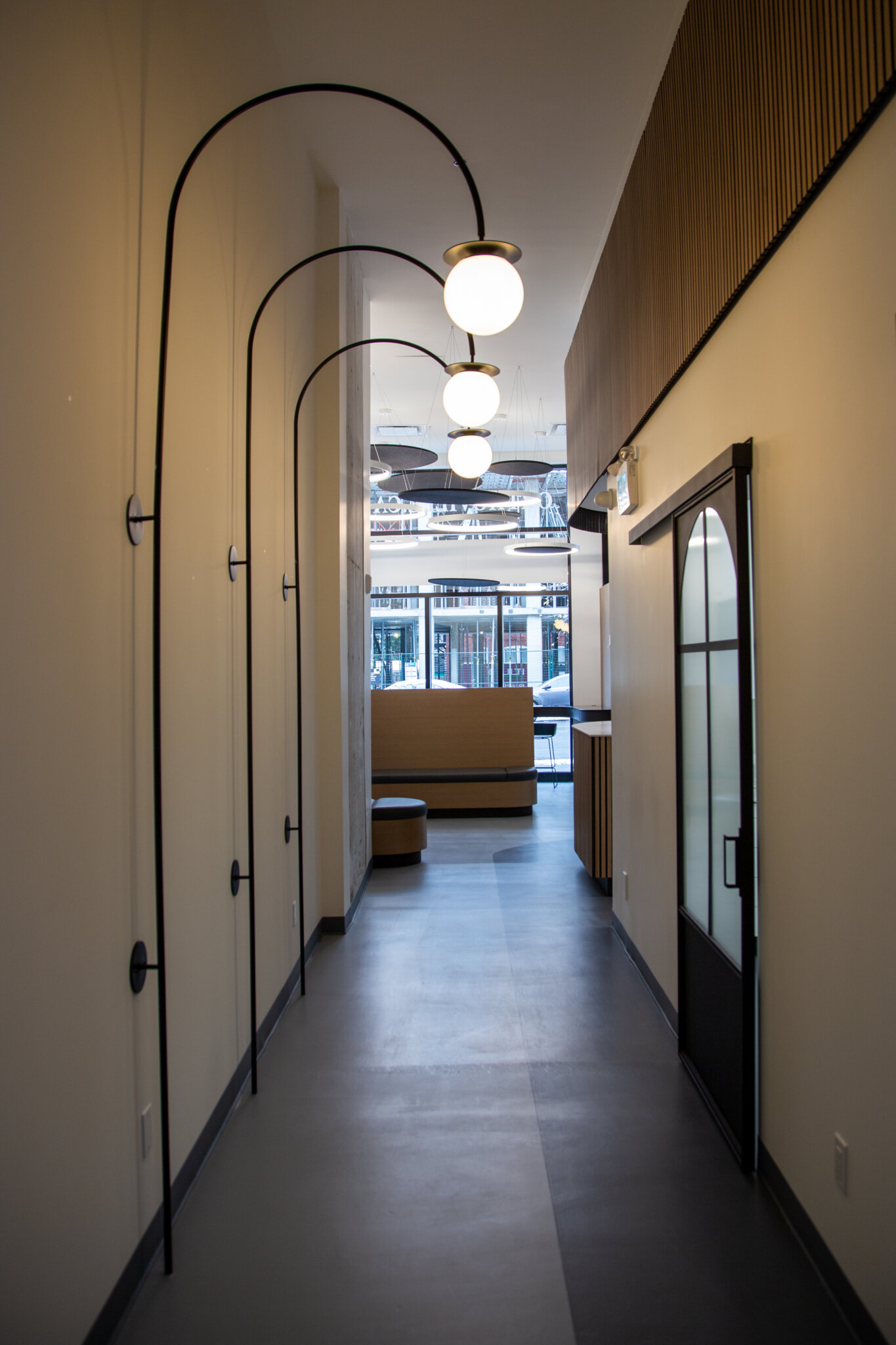 La disposition sur deux niveaux comportait des défis d’aménagement pour assurer une cohésion entre les différents services et besoins de la clinique. Pour pallier cette problématique, l’espace a été divisé de façon à regrouper les services rapides au rez-de-chaussée et à positionner les traitements plus longs à l’étage. Le corridor qui transite entre la réception et la mezzanine au premier niveau a été traité de façon à créer un lien entre les différentes zones de la clinique. Ce qui a motivé l’aménagement du corridor était l’intention de tirer profit d’un lieu de passage pour y intégrer l’image de marque de la clinique. On y retrouve donc quelques éléments tirés du contexte de la ville, qui font référence au nom de la clinique. Les luminaires s’inspirent des courbes des lampadaires, alors que le jeu de répétition des portes d’acier est à l’image d’une rue commerçante. Le contexte est donc évoqué autant par les formes que par la matière. Afin d’ajouter au caractère singulier, ces éléments sur mesure ont été réalisé en collaboration avec quelques artisans locaux.