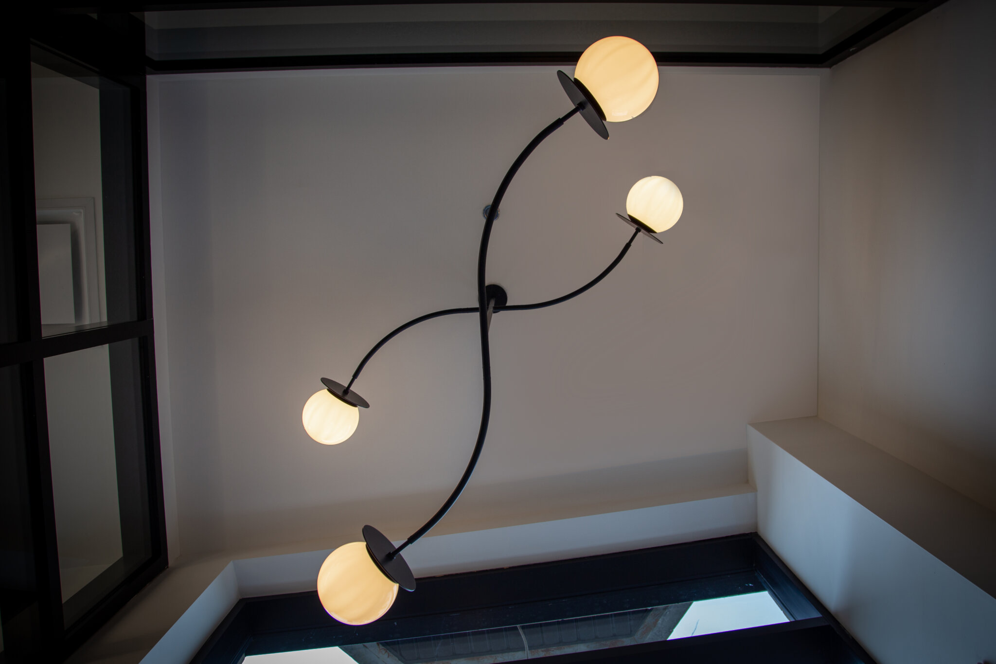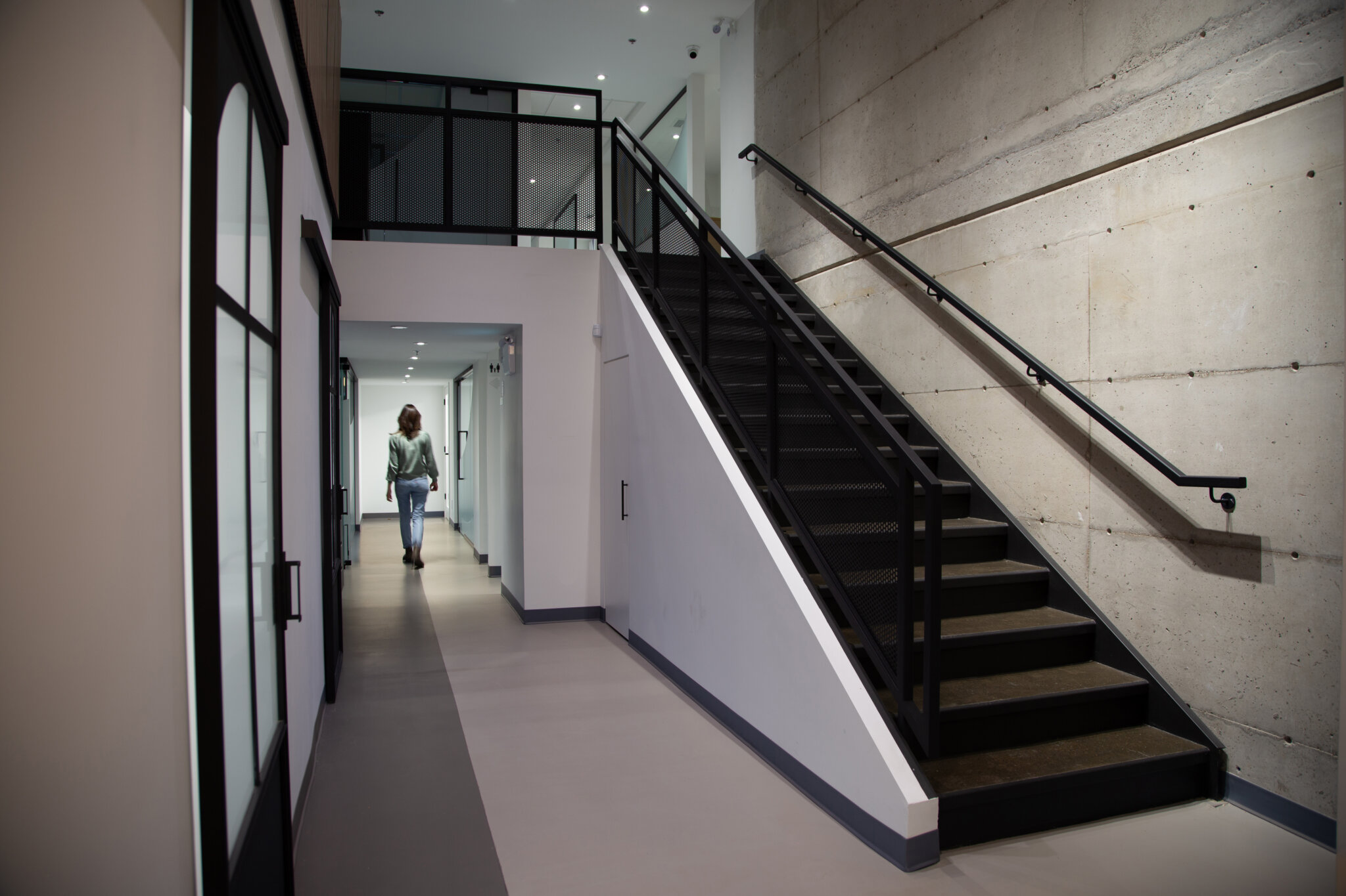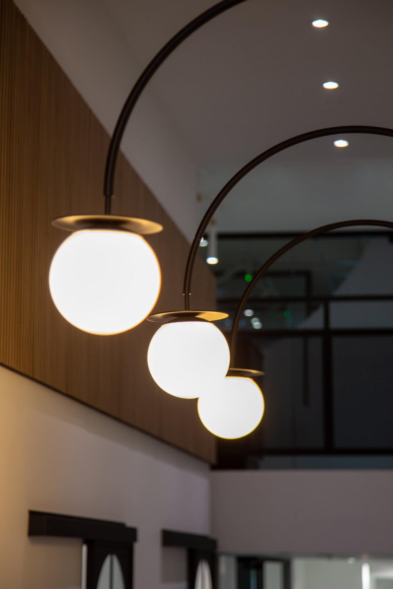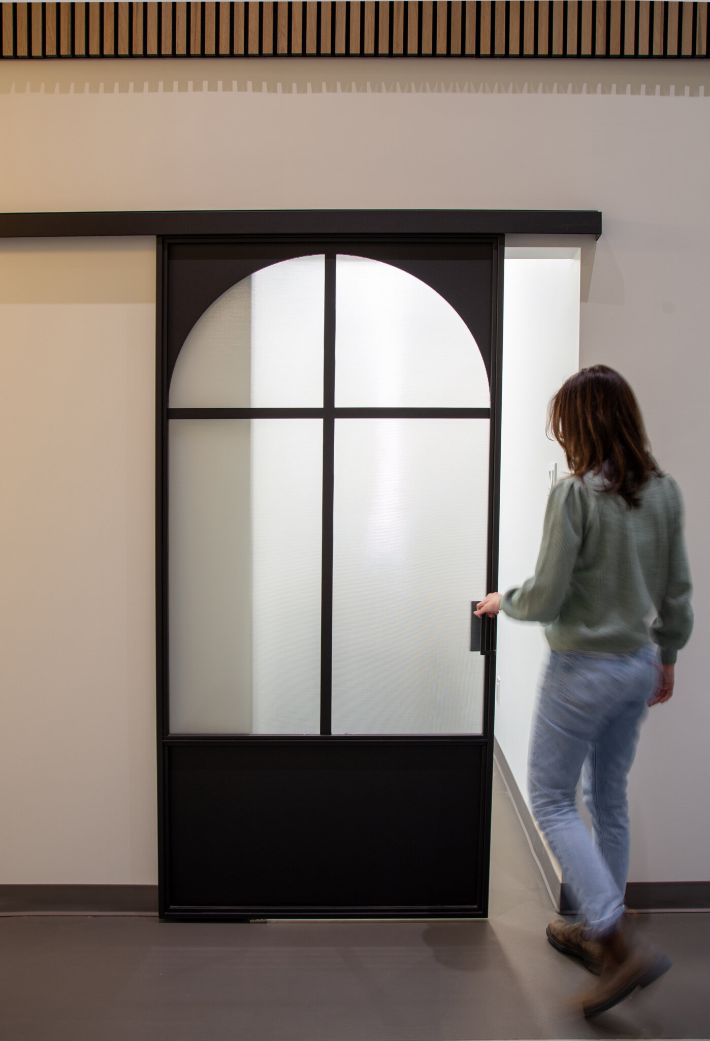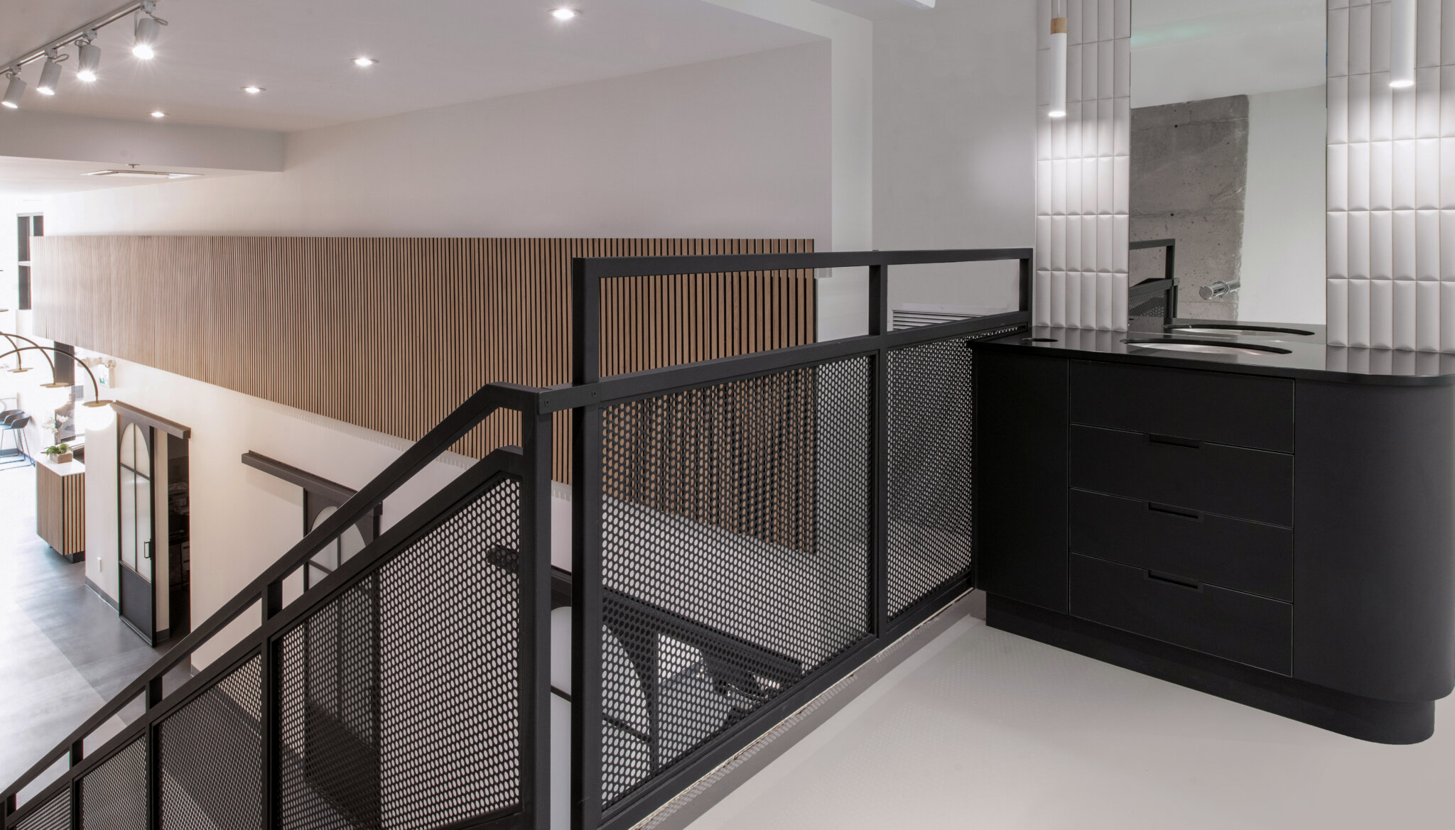 La disposition sur deux niveaux comportait des défis d’aménagement pour assurer une cohésion entre les différents services et besoins de la clinique. Pour pallier cette problématique, l’espace a été divisé de façon à regrouper les services rapides au rez-de-chaussée et à positionner les traitements plus longs à l’étage. Le corridor qui transite entre la réception et la mezzanine au premier niveau a été traité de façon à créer un lien entre les différentes zones de la clinique. Ce qui a motivé l’aménagement du corridor était l’intention de tirer profit d’un lieu de passage pour y intégrer l’image de marque de la clinique. On y retrouve donc quelques éléments tirés du contexte de la ville, qui font référence au nom de la clinique. Les luminaires s’inspirent des courbes des lampadaires, alors que le jeu de répétition des portes d’acier est à l’image d’une rue commerçante. Le contexte est donc évoqué autant par les formes que par la matière. Afin d’ajouter au caractère singulier, ces éléments sur mesure ont été réalisé en collaboration avec quelques artisans locaux.
