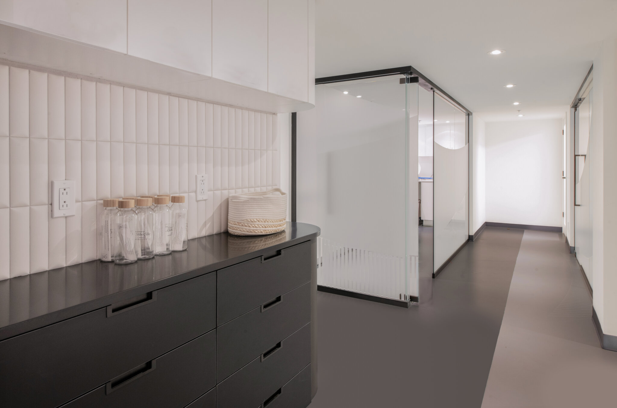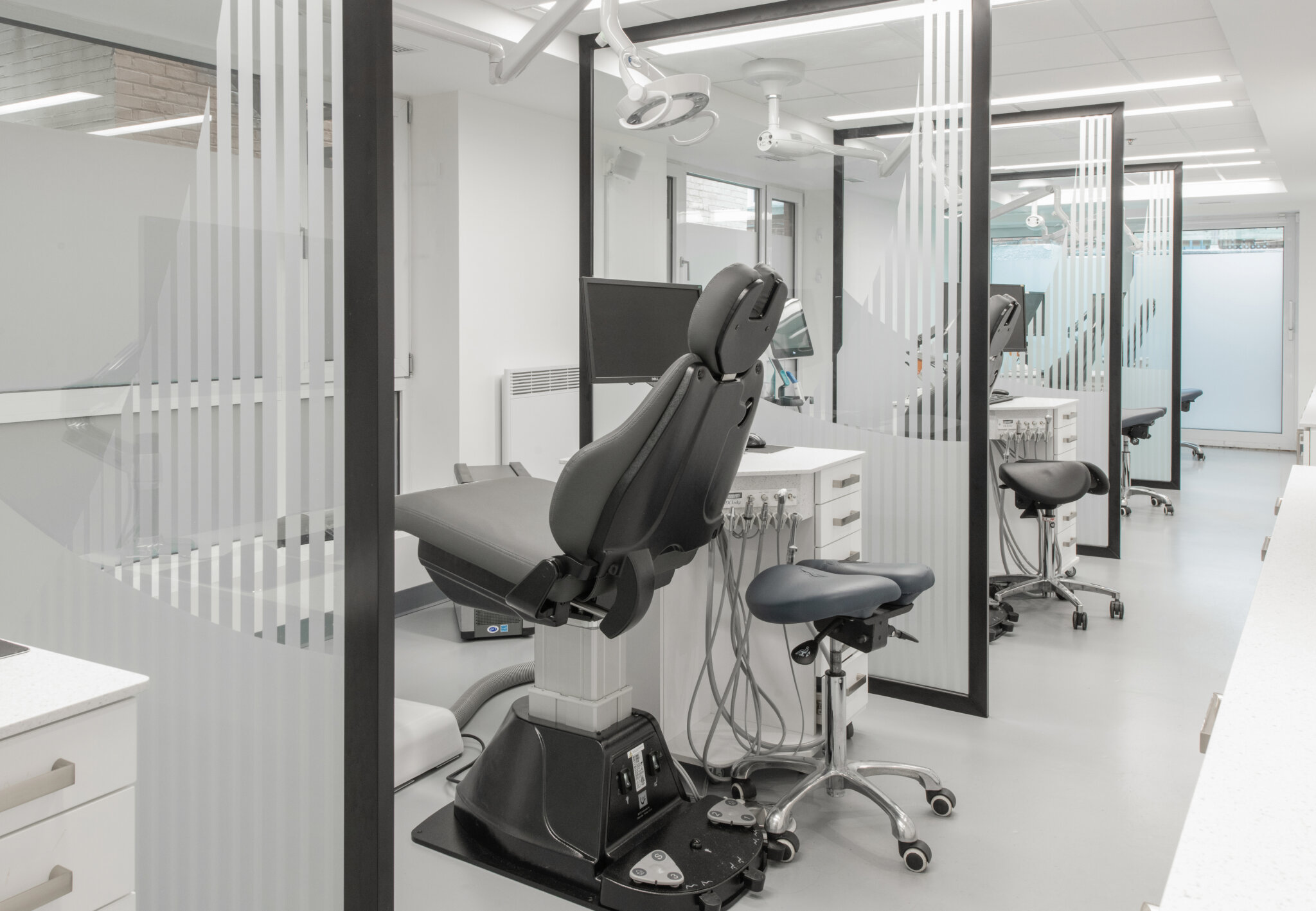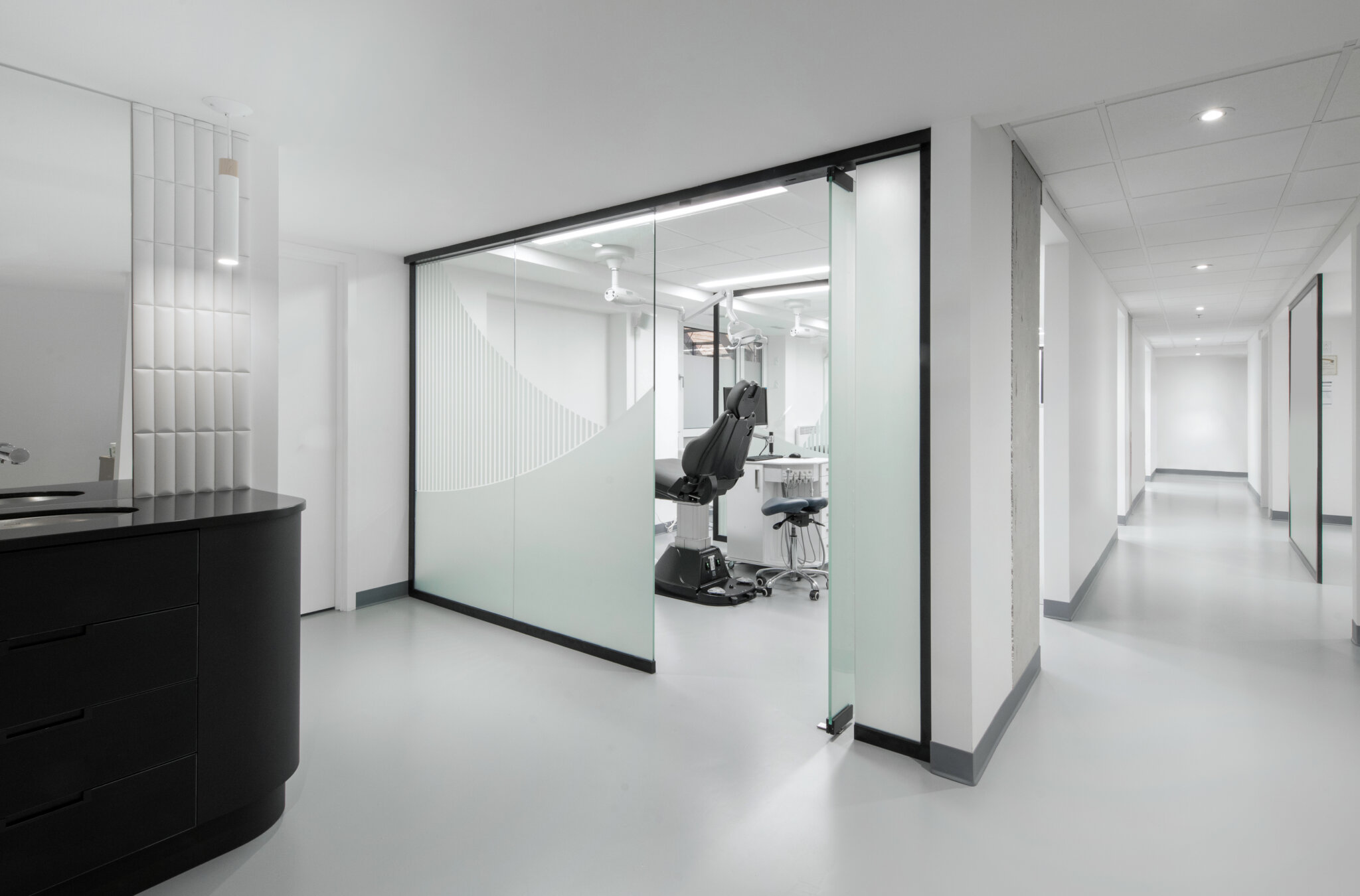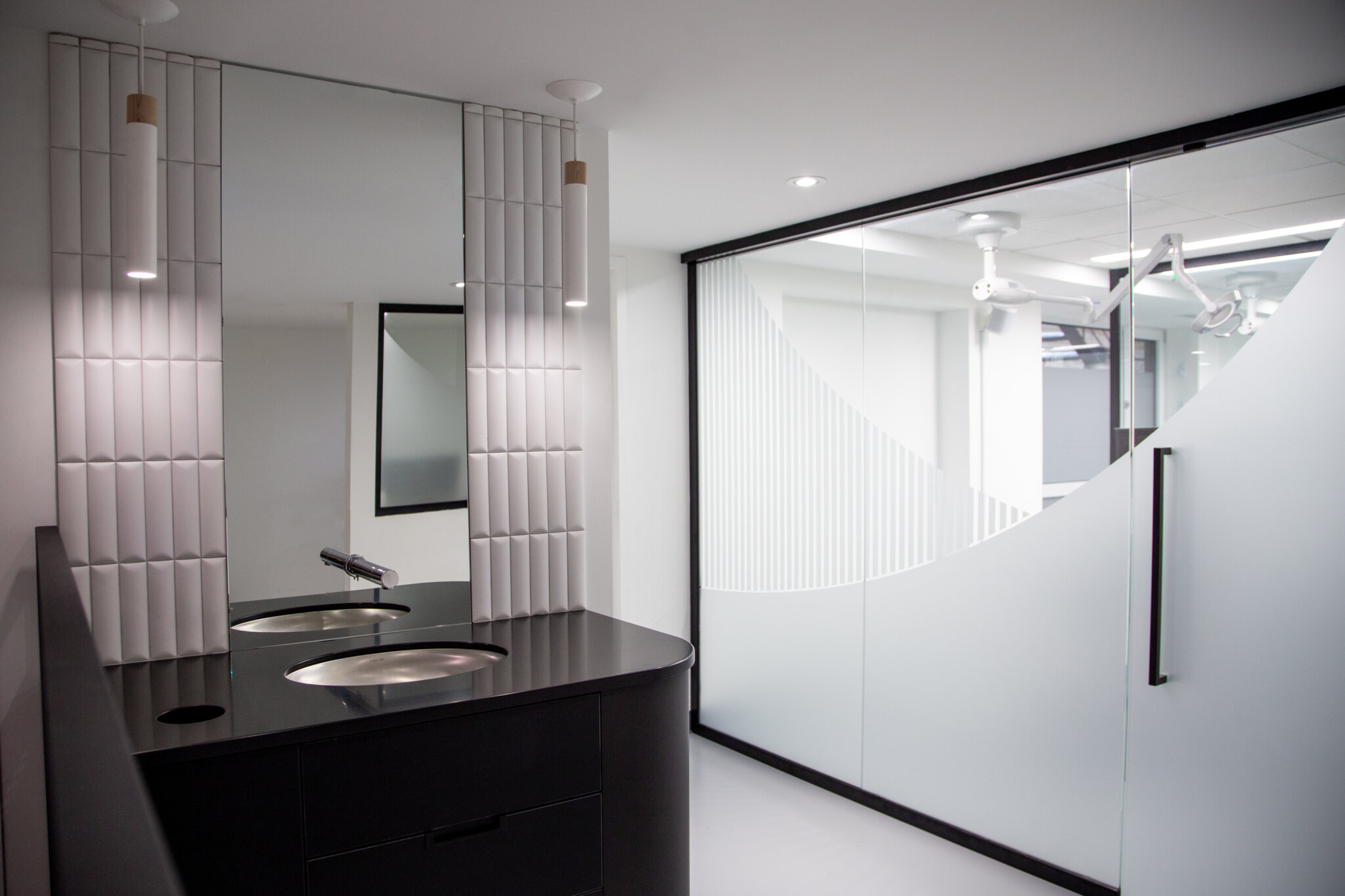 La sélection des matériaux a également été motivée dans le but de distinguer les espaces communs des espaces dentaires. Dans les zones dédiées au dentaire, on retrouve des couleurs simples et des lignes droites, afin de renforcer l’aspect d’ordre et d’hygiène. Les espaces communs, composés de l’aire de réception, de la salle d’attente et des corridors ont quant à eux pour objectif d’inspirer une sensation de confort et de bien-être aux visiteurs, par la chaleur des matières et la présente de courbes. Afin de vivre une expérience agréable, ces zones agissent comme une transition entre l’arrivée à la clinique et le passage en salle de consultation et de traitement.