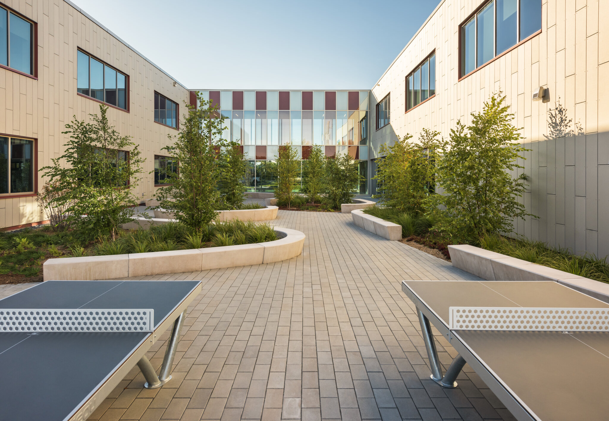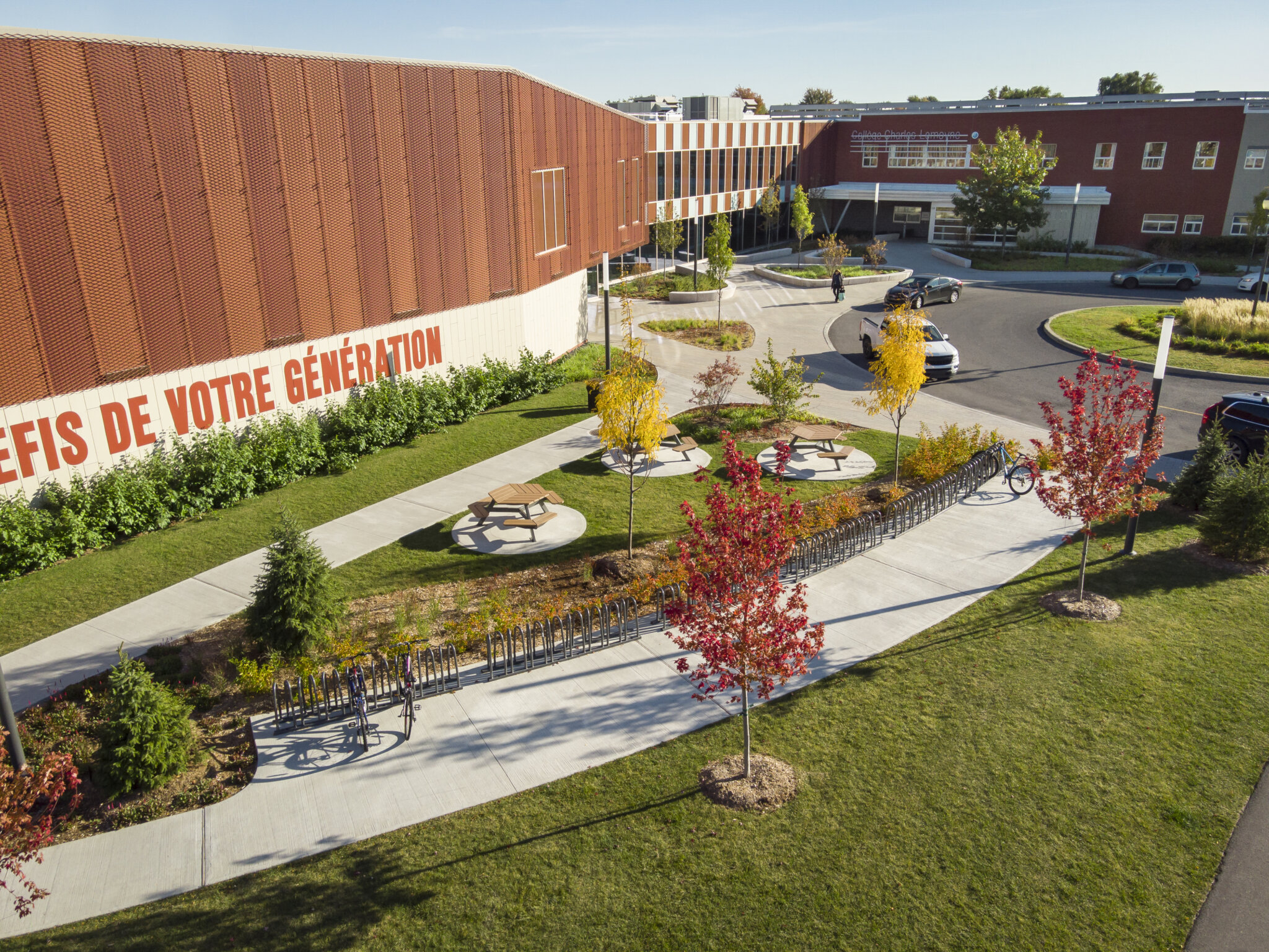 Grâce à l\’intégration de différents équipements et de mobiliers, l’aménagement offre aux étudiants un mode de vie sain et actif. L\’ajout de tables de pique-nique leur offre un espace pour se regrouper et discuter, les aidant ainsi à grandir avec un mode de vie sociale florissant. De plus, l\’implantation de supports à vélo et de mobilier d\’activités sportives comme les tables de ping-pong les incite à favoriser la pratique de l’activité physique au quotidien. En somme, ces équipements et mobiliers sont intégrés de manière à suivre le langage des formes du projet dans l’espace, créant ainsi un aménagement cohésif.