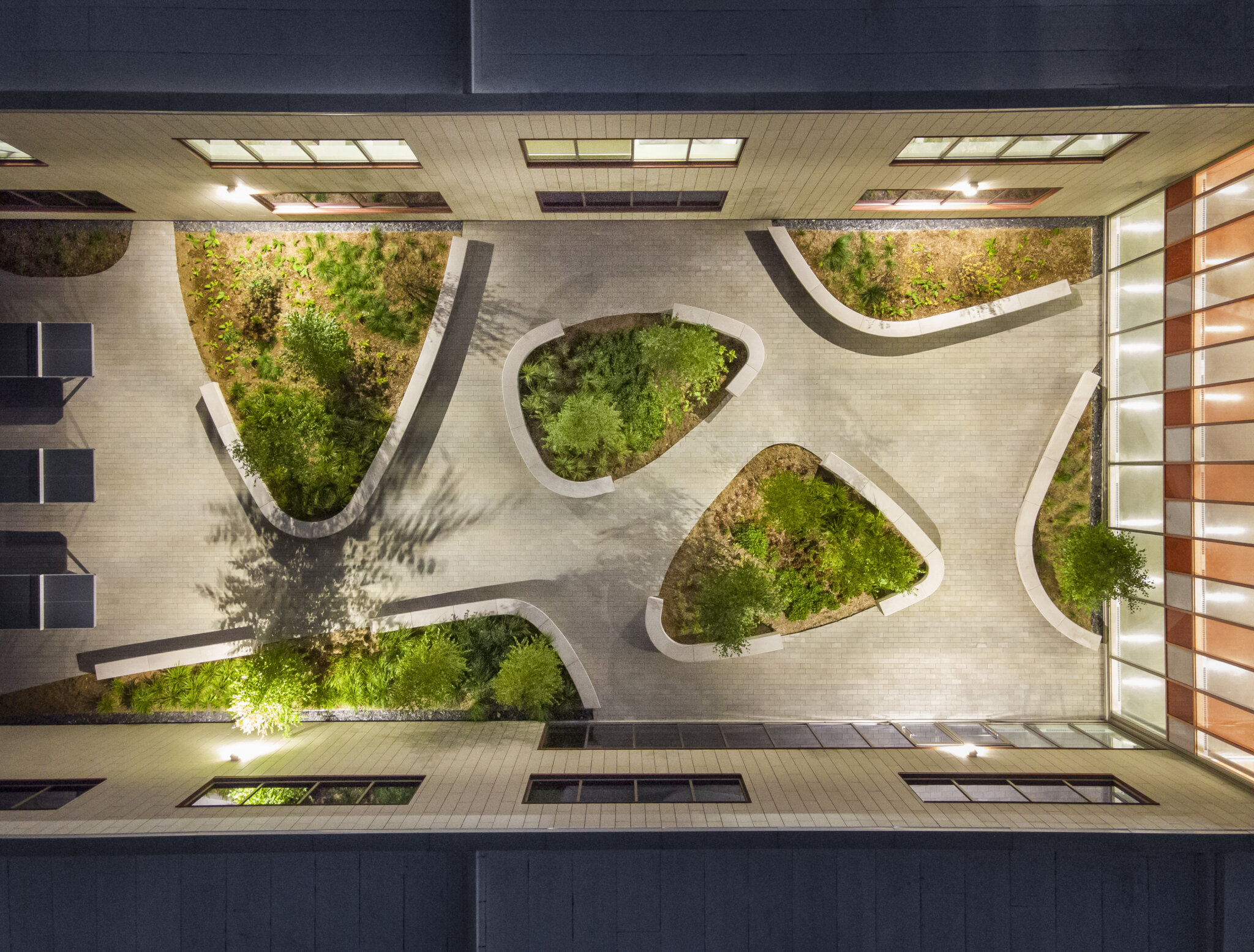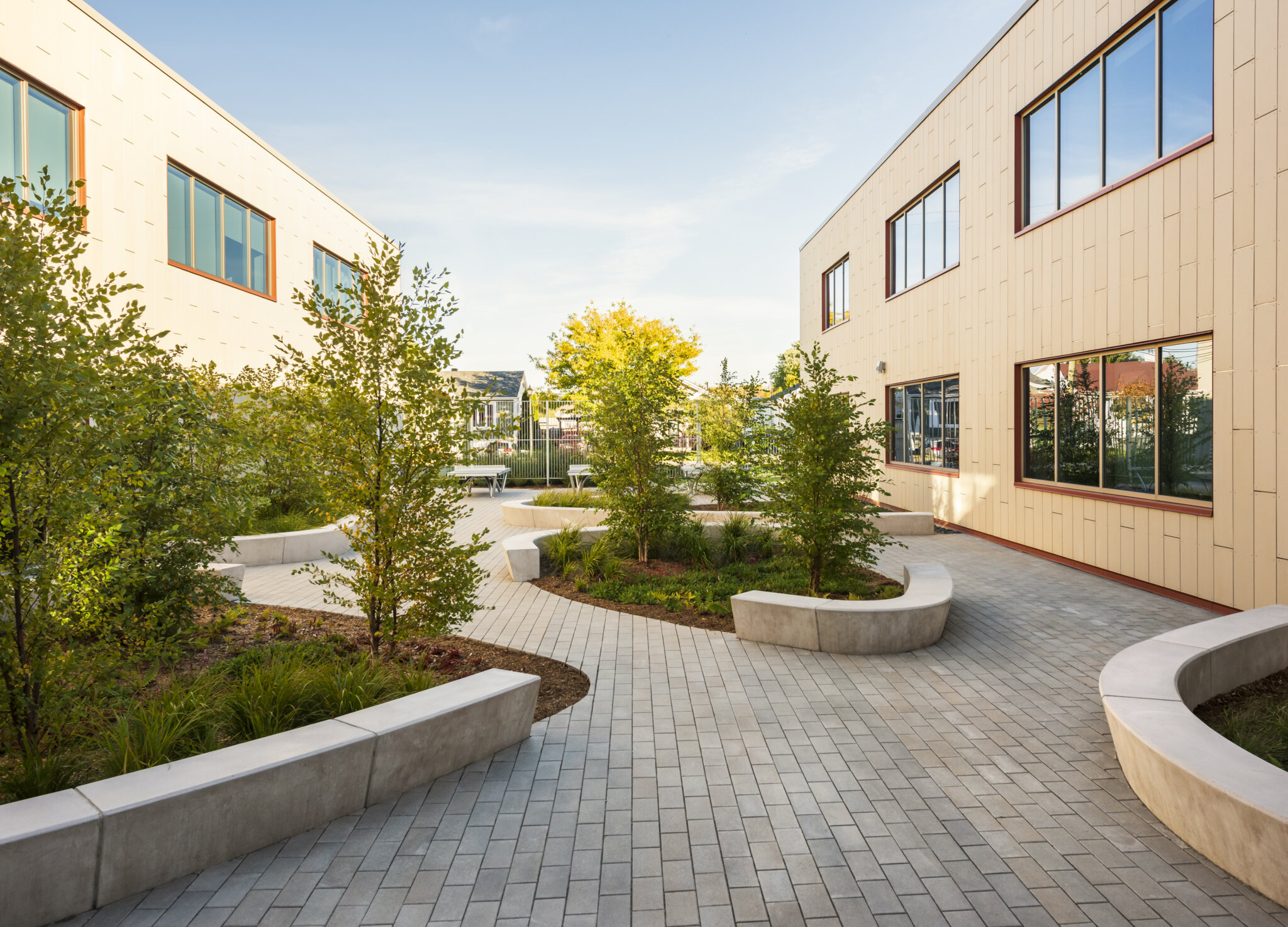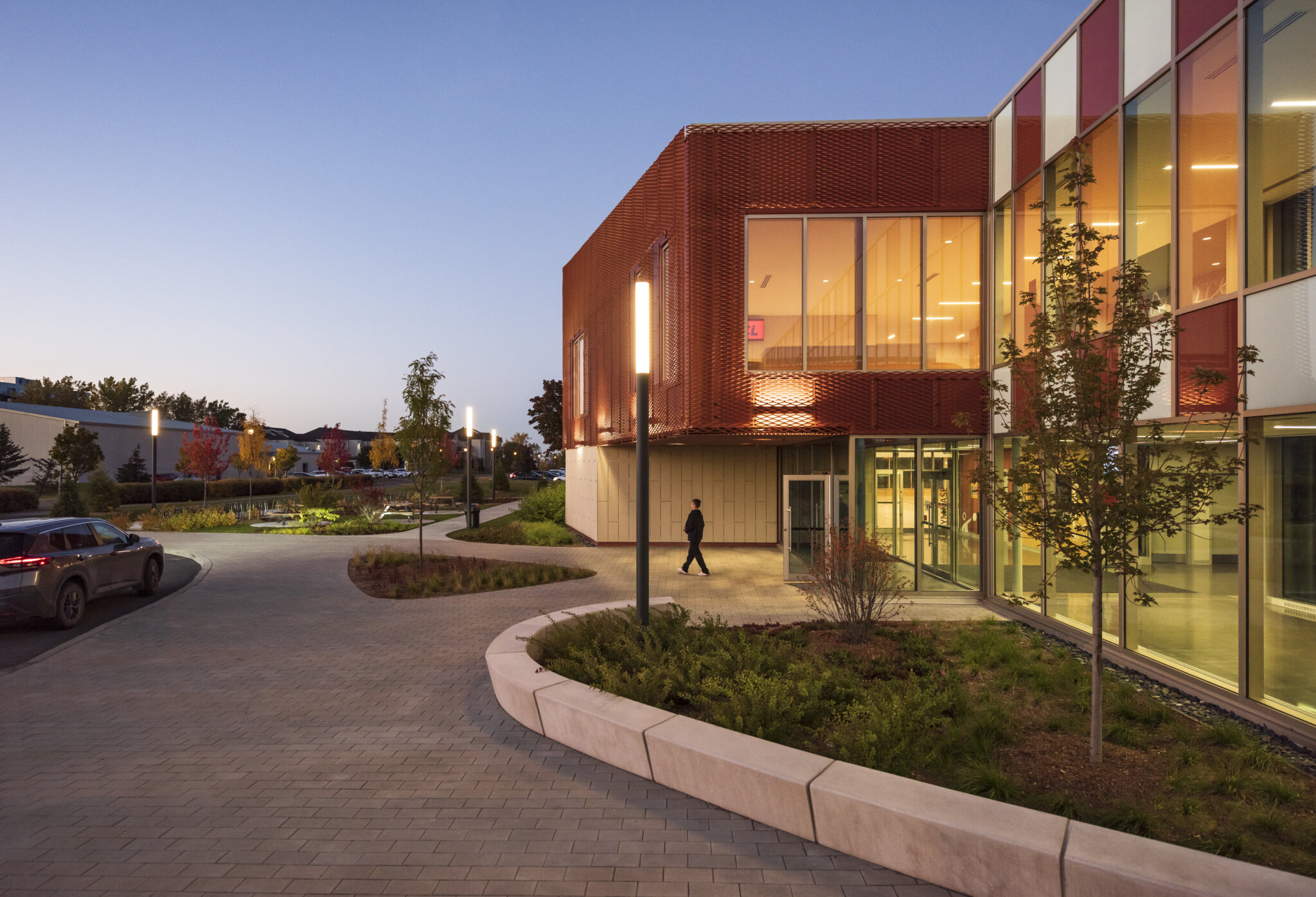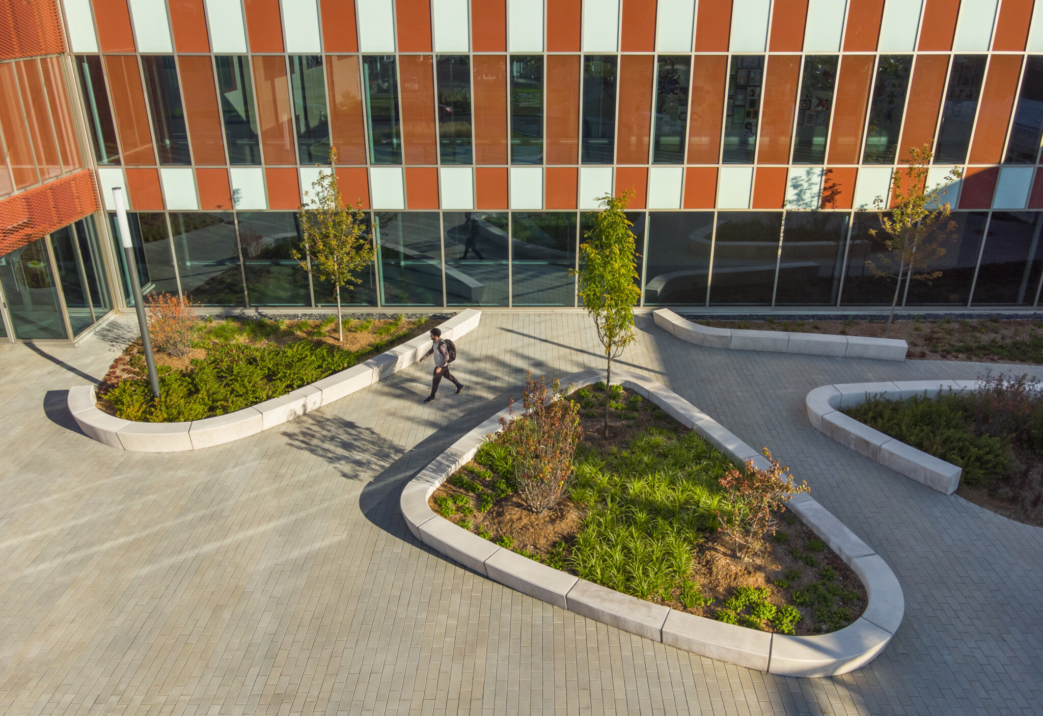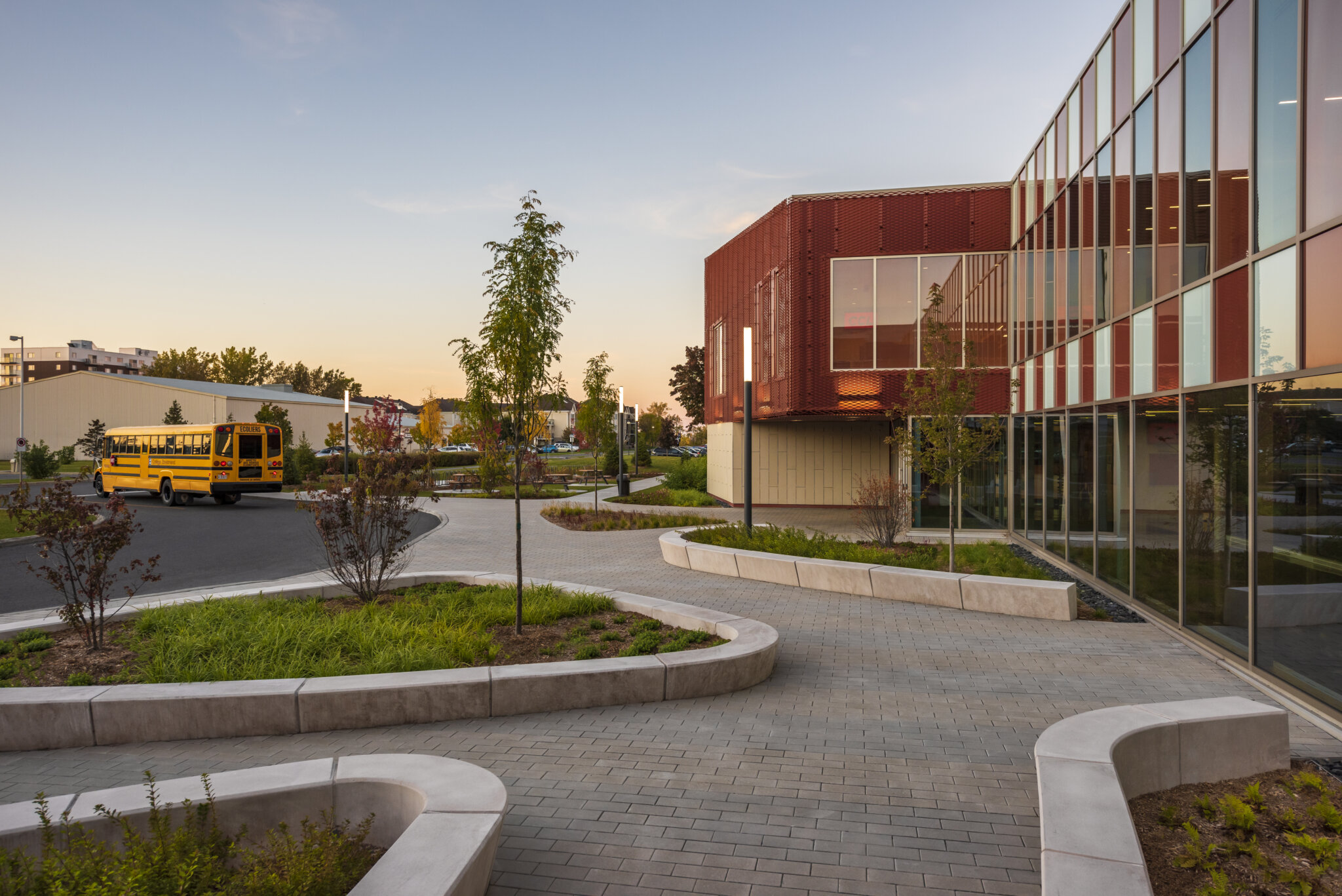 À travers les différents sous-espaces sur le site, tels que les seuils d’entrées et la cour intérieure de l’école, l’aménagement paysager se démarque par son langage des formes. Celui-ci offre une circulation fluide et naturelle pour les étudiants, tout en créant des zones pour la détente et la réflexion. Les formes triangulaires arrondies sont accentuées par des murets de béton à plusieurs fonctionnalités; places assises, bac de plantation et délimitation des espaces. La forme d’aménagement est imposée à travers les différents espaces du projet afin de créer un sens d’unité pour l’ensemble de l’école. En contraste des formes organiques, le motif de pavage impose une réflexion du langage architectural ordonné et rectiligne. Ce motif crée une harmonie avec l\’architecture de l\’école, forme une continuité visuelle entre le paysage et celle-ci et rend le passage des usagers plus rythmé et les dirige vers les points d’entrées.