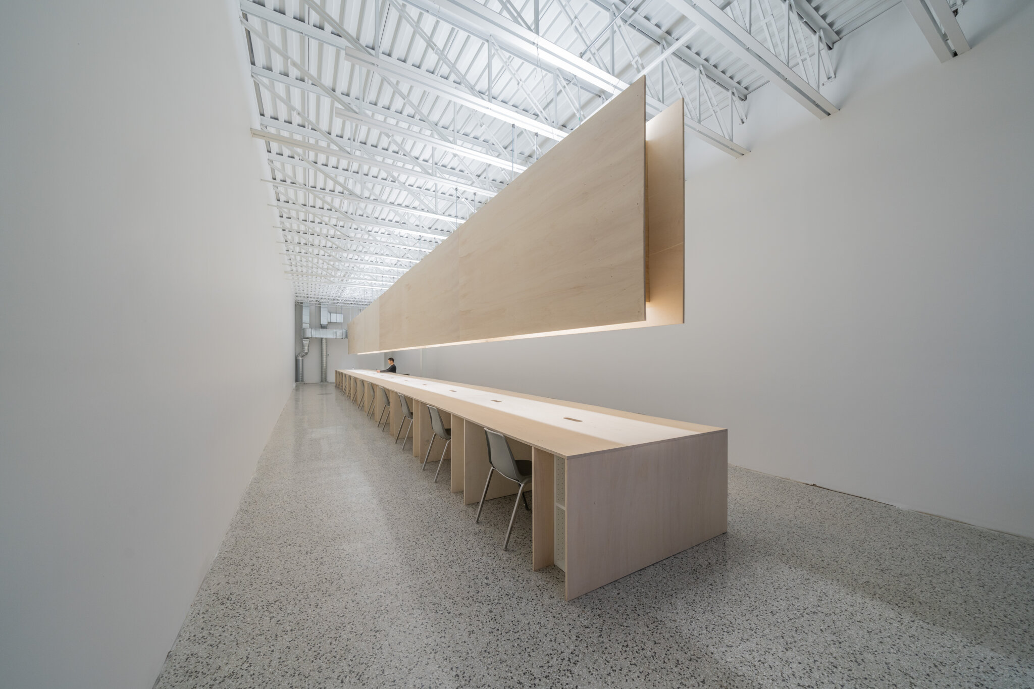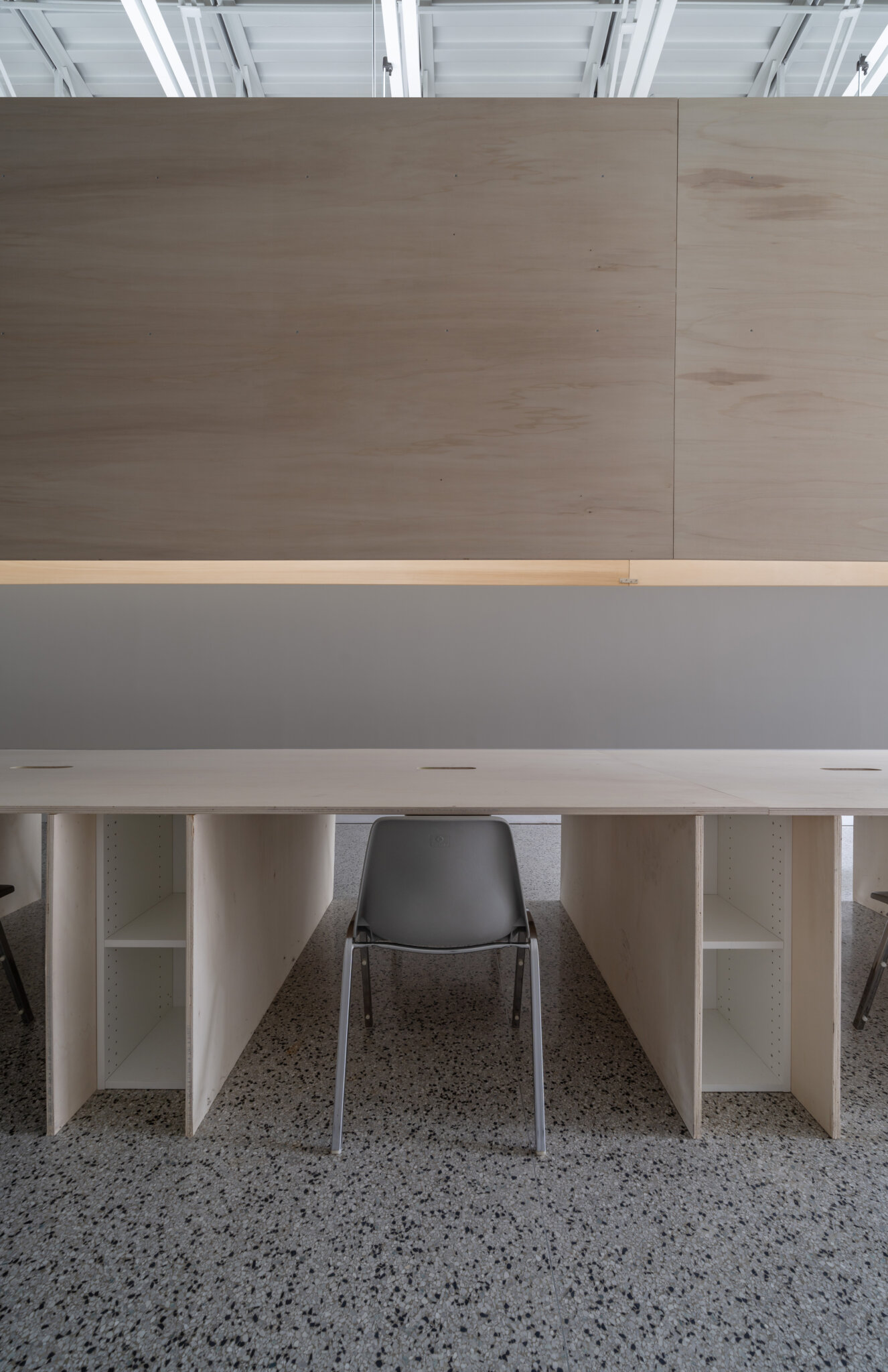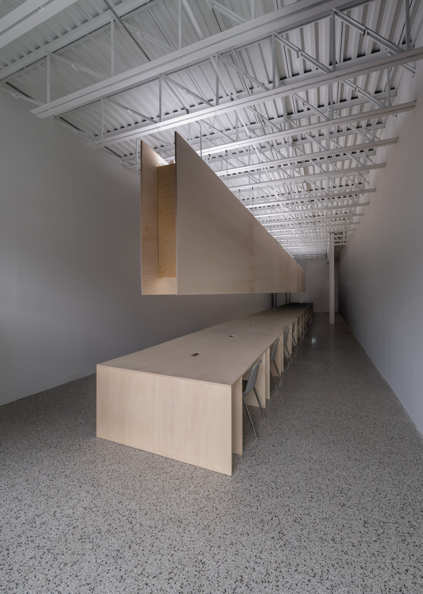 Longue de 60 pieds, cette table monumentale est constituée de panneaux de contreplaqué au format 5′ x 10′, chacun permettant quatre postes de travail de 30 » x 60 », soit vingt-quatre au total. Les appuis de ces panneaux sont assurés par de simples caissons IKEA qui permettent le rangement individuel. Les percements en leur centre autorisent le branchement d’appareils.