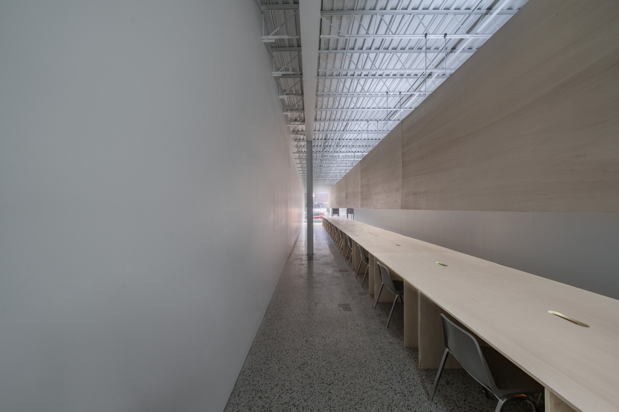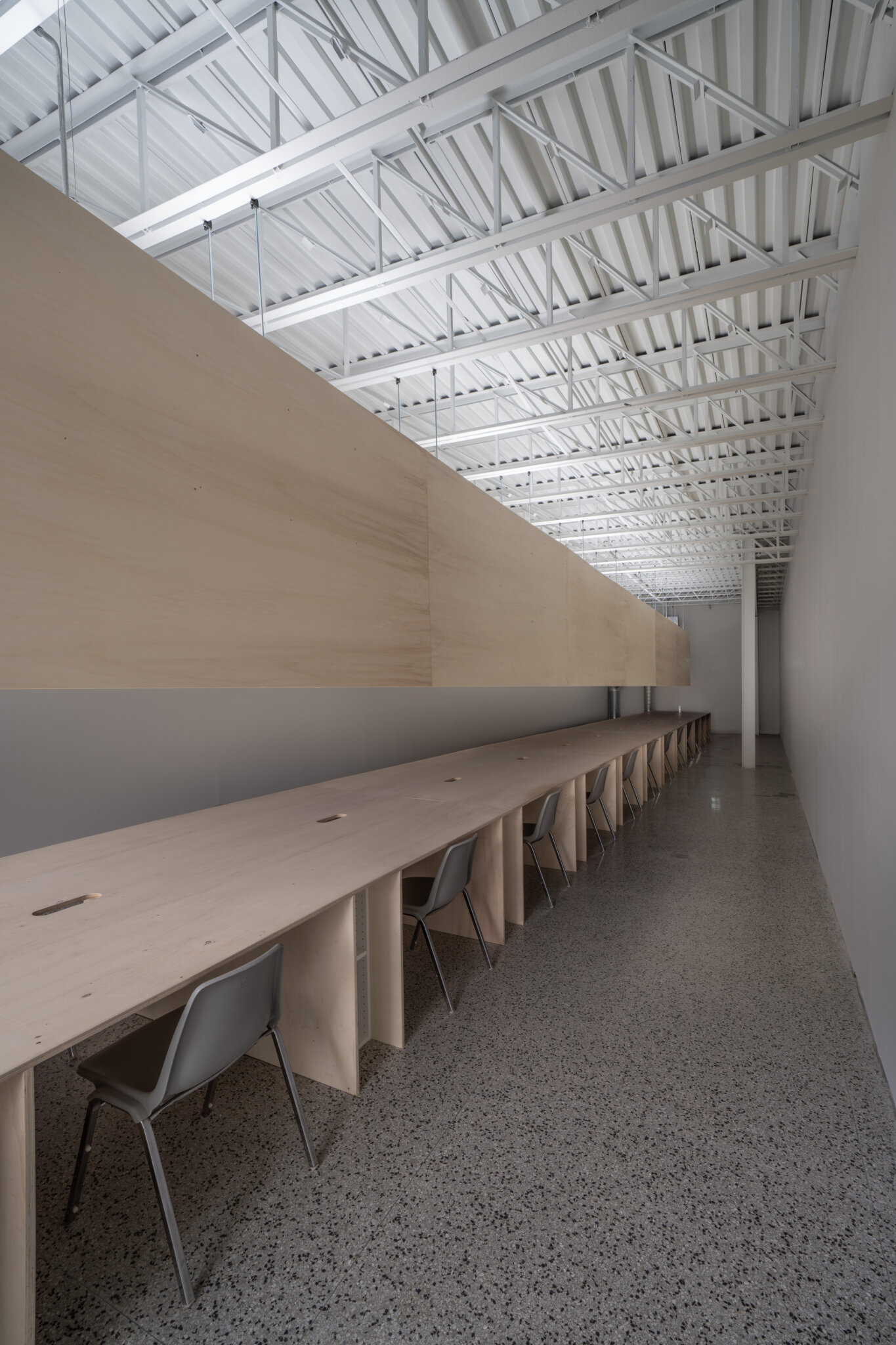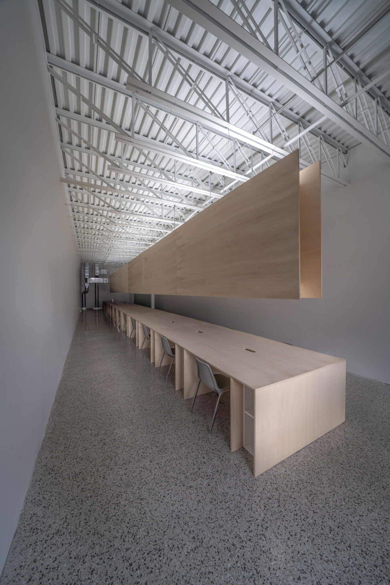 Longue de 60 pieds, cette table monumentale est constituée de panneaux de contreplaqué au format 5′ x 10′, chacun permettant quatre postes de travail de 30 » x 60 », soit vingt-quatre au total. Les appuis de ces panneaux sont assurés par de simples caissons IKEA qui permettent le rangement individuel. Les percements en leur centre autorisent le branchement d’appareils.