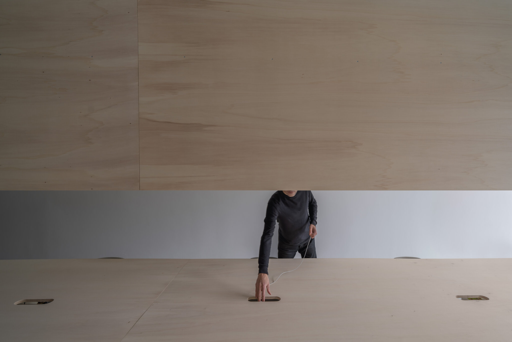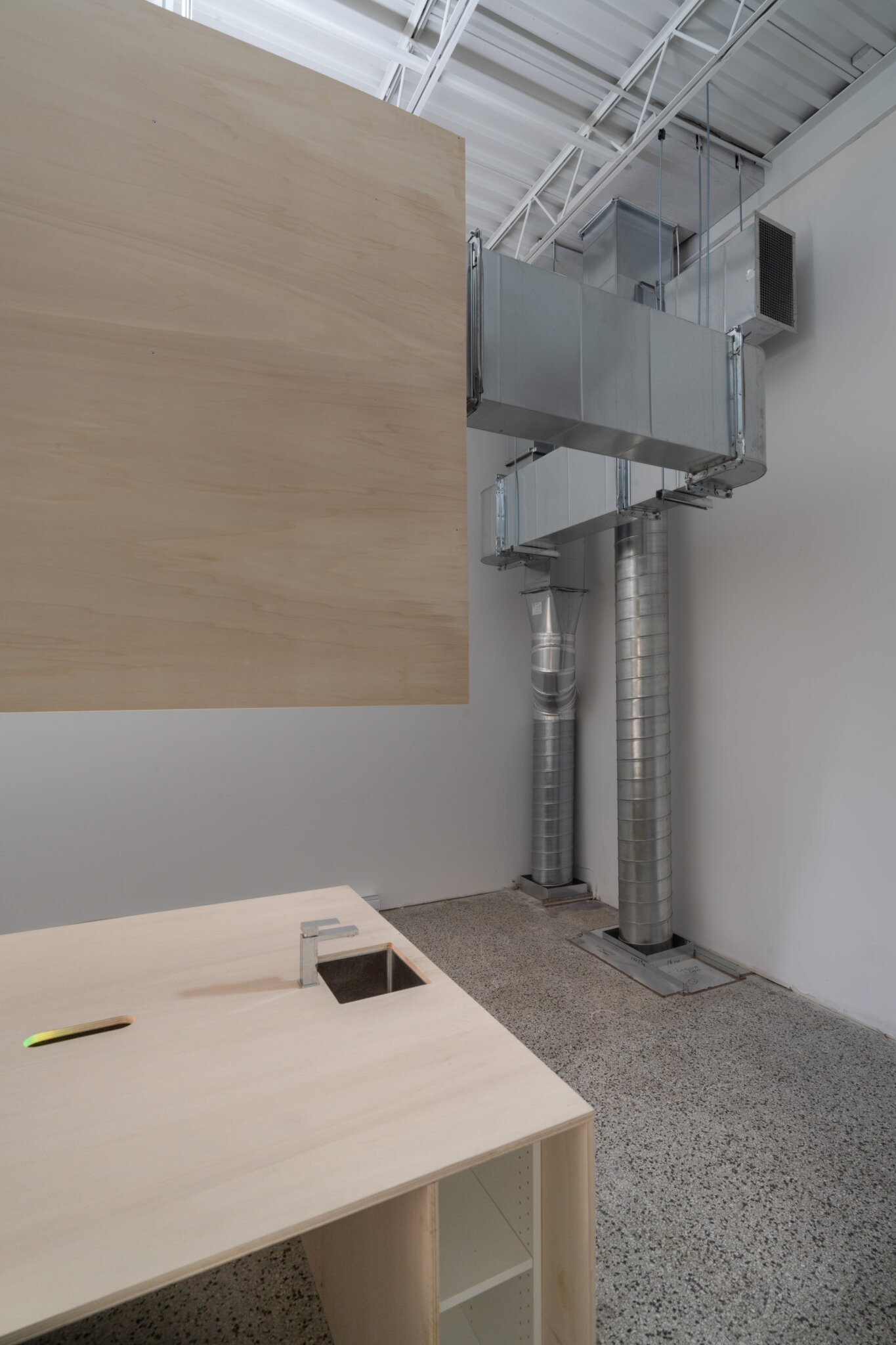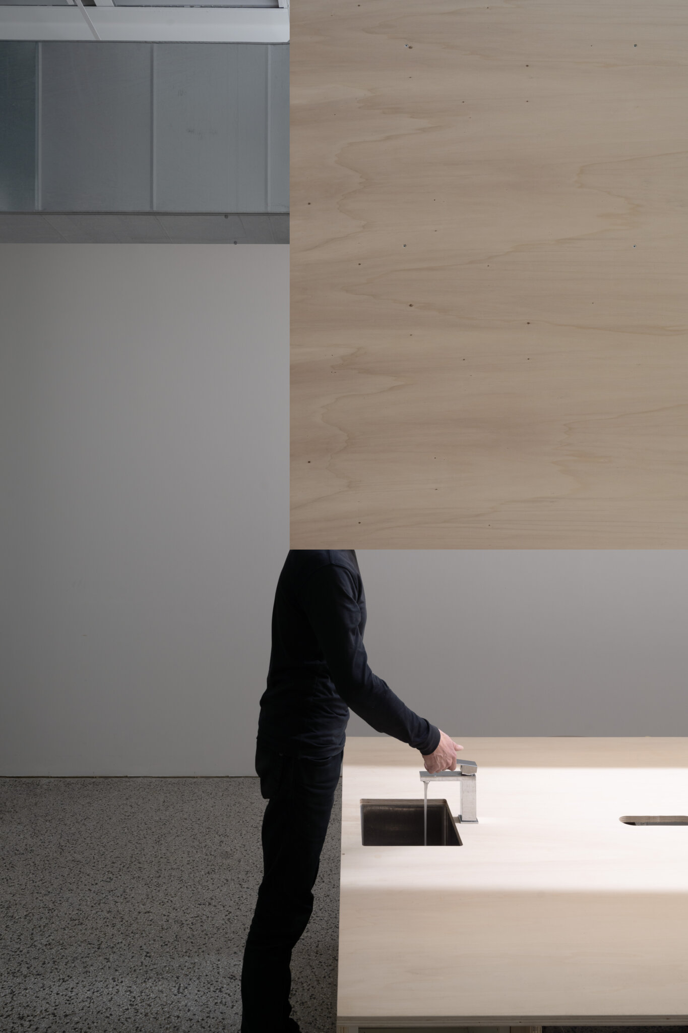 Le conduit de chauffage/ventilation de l’espace sert de fixation en ses faces inférieures et supérieures pour des bandes d’éclairage direct et indirect. Les éléments de support de la ferblanterie CVAC de type ‘Cantruss’ ont été adaptés pour accueillir deux surfaces de contreplaqué, une première de stabilisation et une deuxième de finition. Les fines tiges filetées d’ancrages et leurs ‘beamclamps’ sont exposés, tout comme les conduits sculpturaux du fond de l’espace, oeuvre de l’ingénieur en chauffage/ventilation. Les mêmes panneaux de contreplaqué que pour la table sont utilisés, alignés, il va de soi avec celle-ci.