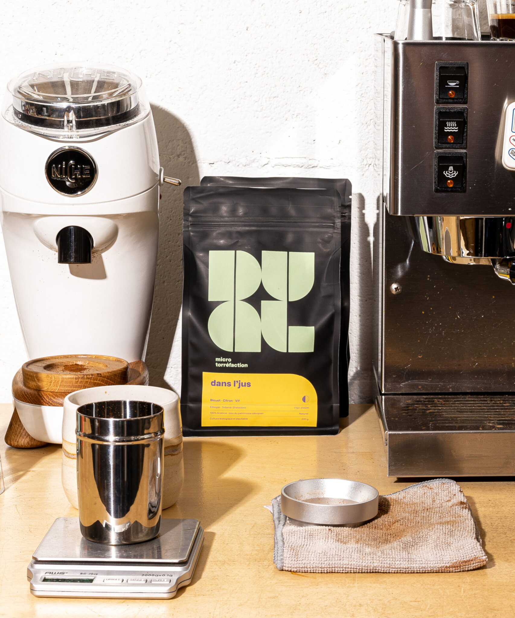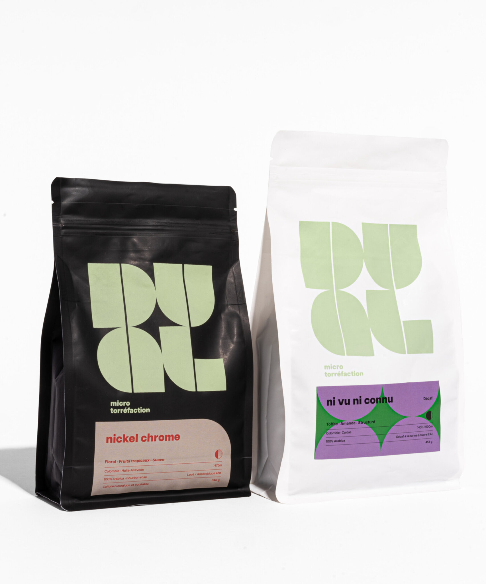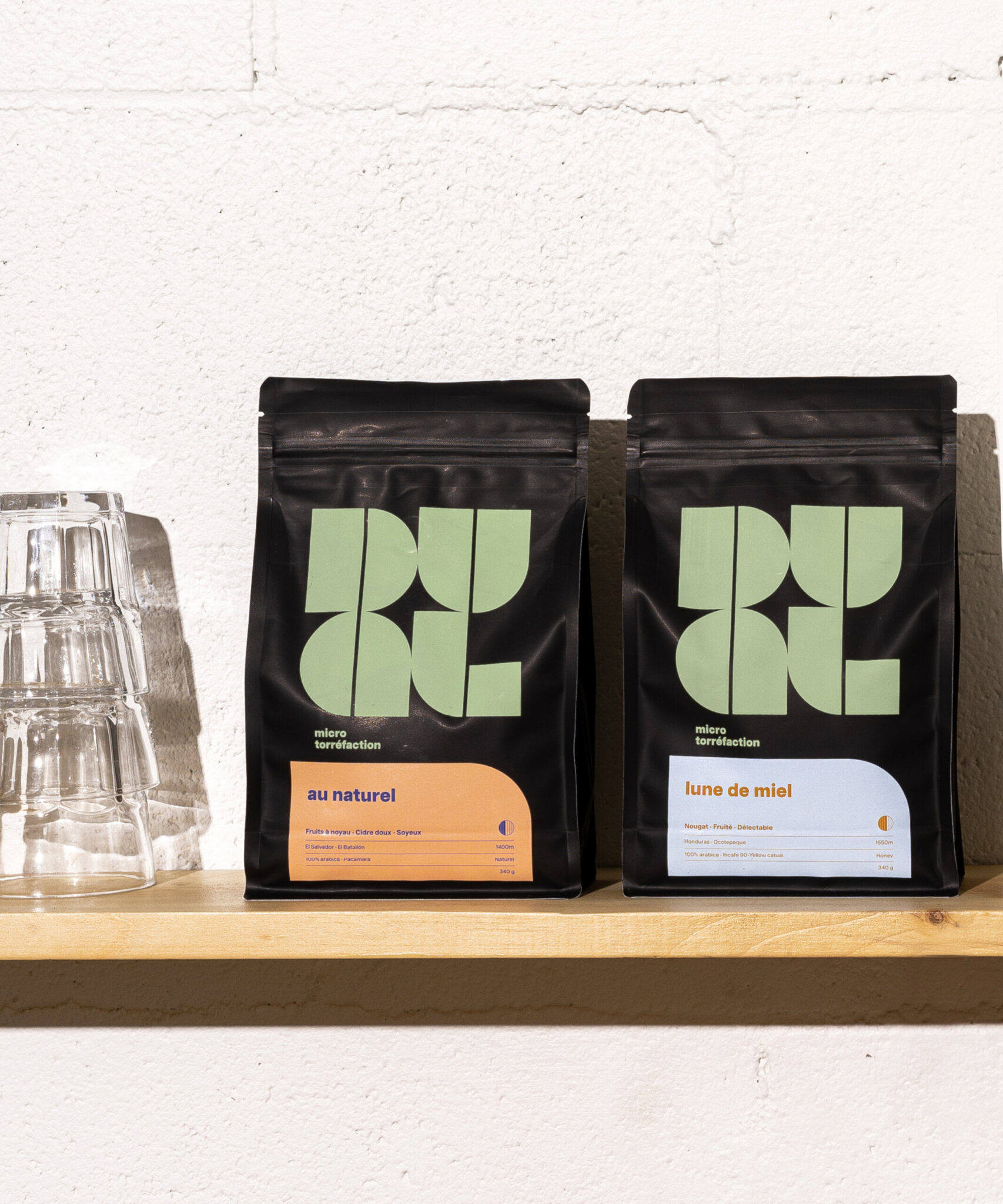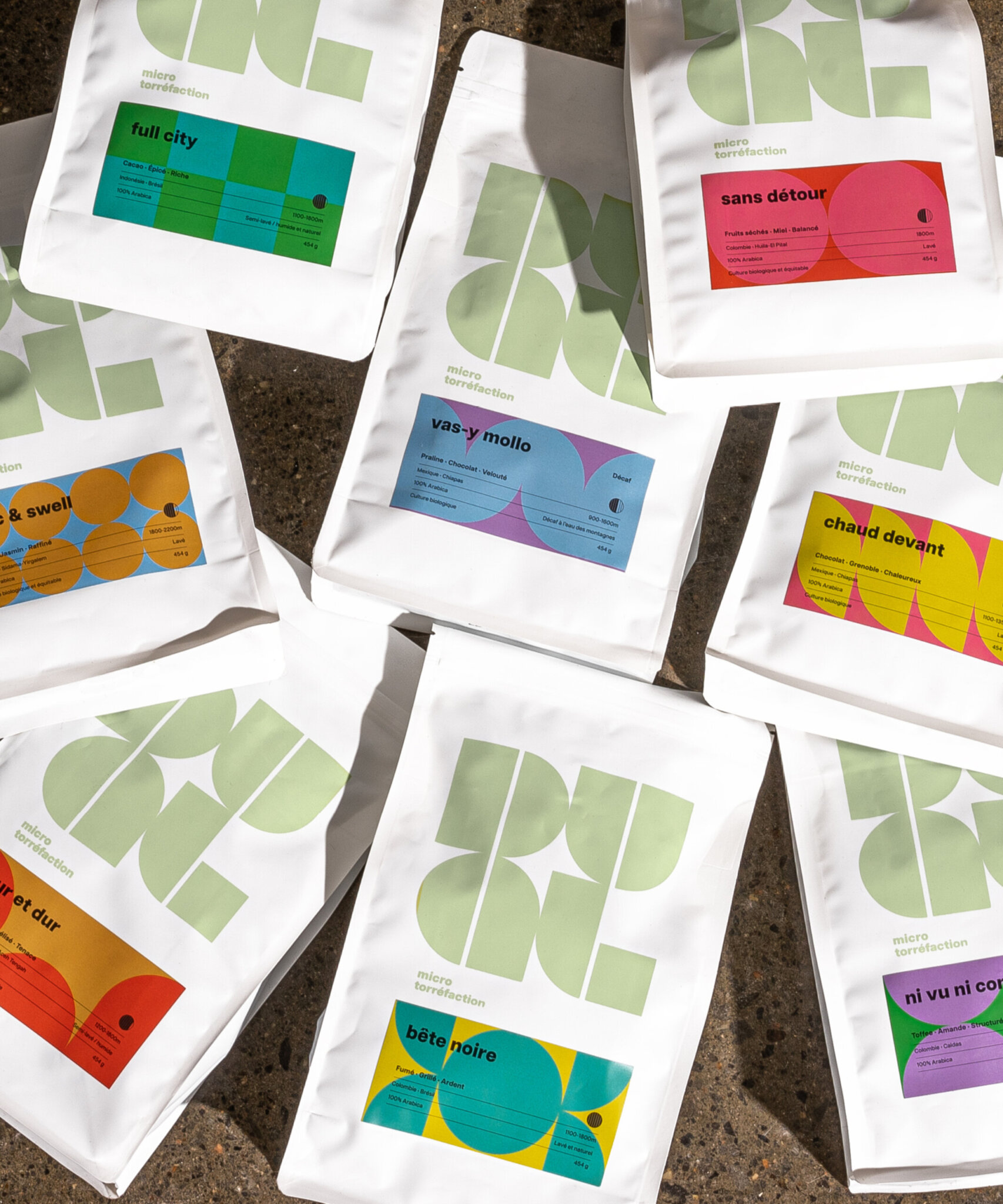 L’objectif était de représenter la dualité dans tous les éléments du branding, autant par les formes, les couleurs, la direction photo, les noms des cafés. Les étiquettes, toutes uniques, reprennent le langage formel du logo dans des jeux graphiques inspirés des noms des cafés, et présentent des agencements de couleurs contrastants.