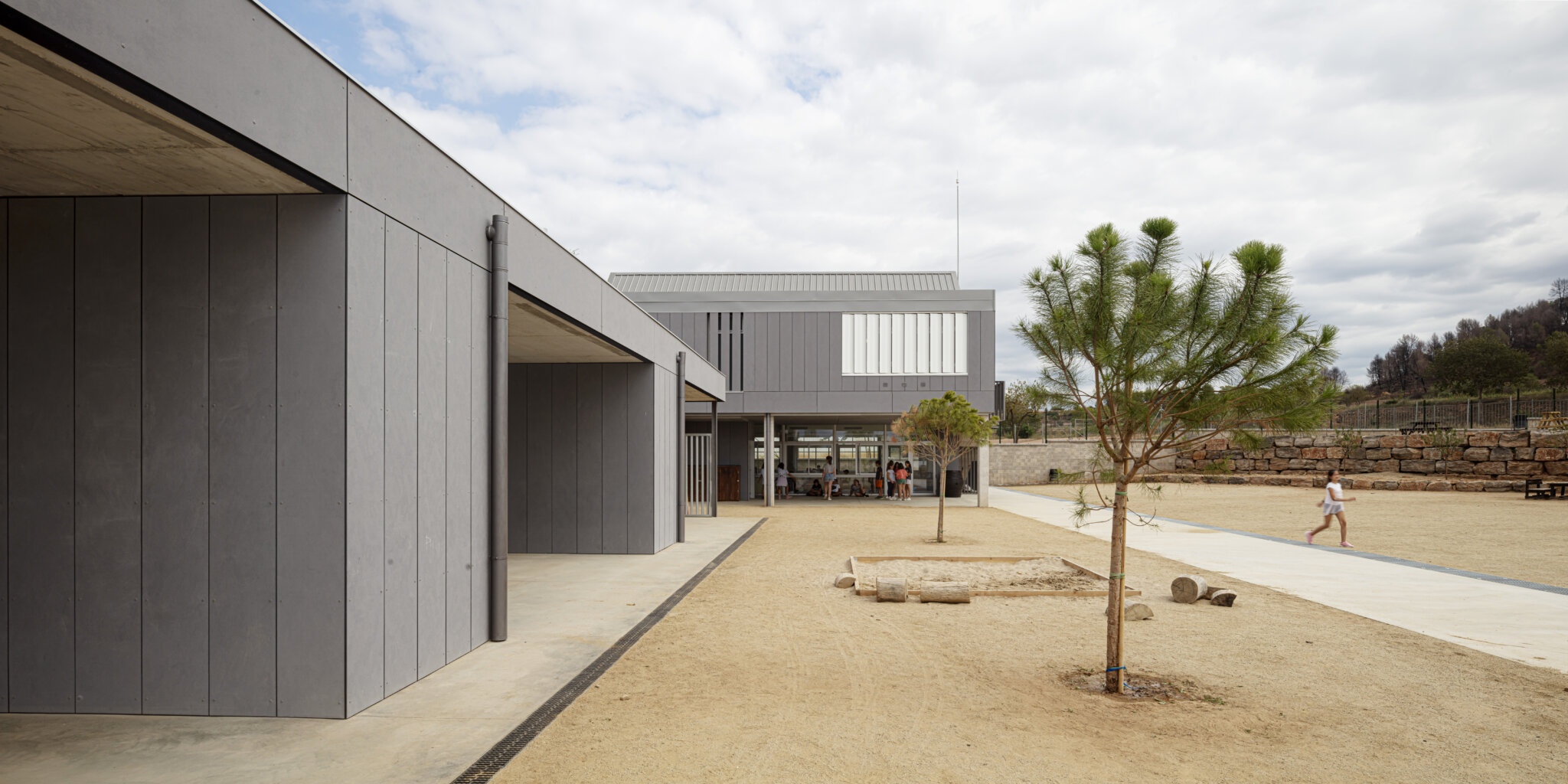 Il s’agit d’un complexe de près de 2000 m2 de surface, articulé en deux volumes reliés par un passage central. Son emplacement sur la limite nord du terrain a été choisi pour donner continuité à la partie construite du village, laissant le reste du site libre vers le sud et le paysage rural. Les deux volumes ont des hauteurs différentes d’un et deux étages chacun. Le plus haut abrite les espaces de l’école primaire, tandis que l’autre la maternelle. La désarticulation volumétrique permet au tout de s’intégrer à l’échelle du village, en évitant la formation d’une longue façade continue vers le nord, tout en prenant en compte que le complexe sera agrandi dans une deuxième phase avec un nouveau gymnase sur cette même façade.